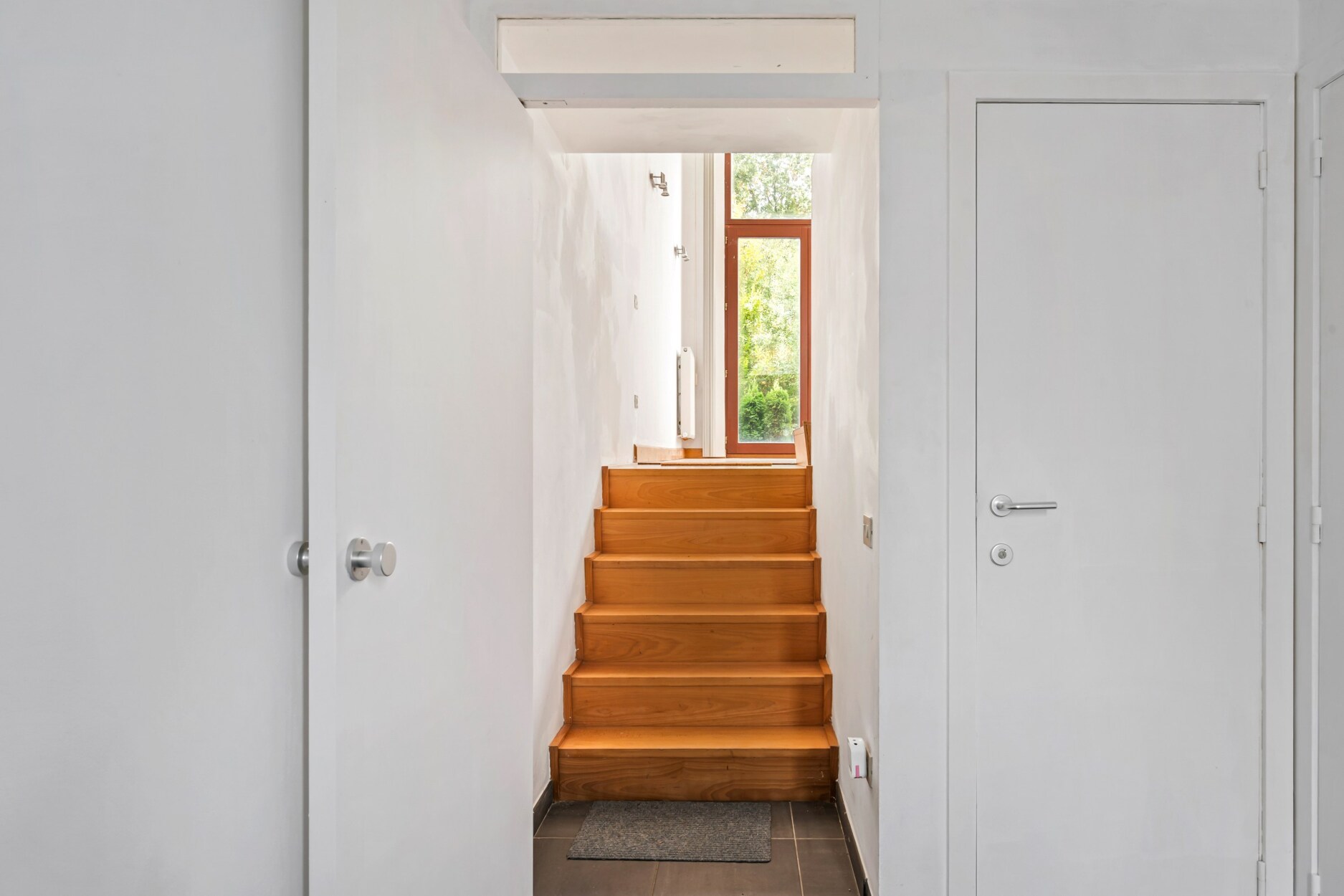 Vervolgens, lichtrijke leefruimte dankzij de hoge raampartijen en schuifdeur, met zich op de west-georiënteerde tuin. Op het split-level gedeelte bevindt zich de open keuken, met eethoek en aparte berging, aansluiting voor wasmachine en droogkast is hier voorzien.