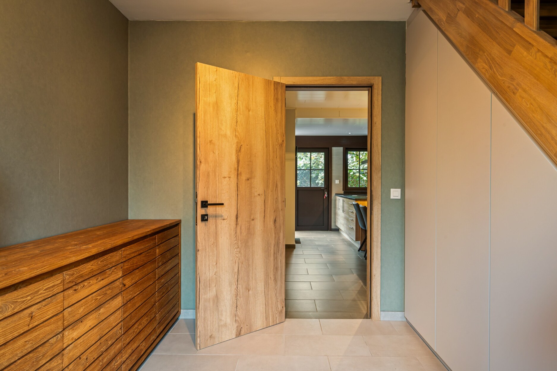 De hal met massieve trap beschikt over ingebouwde kasten die zorgen voor extra opbergruimte en een verzorgde uitstraling.