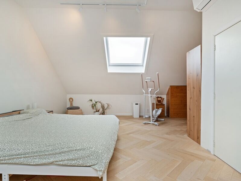 De tweede verdieping herbergt de master bedroom (20 m²), afgewerkt met stijlvol visgraatparket, airconditioning, elektrische rolluiken en nieuwe dakramen (2024). Vanuit hier heb je toegang tot een kleine bergzolder.