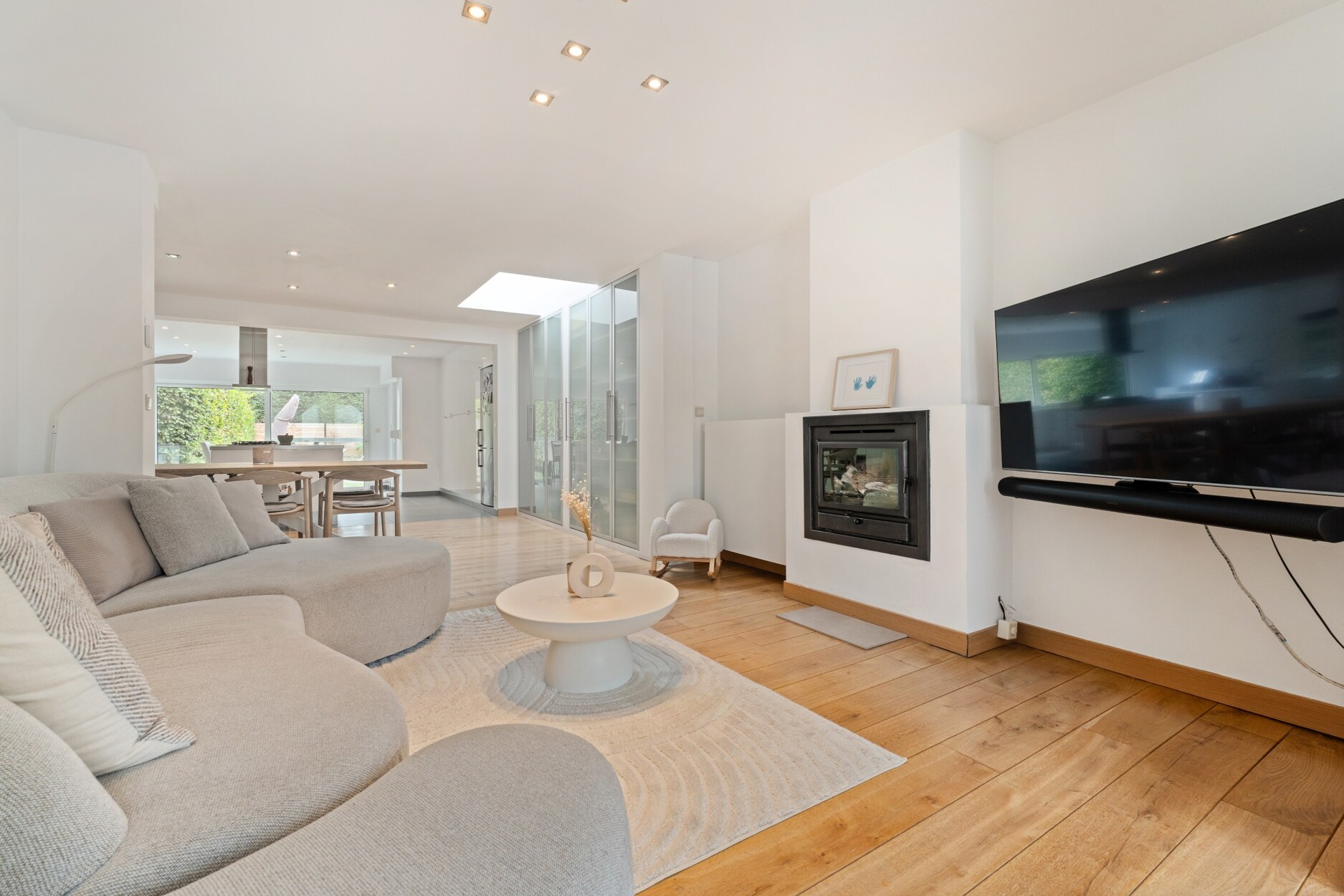 Bij het binnenkomen via de stijlvolle inkomhal met gastentoilet, word je meteen verrast door de indrukwekkende leefruimte van ca. 85 m² met parketvloer, open haard en op maat gemaakte kasten. De grote raampartijen en lichtkoepel zorgen voor een overvloed aan natuurlijk licht. De volledig ingerichte keuken, uitgerust met een vijf-pits gasfornuis en talrijke ingebouwde kasten, biedt zicht op de tuin en het terras – ideaal voor gezellige familiemomenten en etentjes met vrienden.