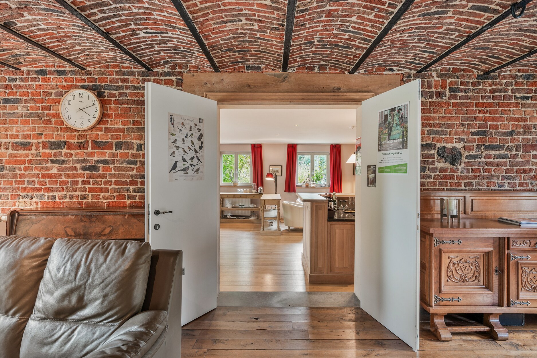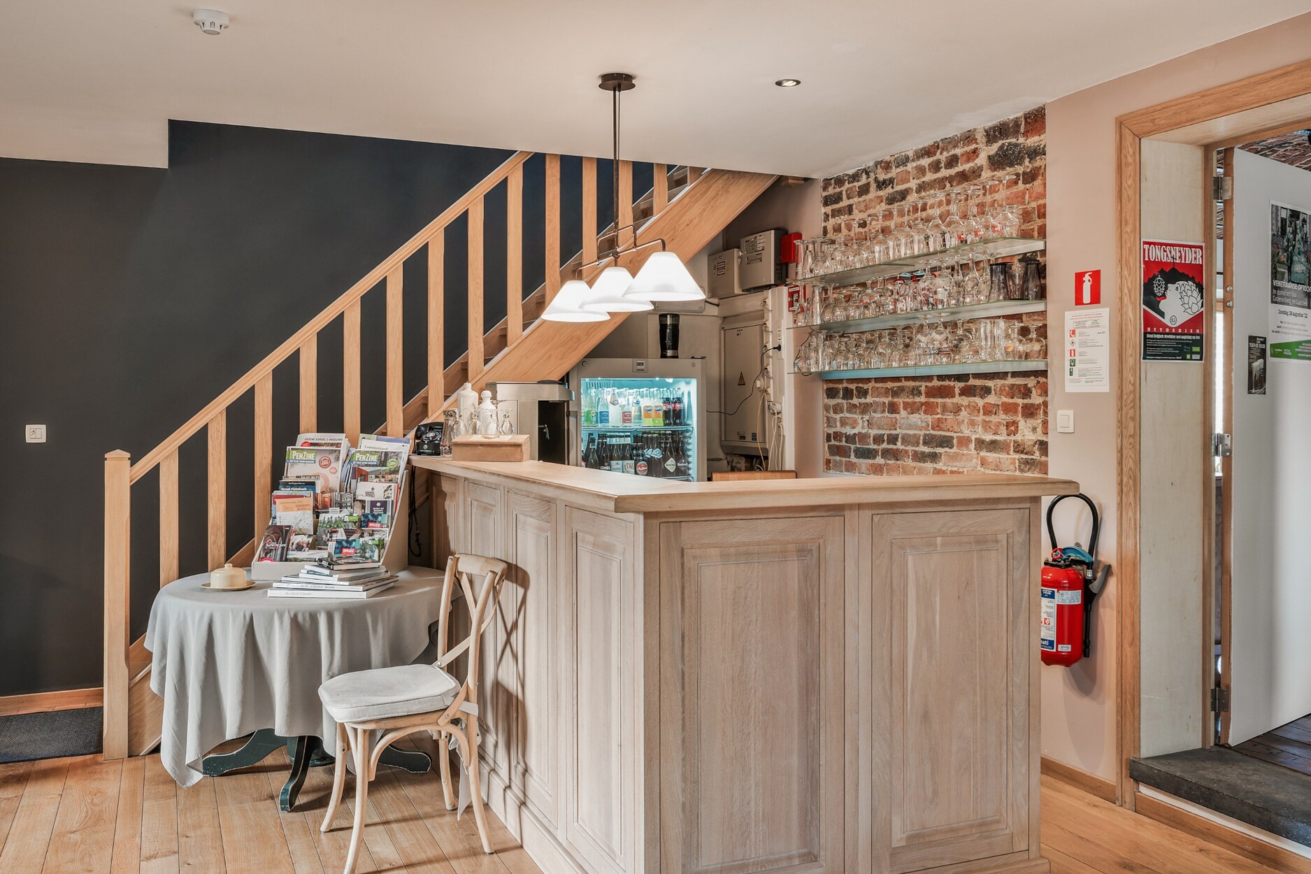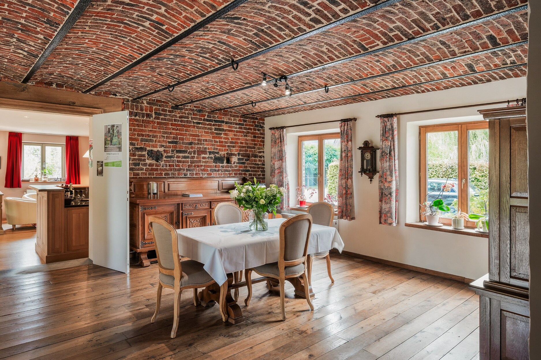 Bij het binnenkomen van de woning word je verwelkomd in een ruime inkomhal met gastentoilet en vestiairekast. Vanuit hier heb je toegang tot een slaapkamer met ensuite badkamer, de leefruimte en de keuken. De keuken sluit aan op een praktische wasplaats, vanwaar je ook toegang hebt tot de kelder. De leefruimte loopt door in een gezellige eetplaats, die momenteel dienstdoet als ontbijtruimte voor gasten. Deze ruimte is voorzien van een bar en een zithoek, en vormt het sociale hart van de woning.