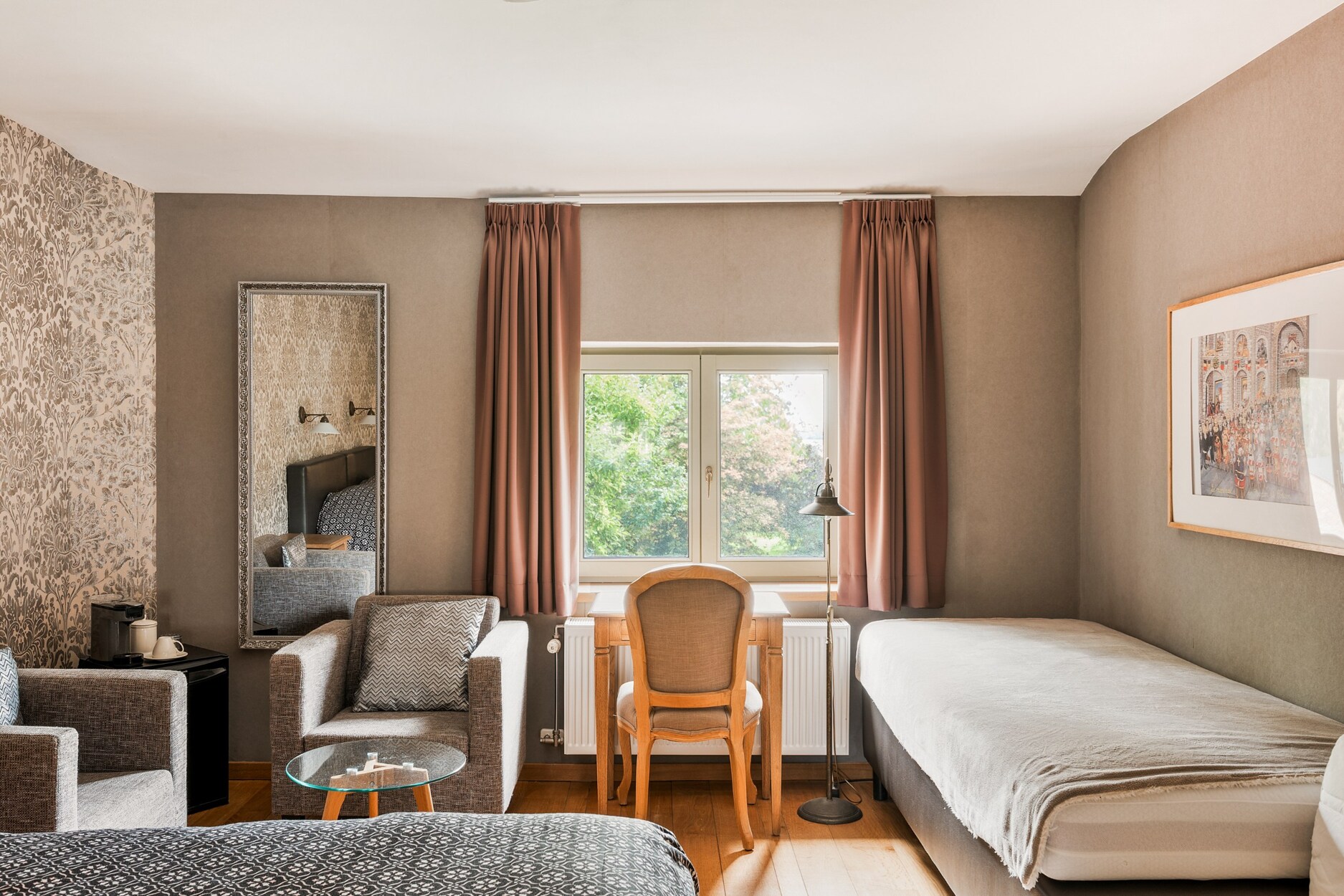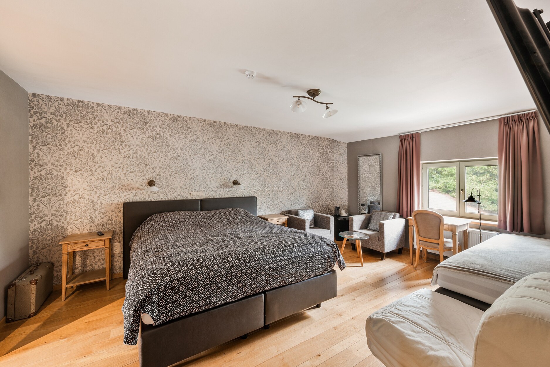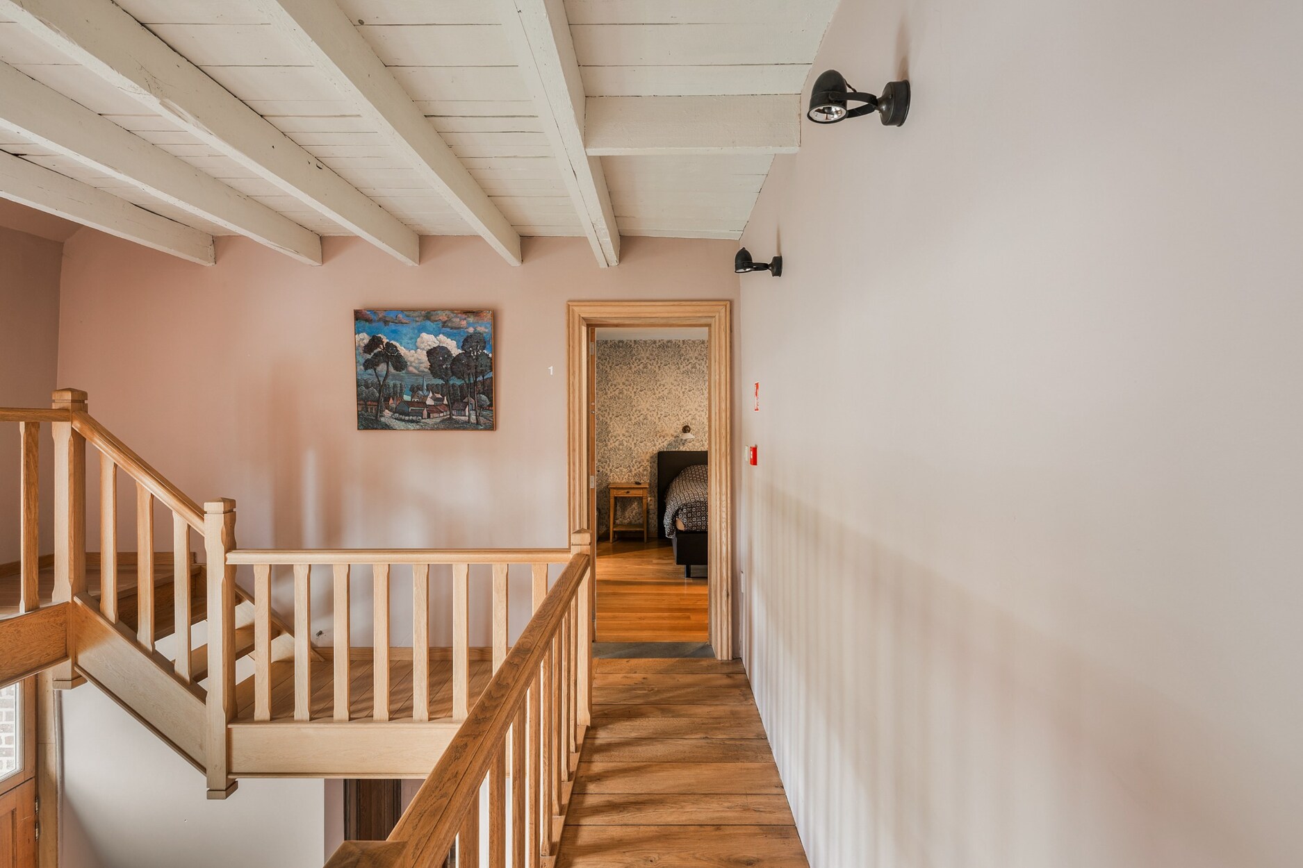 Vanuit deze gastenzone leidt een trap naar het gastenverblijf op de eerste verdieping. Hier bevinden zich vier comfortabele kamers, elk met een eigen ensuite badkamer. Op de tweede verdieping zijn er nog twee kamers, een aparte badkamer en een ruime polyvalente kamer die tal van mogelijkheden biedt, van extra slaapkamer tot hobbyruimte of bureau.