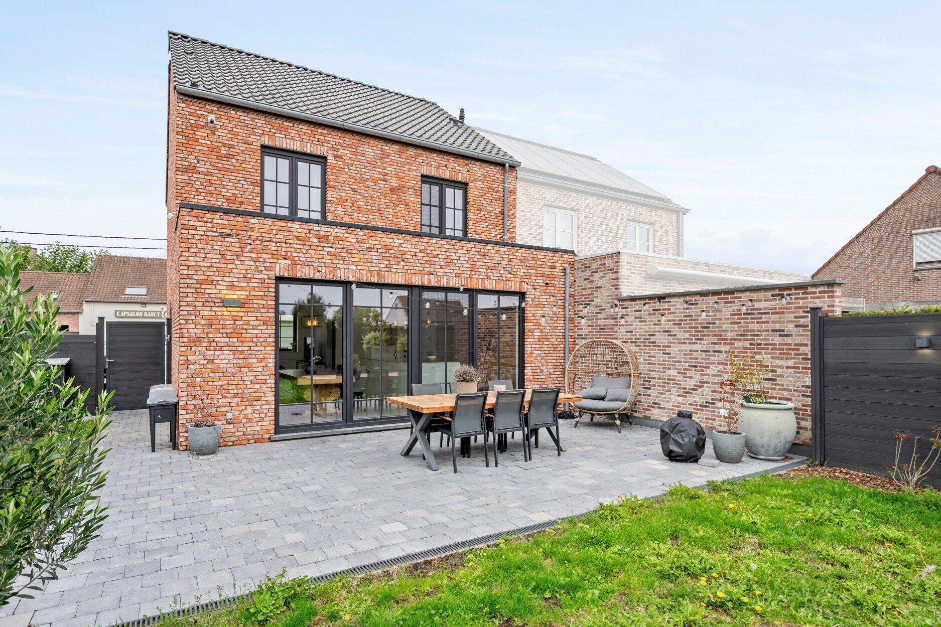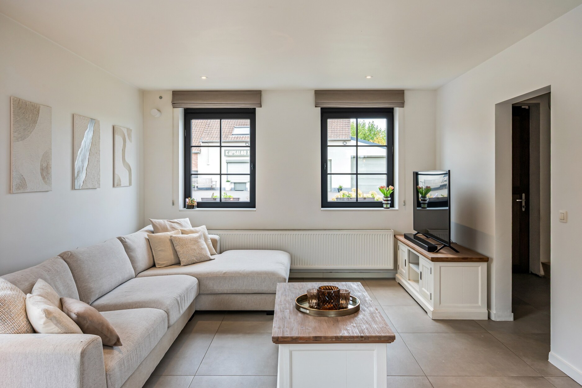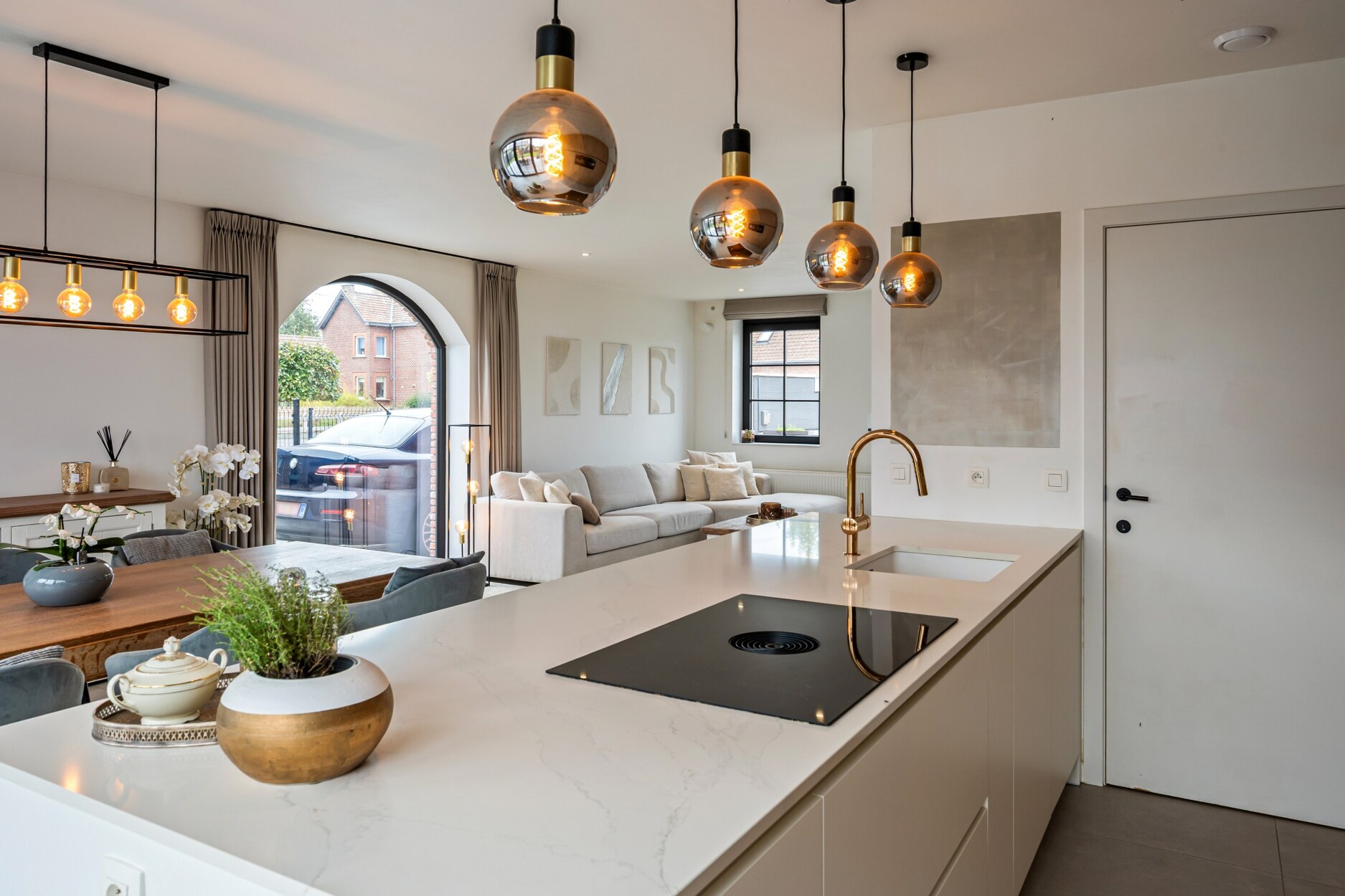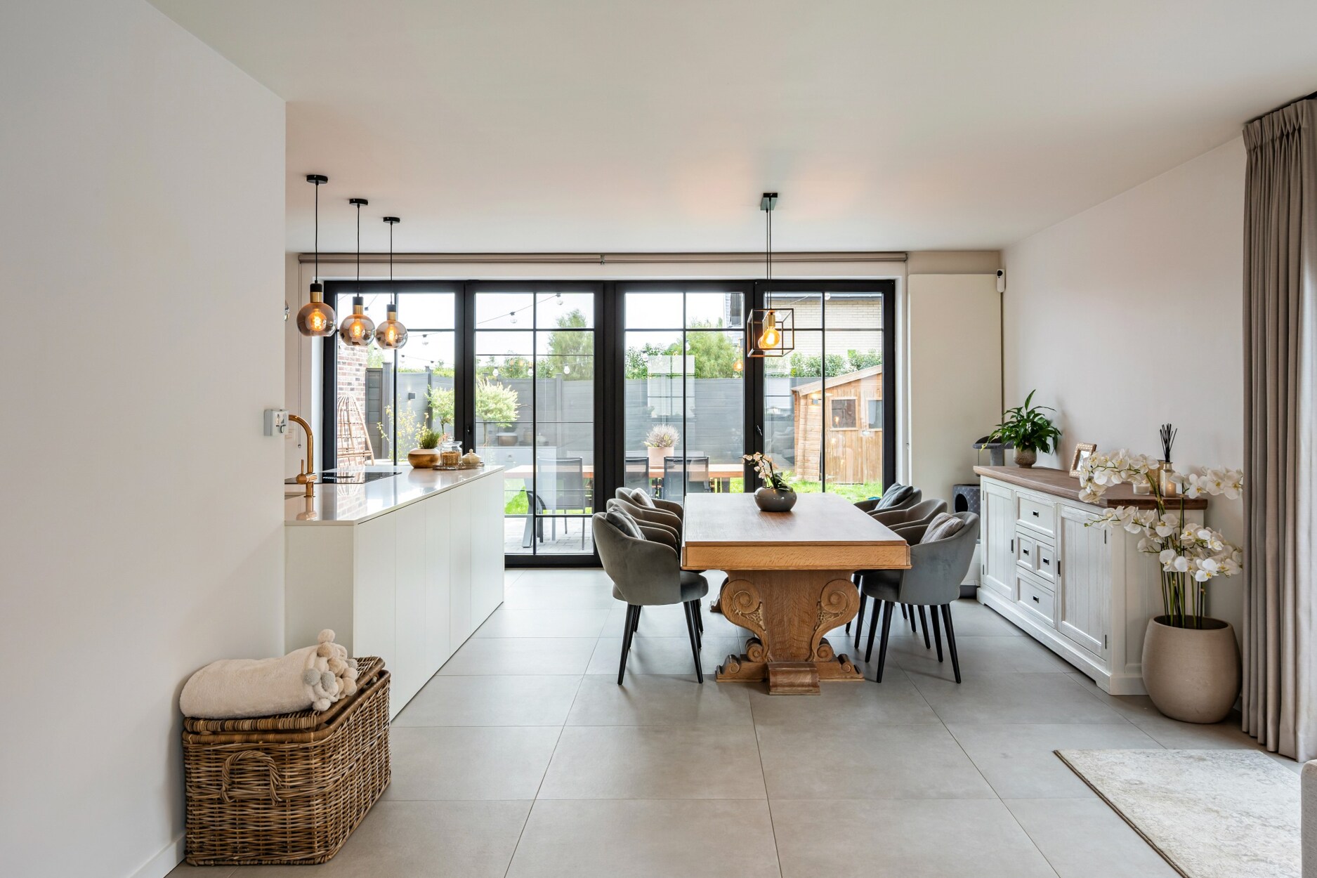 Bij het binnenkomen verwelkomt een ruime inkomhal je, voorzien van een gastentoilet. Rechts bevindt zich de lichtrijke leefruimte, waar woonkamer en eetkamer één open, uitnodigend geheel vormen. De grote raampartijen brengen overvloedig daglicht binnen en versterken het gevoel van ruimte. Aansluitend ligt de moderne open keuken, volledig uitgerust met kwalitatieve toestellen. Achter de keuken bevindt zich een praktische wasruimte/berging, ideaal voor extra opslag en huishoudelijke taken.
