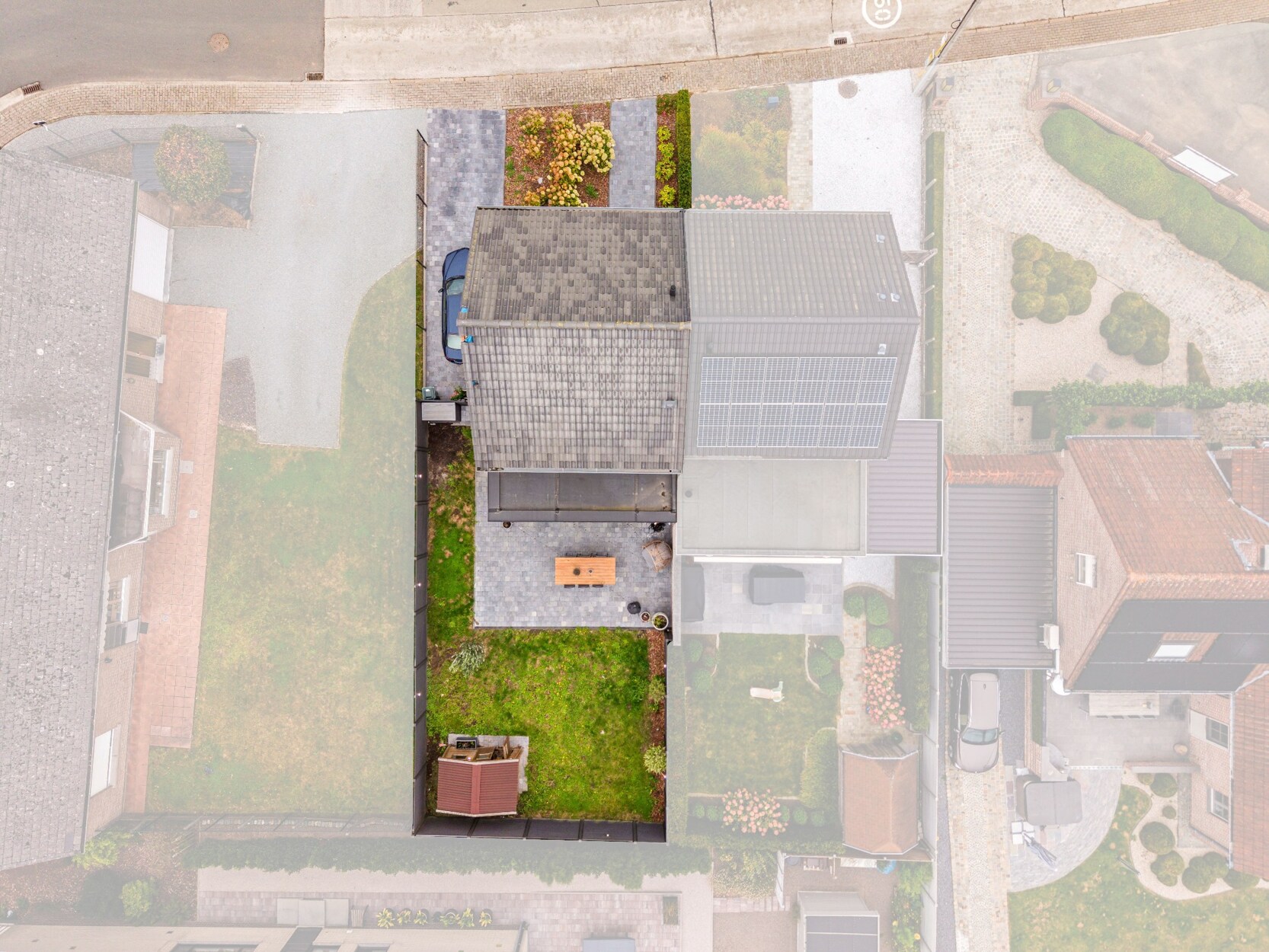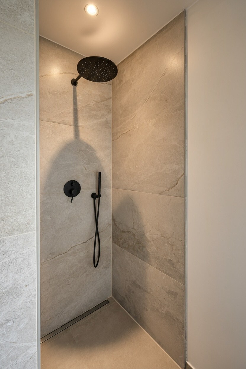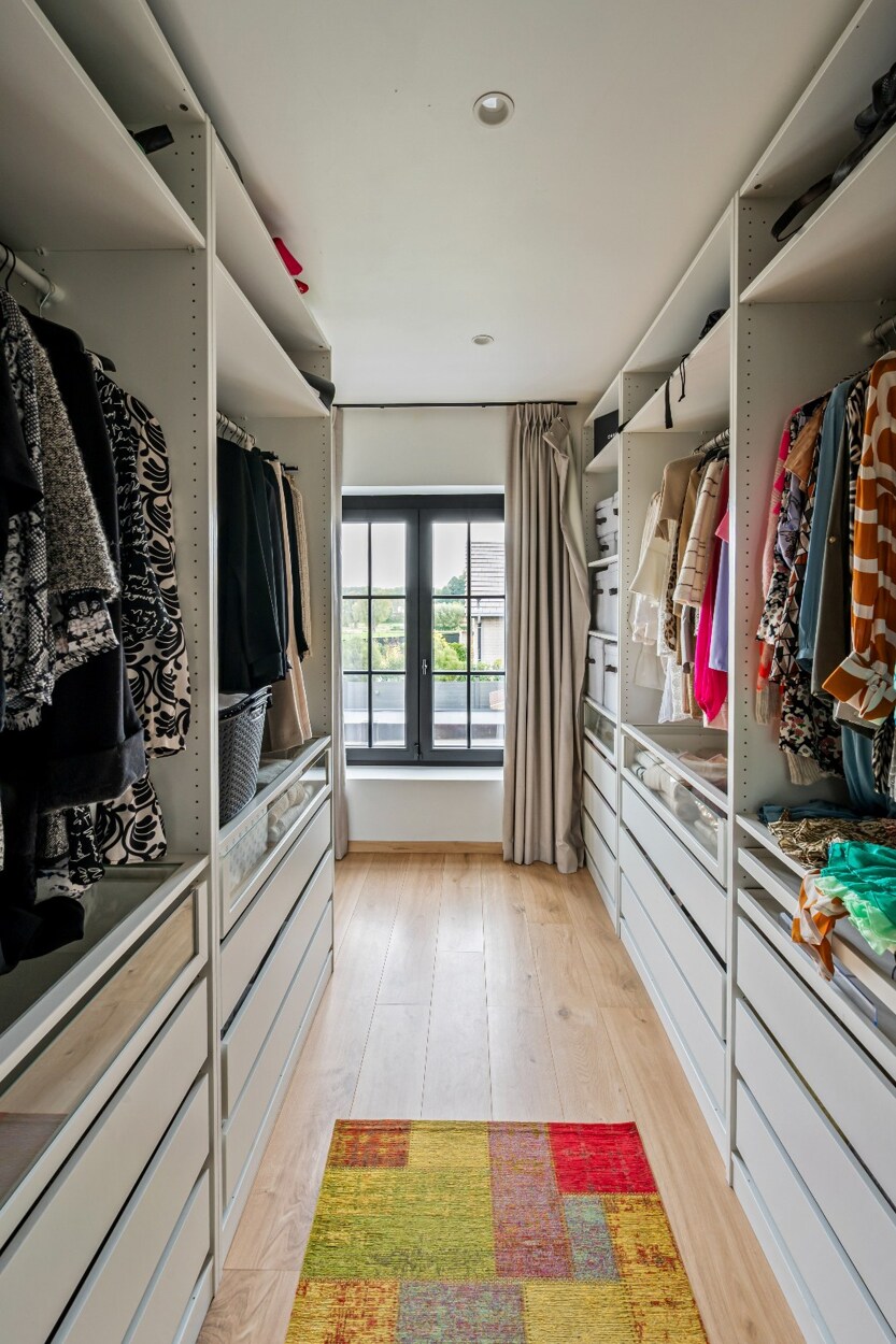 Op de verdieping vind je twee slaapkamers, waarvan één met een ruime dressing die desgewenst kan worden ingericht als derde slaapkamer. De stijlvolle badkamer is uitgerust met bad, douche, toilet en dubbele wastafel, met aandacht voor comfort en afwerking.