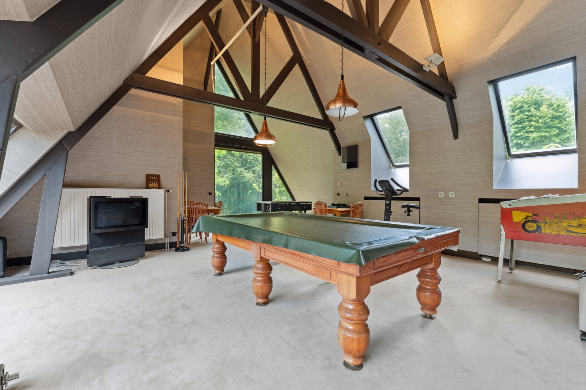 Een absolute troef is het prachtige binnenzwembad en jacuzzi met zicht op het omliggende groen, perfect geïntegreerd in de woning en voorzien van een luxueuze ontspanningsruimte met bar en sanitaire voorzieningen. Samen met de hamam beleef je hier een echte private wellnesservaring.