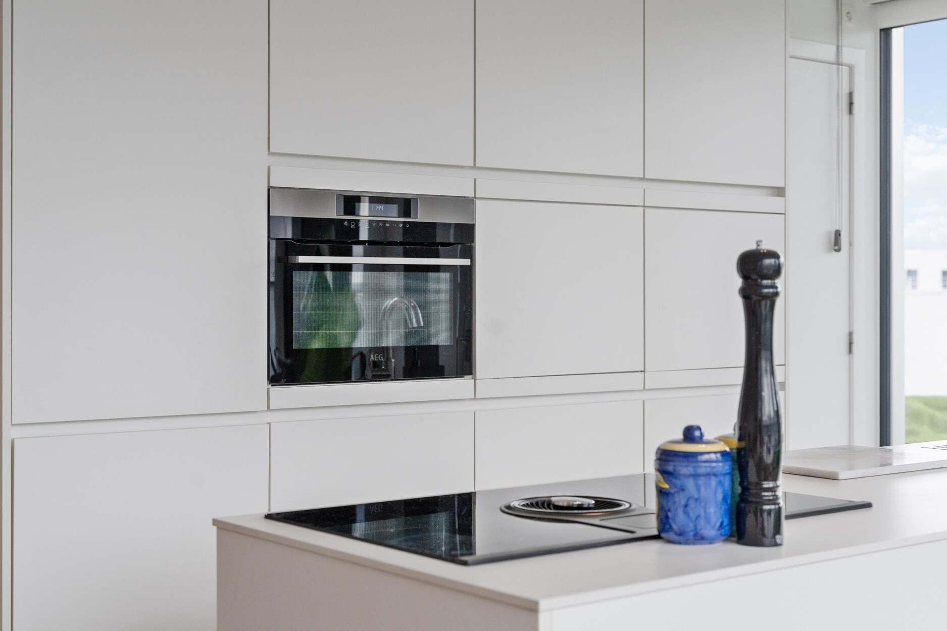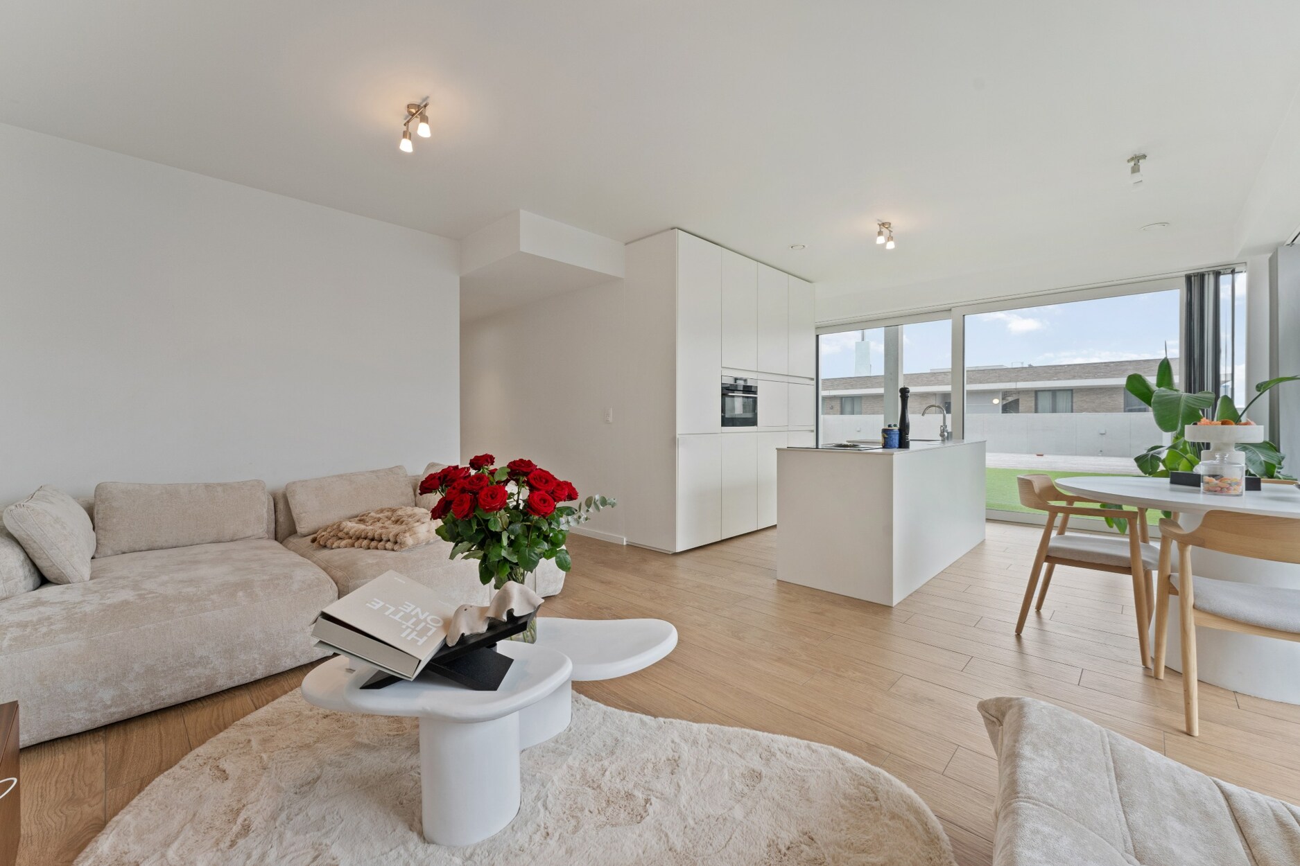 Via de inkomhal met videofonie, apart gastentoilet, vestiaire en wasplaats betreden we de leefruimte met open keuken. Keuken van Augustijns Keukens voorzien van ingebouwde kasten, vaatwasser, combi oven en ijskast met vriesvakken. Het kookeiland werd voorzien van een inductie kookplaat met ingebouwde afzuiging en rvs-gootsteen. Tot slot werden reeds alle leidingen aangelegd voor de installatie van een extra stoomoven en ingebouwde Espresso machine. Dankzij de grote raampartijen geniet u van veel lichtinval en een prachtig uitzicht. Vanuit de keuken heeft u toegang tot het riante Zuid-georiënteerd terras van maar liefst 130 m². De ideale plaats om gezellig te tafelen met familie en vrienden. Verlichting, waterkraan en elektriciteit voorzien op het terras.