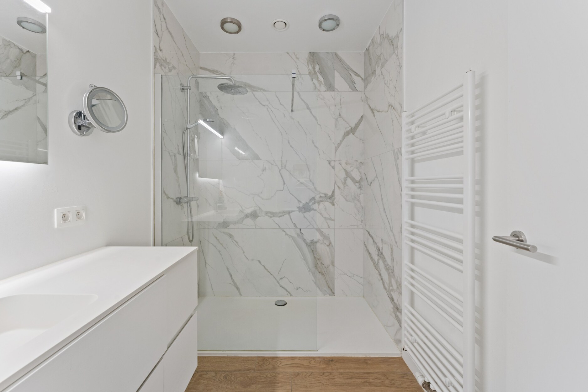 Het appartement beschikt over 3 slaapkamers met ingebouwde kasten, waarvan één slaapkamer met en-suite badkamer. Badkamer in marmerlook uitgerust met inloopdouche en lavabo in meubel. Keramische parket in alle ruimtes en vloerverwarming via het centraal systeem van de stad Antwerpen. Alle ramen uitgerust met verticale lamellen om de ruimte te verduisteren.