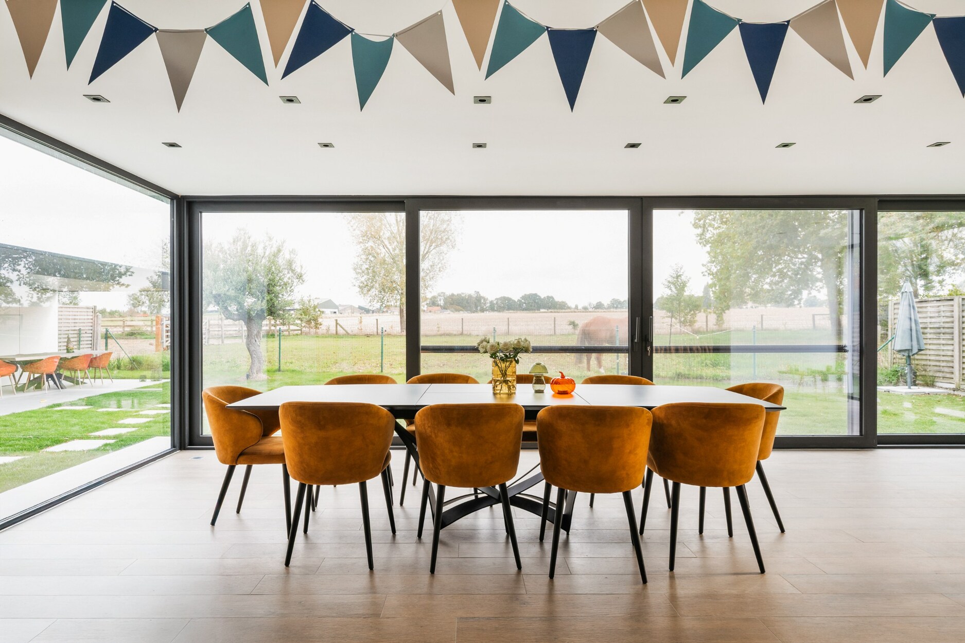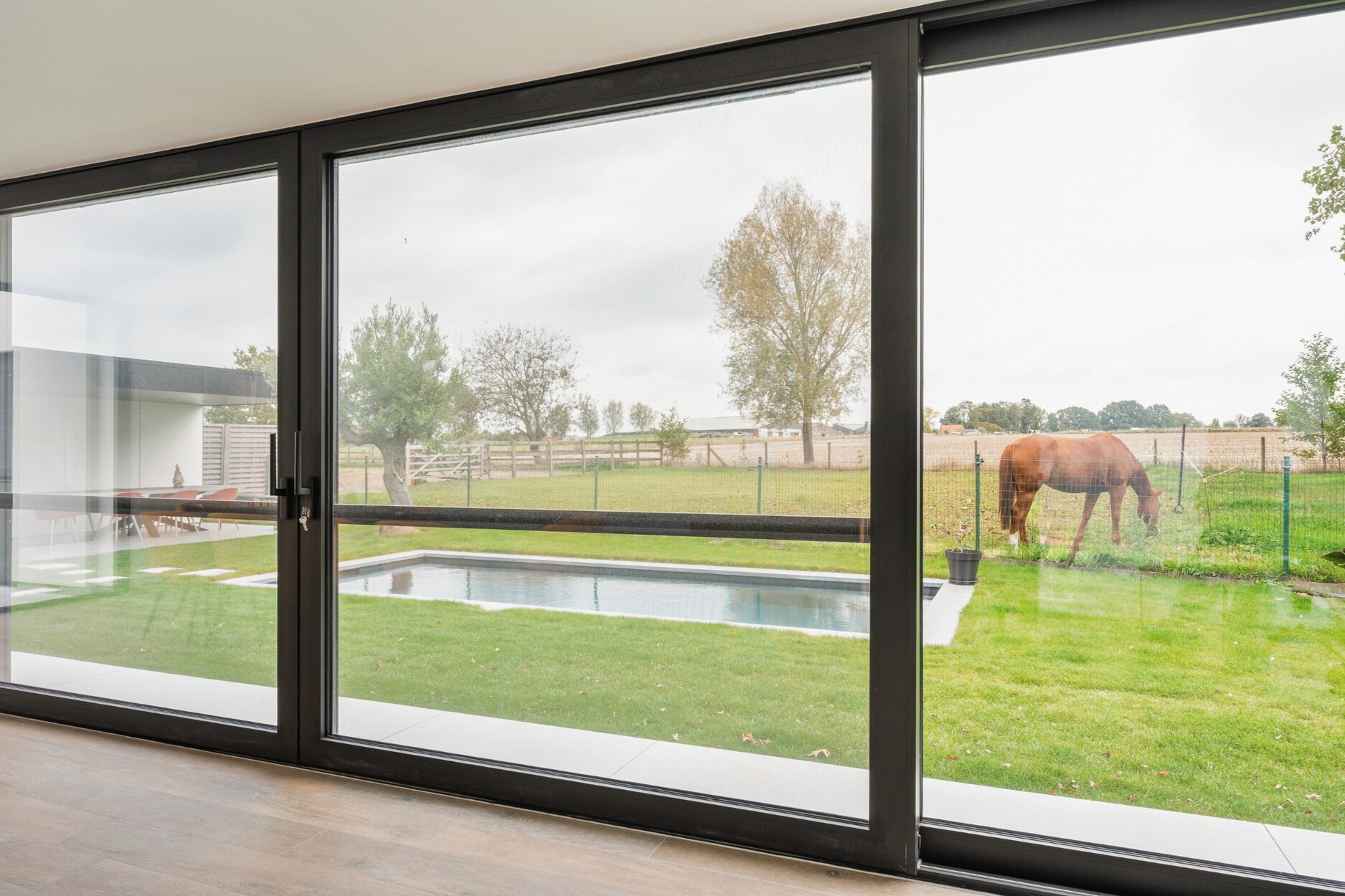 Op het gelijkvloers word je verwelkomd in een ruime, lichtrijke leefruimte met open zicht op de tuin en de achterliggende velden, hier zie je letterlijk de paarden voorbijlopen.