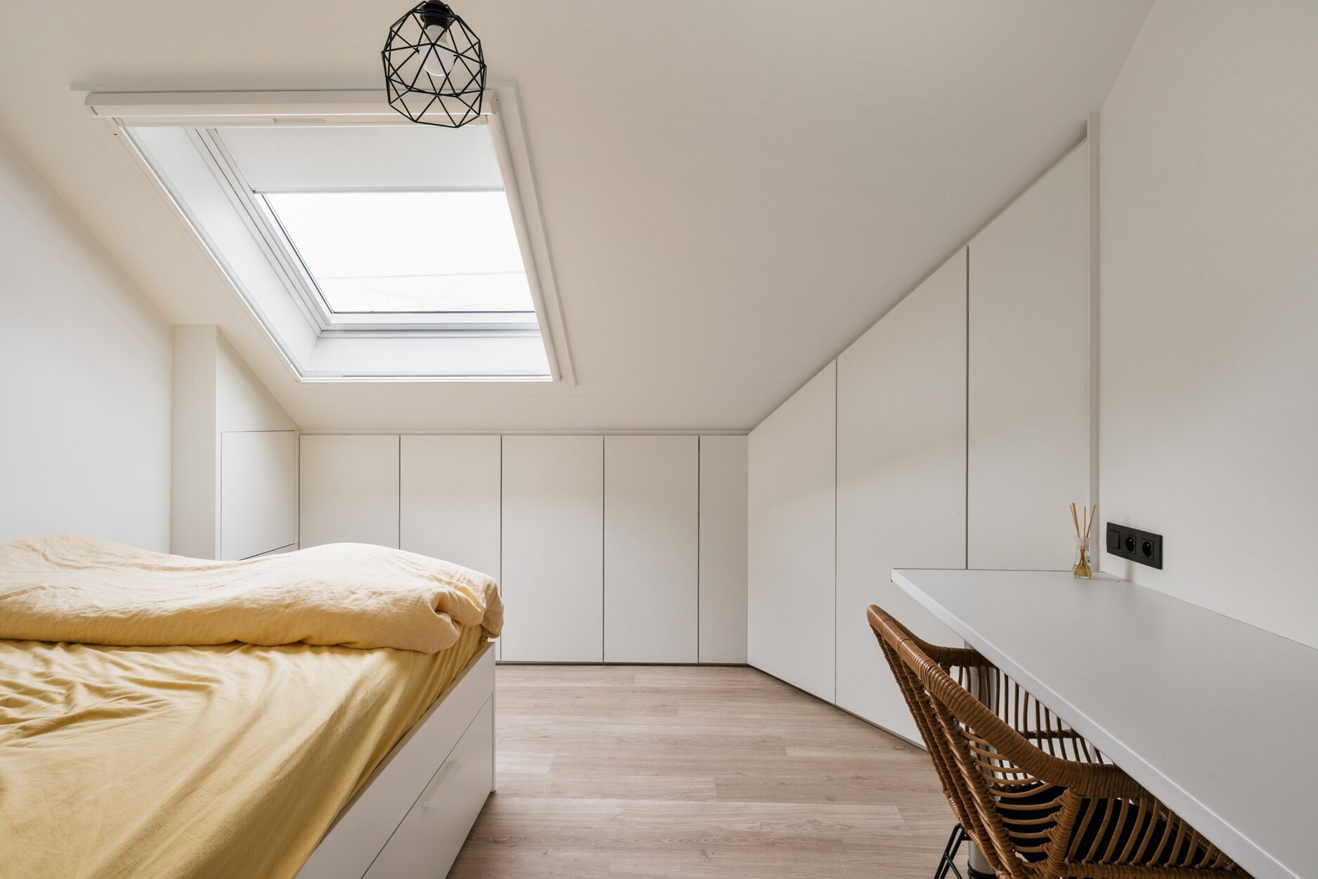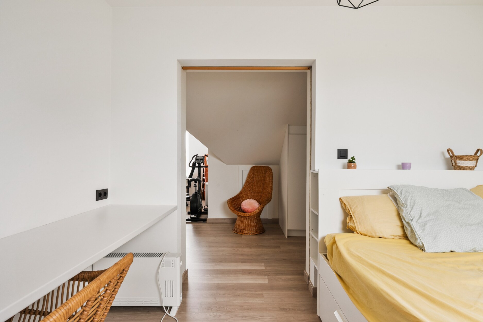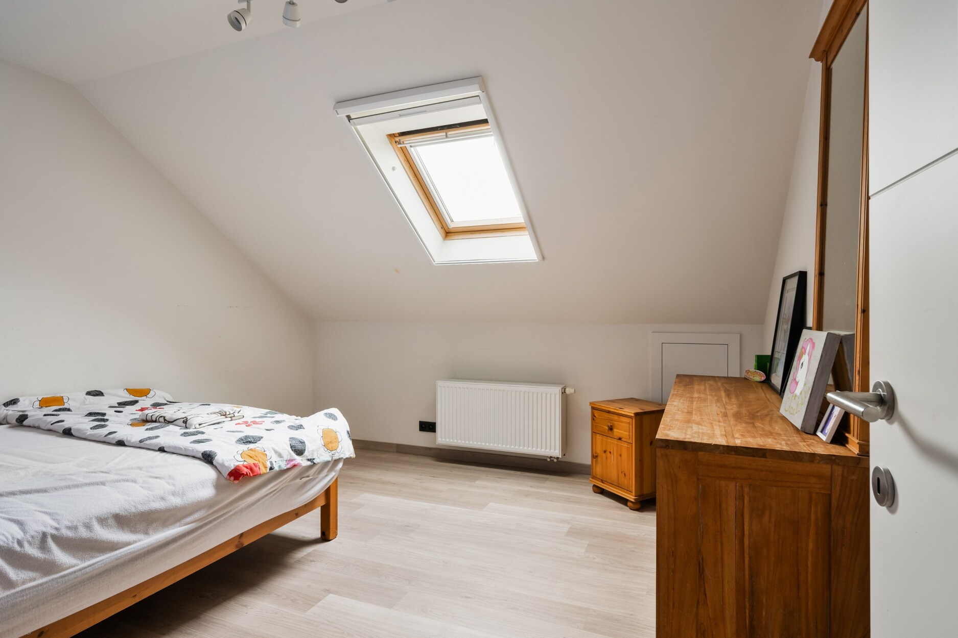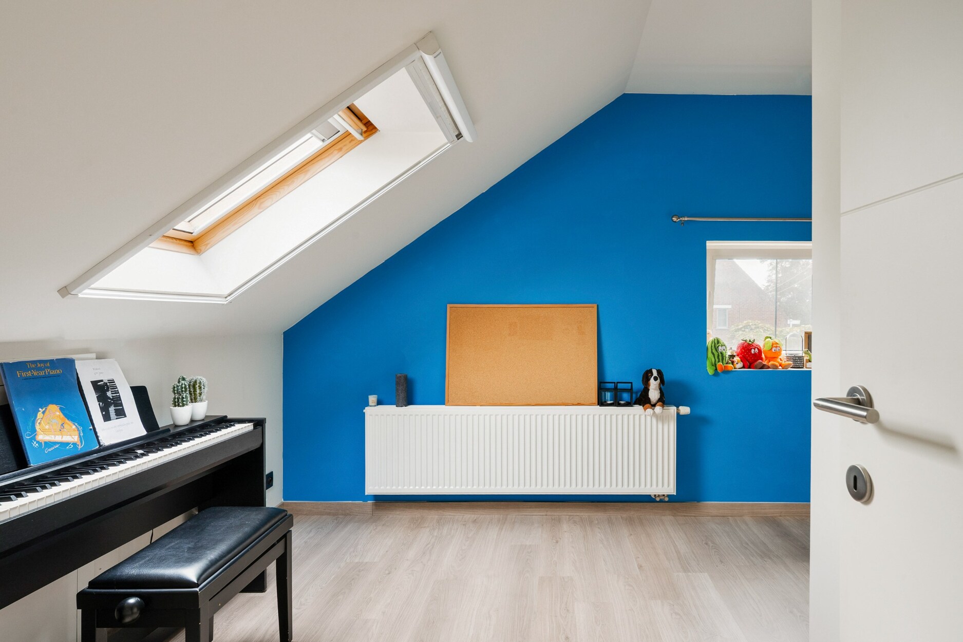De bovenverdieping biedt drie volwaardige slaapkamers en een tweede badkamer met douche. De ruime centrale hal is voorzien van ingemaakte kasten en kan perfect dienen als bureau, speelkamer of hobbyruimte.