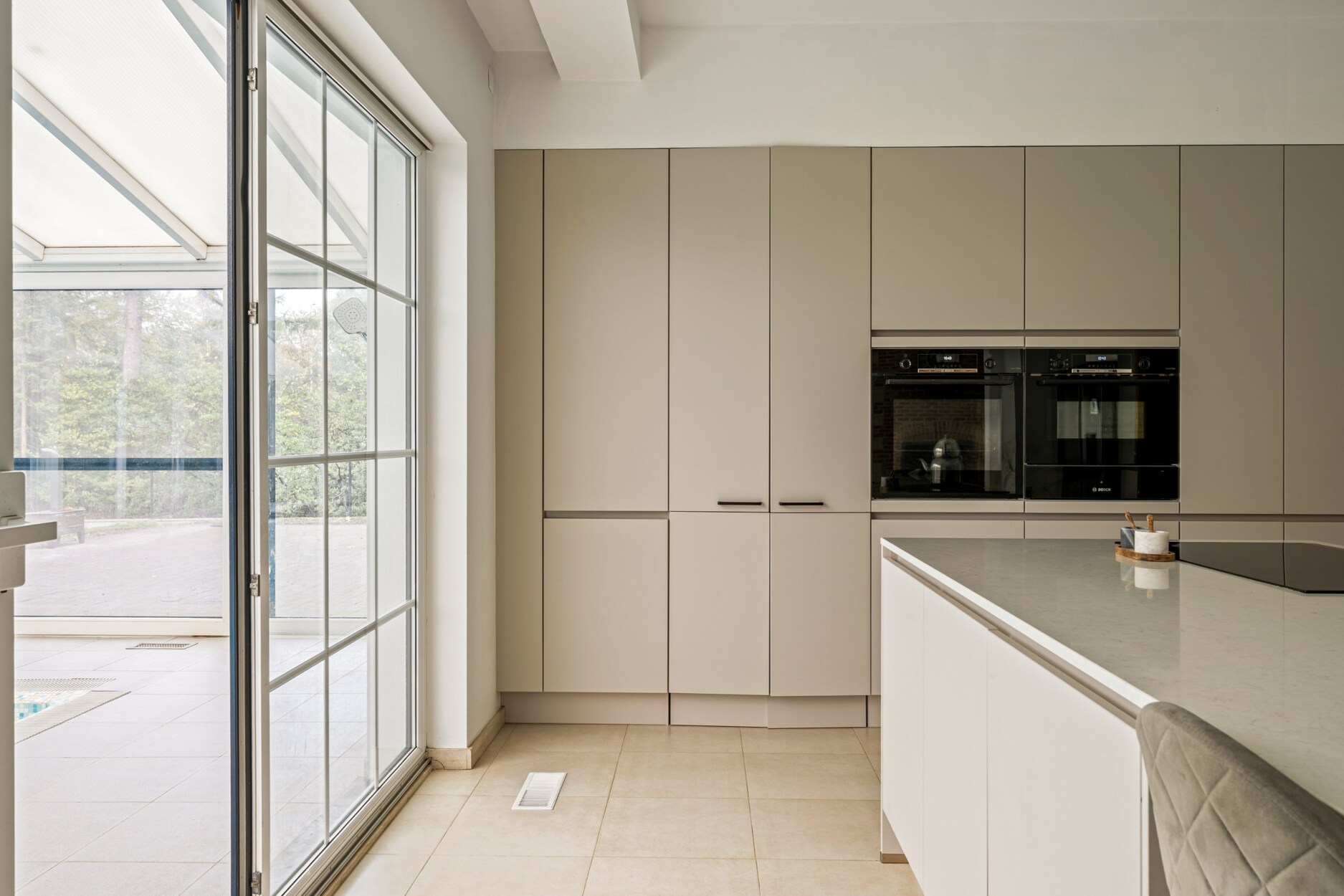 De moderne keuken – ruim en functioneel – is een plek waar koken een beleving wordt. Dankzij de aangrenzende berging blijft alles netjes opgeborgen. Hier woon je in een huis dat ademt: licht, openheid.