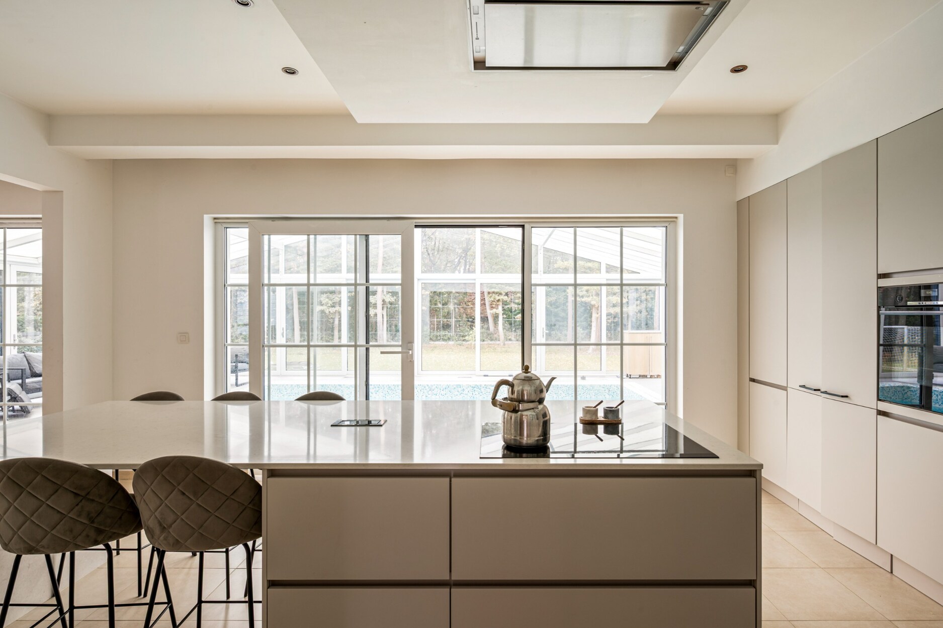 Achter glas, discreet geïntegreerd in de tuinzijde van de woning, vind je het volledig afgesloten binnenzwembad. Of het nu zomer of winter is, hier geniet je in alle privacy van ontspanning met zicht op het groen.