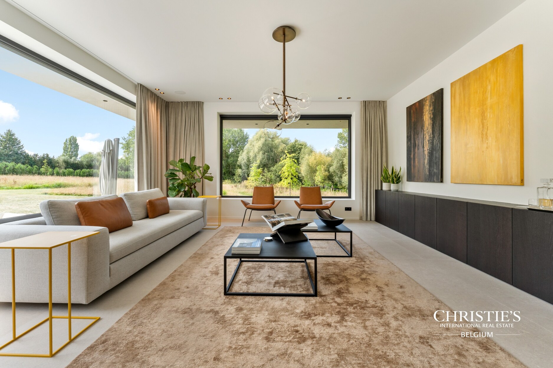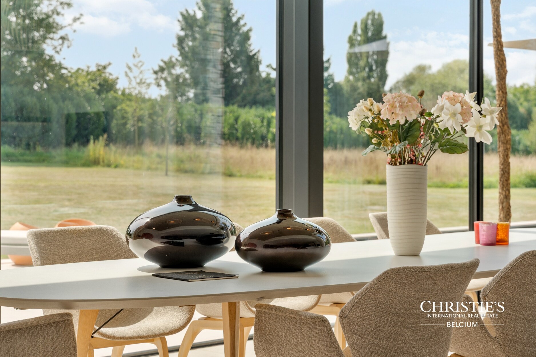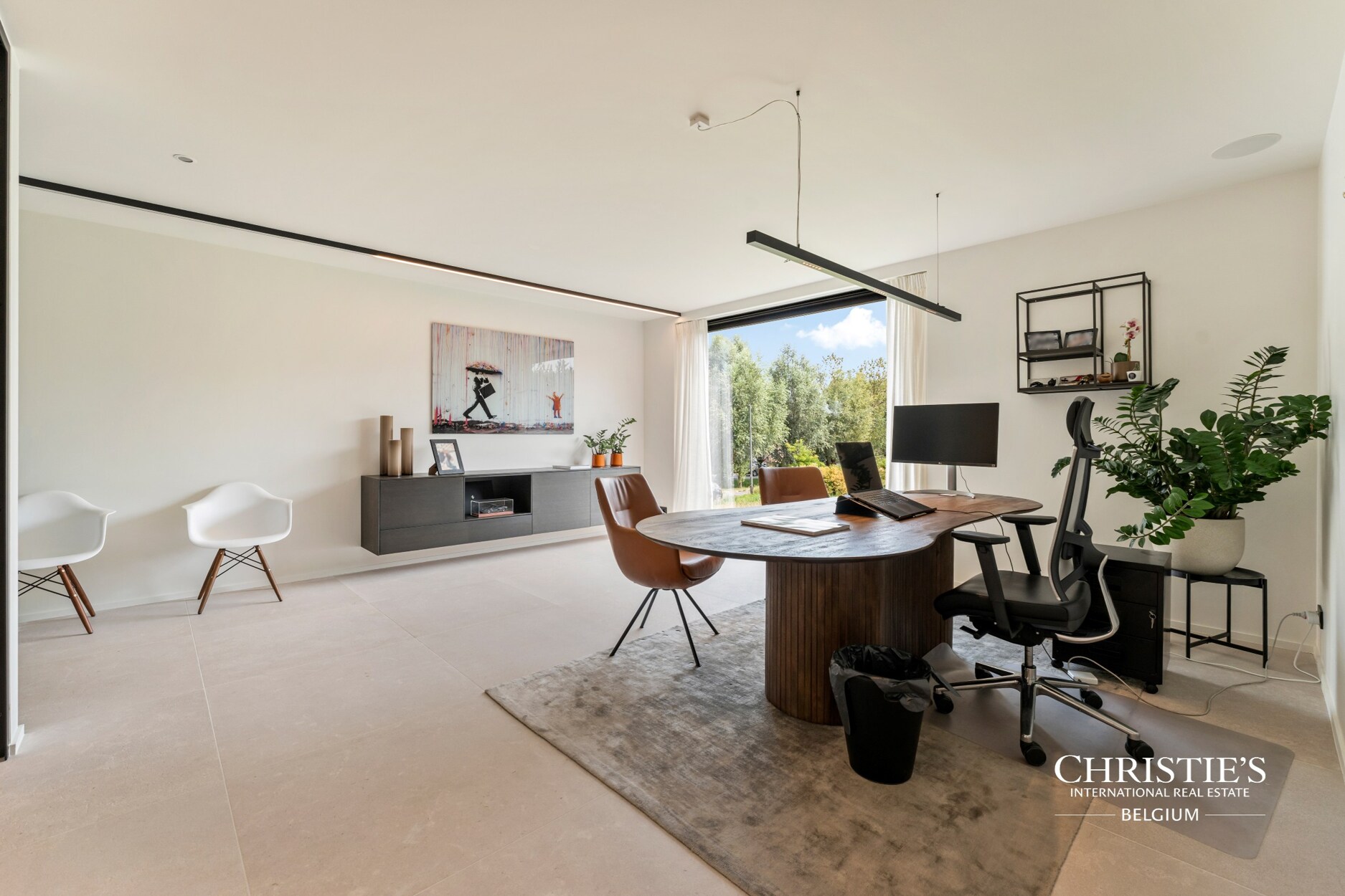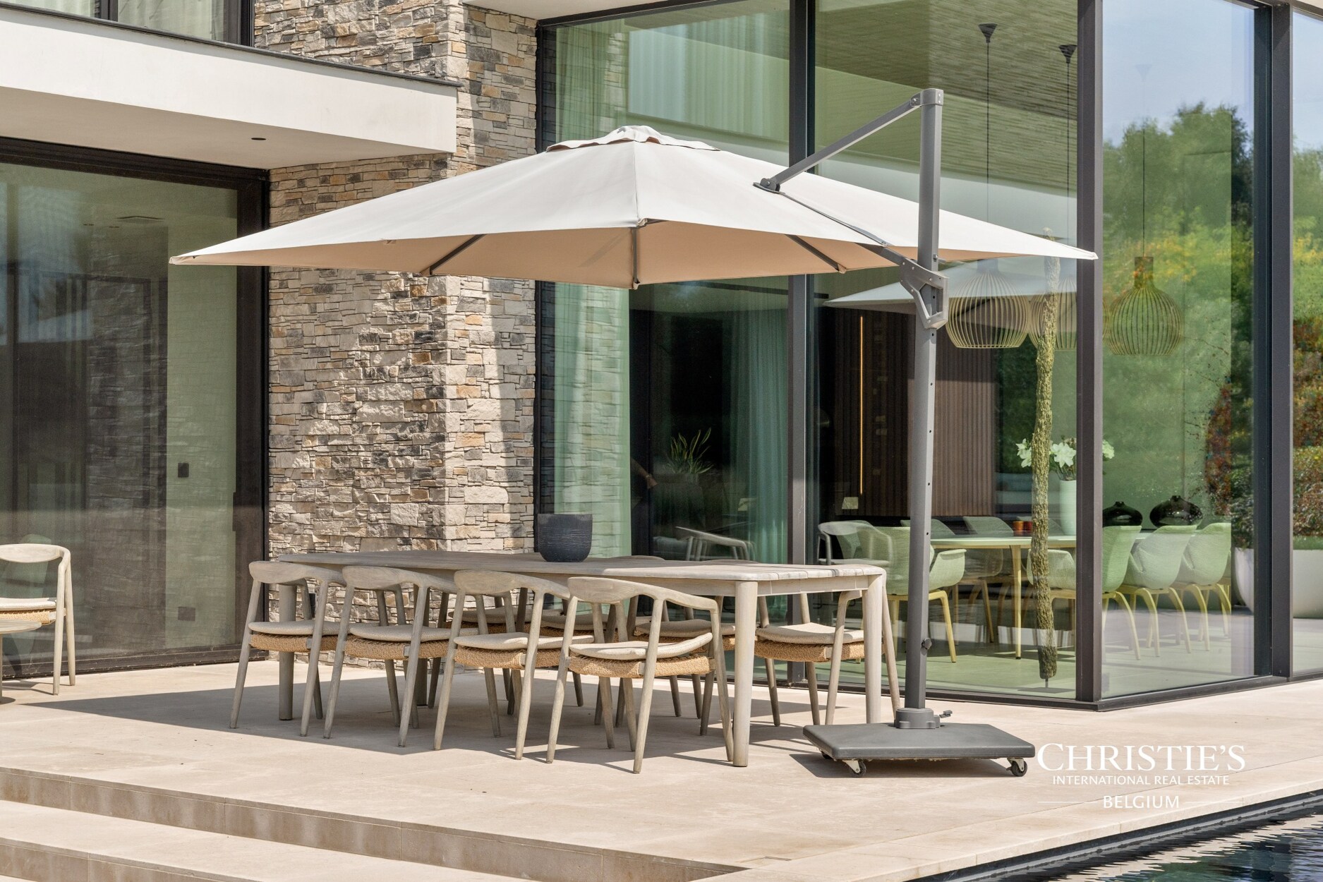 Op het einde van een rustige doodlopende straat, midden in een prachtige groene omgeving, vindt u deze luxueuze villa met een speelse en moderne architectuur van Mertens-architecten. De woning combineert een strak design met warme accenten en biedt alles wat u zich kan wensen op het vlak van comfort, ontspanning en privacy.