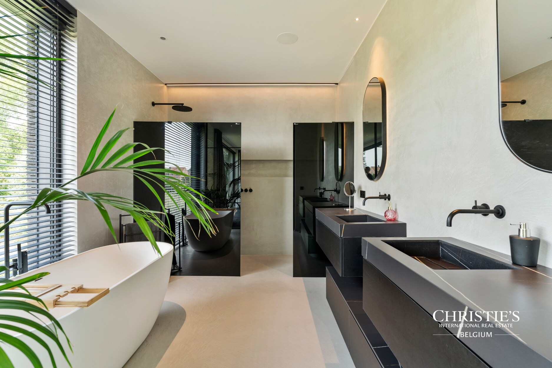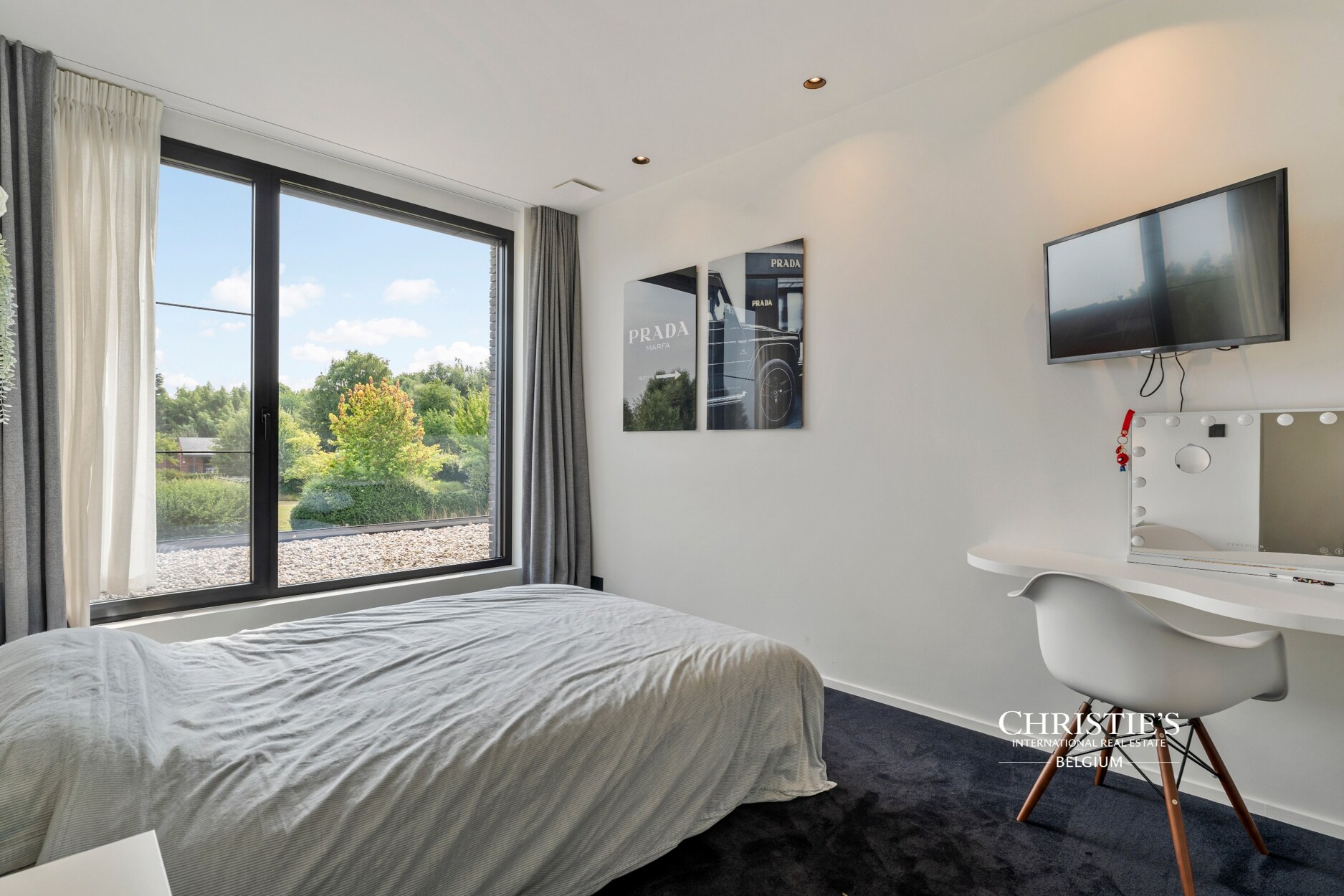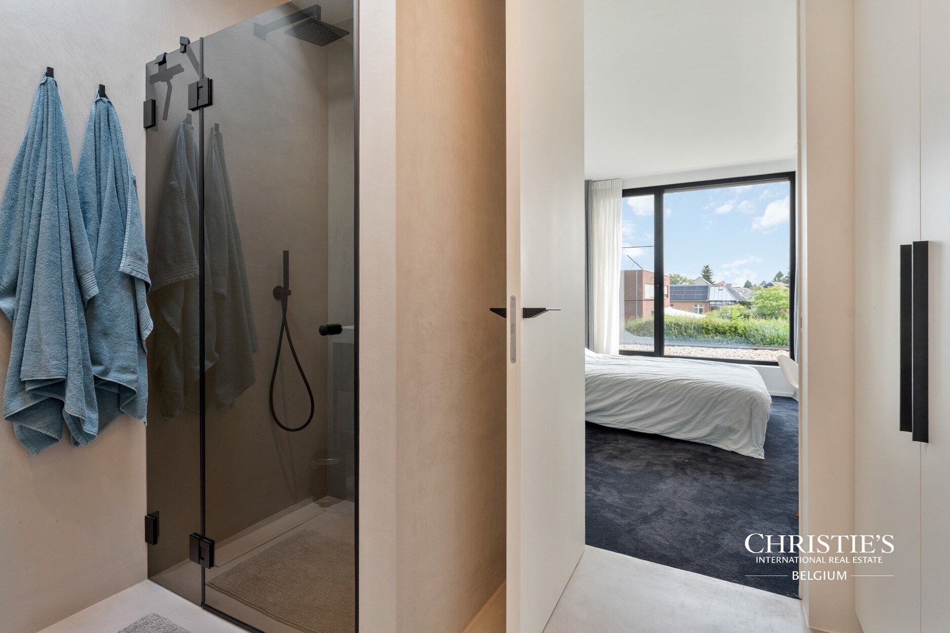 Op de verdieping bevindt zich de master suite met een eigen badkamer en een royale dressing. Daarnaast zijn er drie kinderkamers, elk voorzien van een eigen badkamer en dressing. Op het gelijkvloers is er bovendien een extra logeer- of nannykamer, wat deze woning bijzonder geschikt maakt voor gezinnen of wie vaak gasten ontvangt.