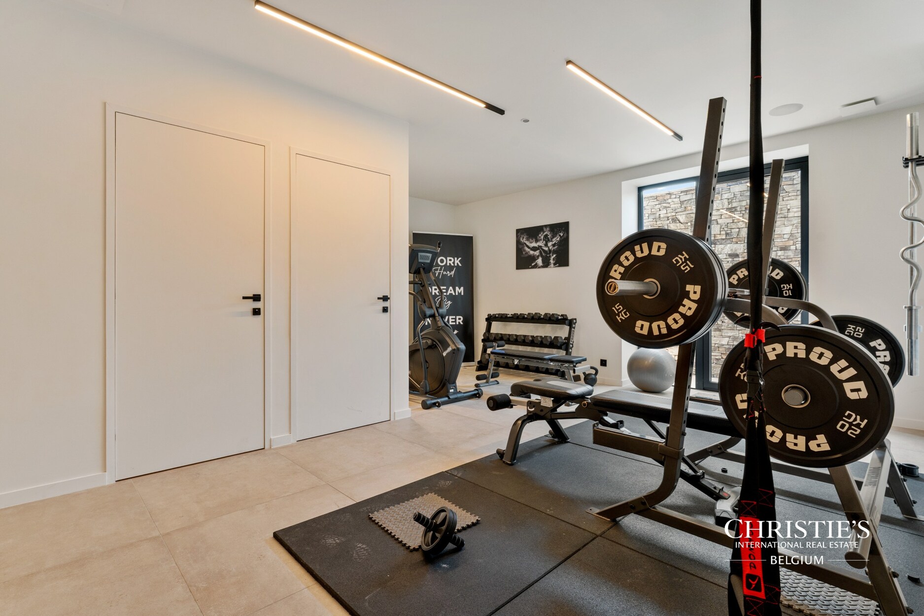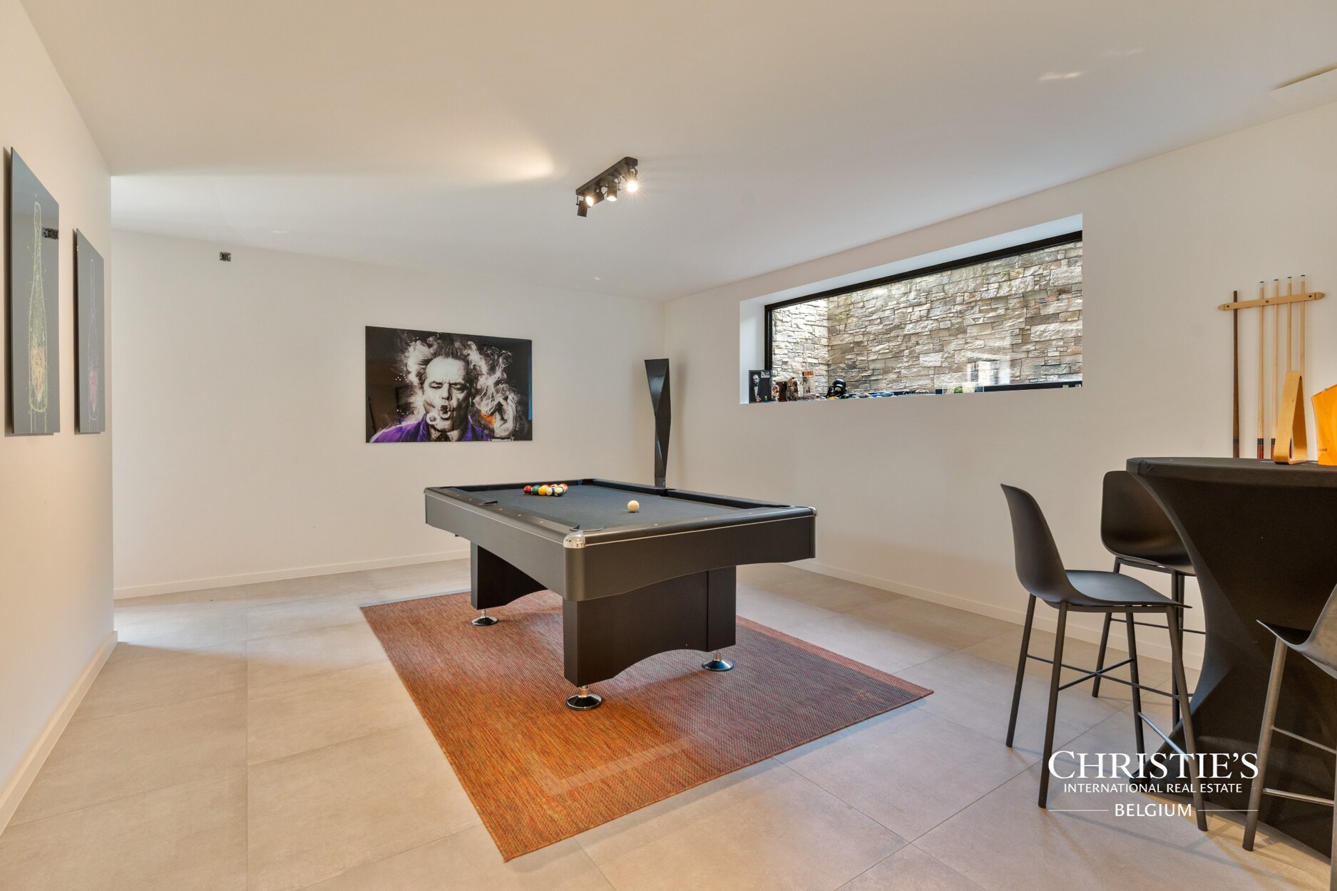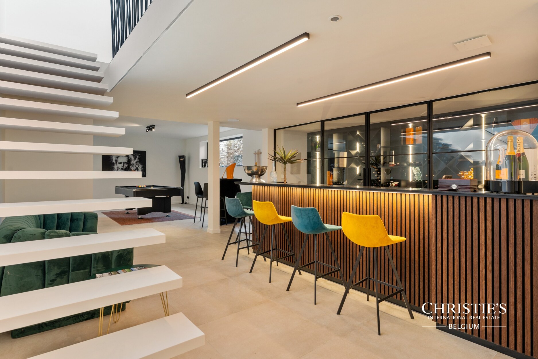 De kelderverdieping is een waar ontspanningsparadijs: een stijlvolle mancave met grote bar, wijnkelder, biljarttafel, fitnessruimte, sauna en een extra douche zorgen voor een luxueuze thuiservaring. De ondergrondse garage biedt plaats aan vier wagens en is rechtstreeks verbonden met de woning.
