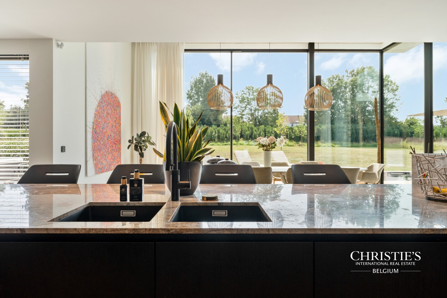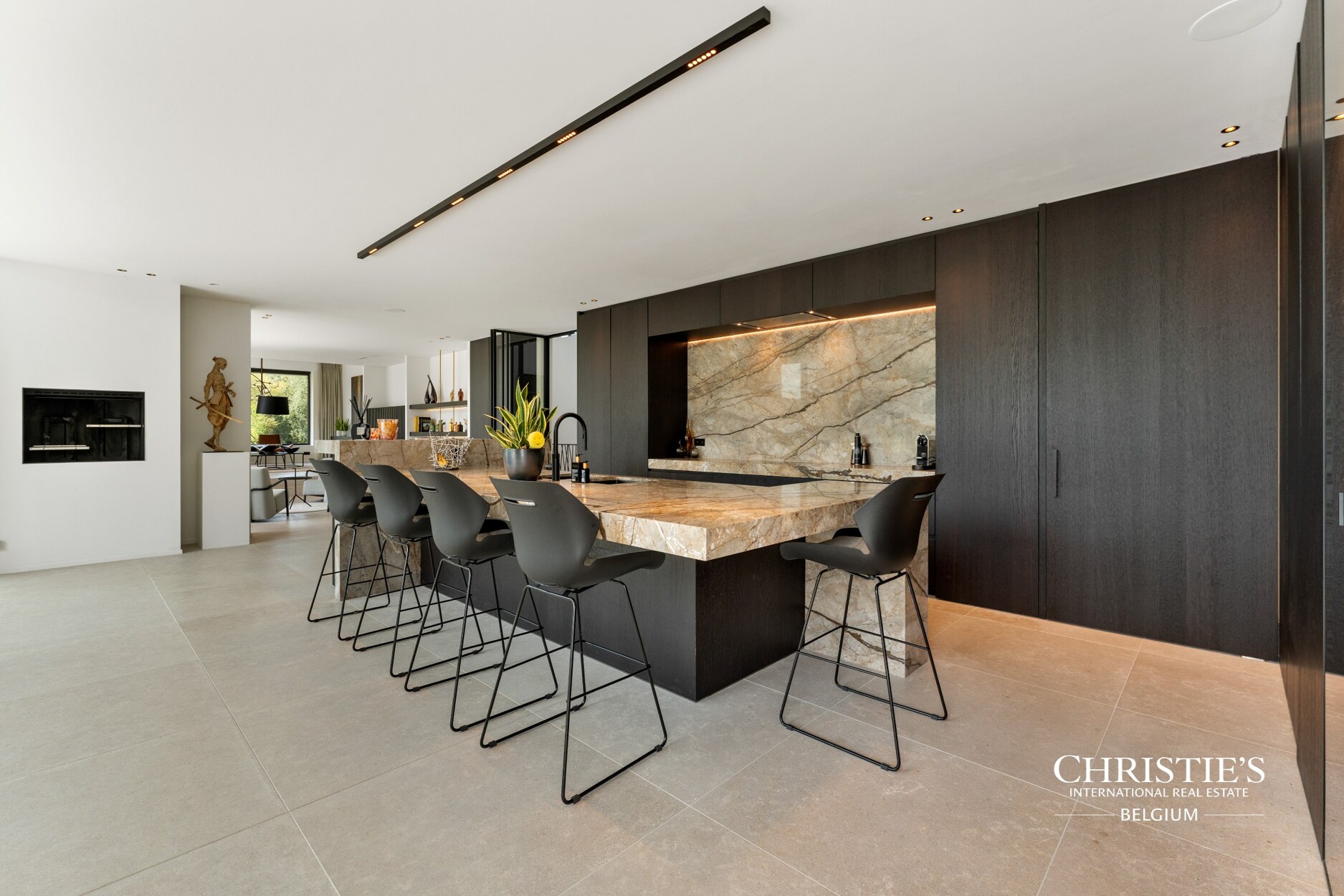 Bij het binnenkomen betreedt u een royale inkomhal die meteen de toon zet: ruimte, licht en verfijning. Vanuit de hal heeft u toegang tot de dubbele leefruimtes met open zicht op de tuin en het spiegelzwembad. De open designkeuken is perfect ingericht met topapparatuur van A-merken, een wijnfrigo en zelfs een ingebouwde binnen-BBQ, ideaal voor culinaire liefhebbers.