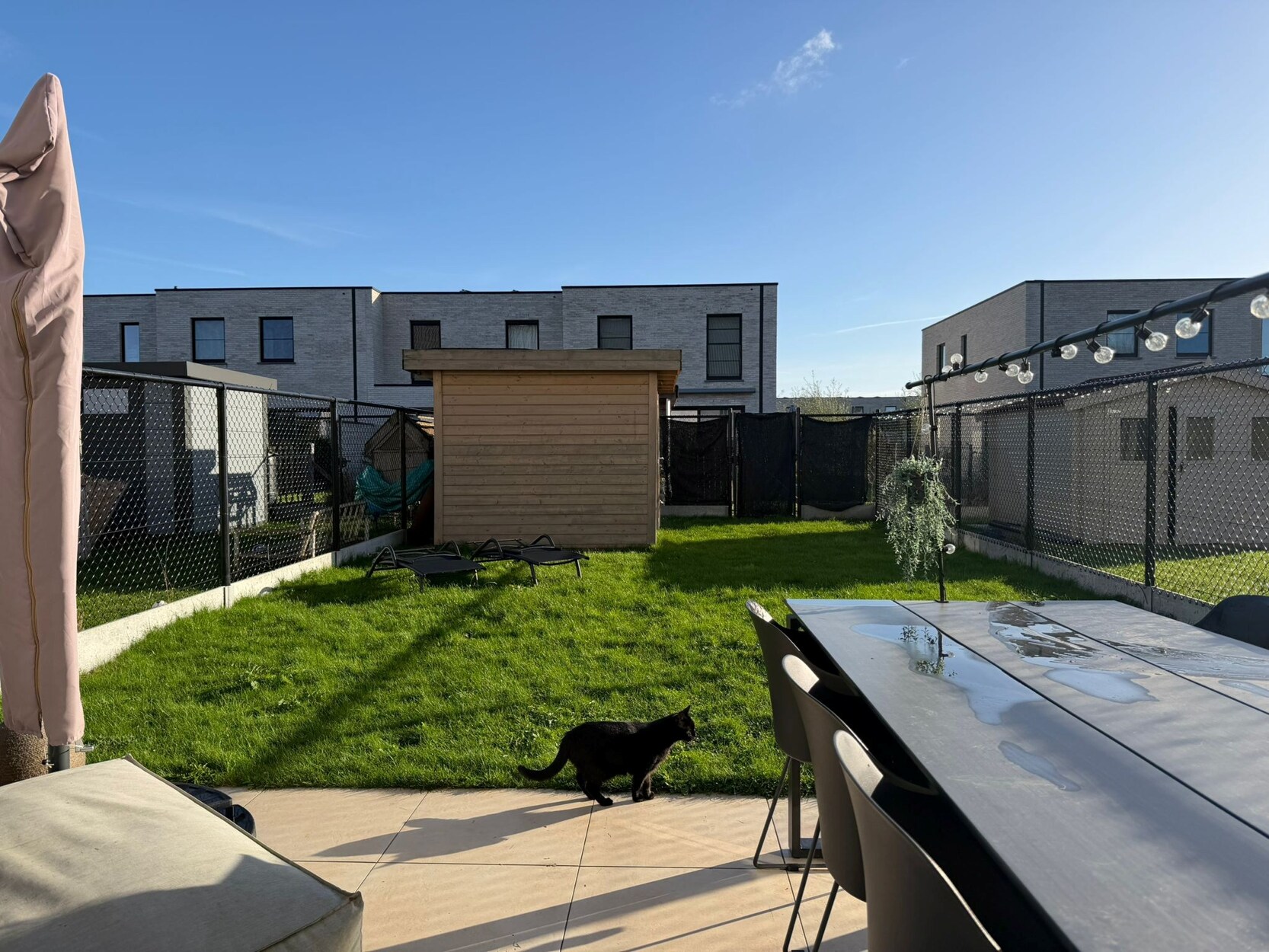 De tuin werd volledig omheind en fraai aangelegd. Een tuinhuis voorziet in extra opbergruimte. Via de achterkant van de tuin heeft u eveneens toegang tot het perceel.