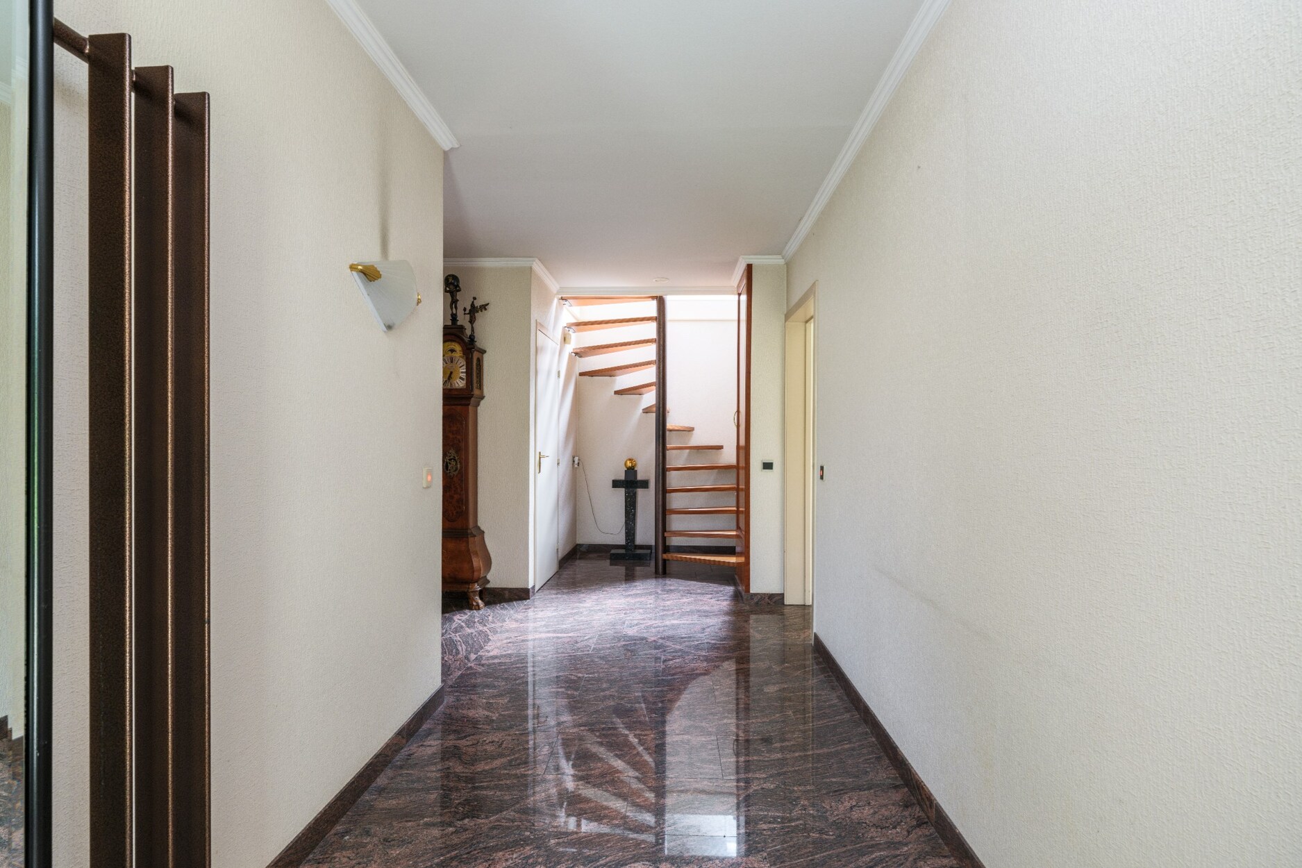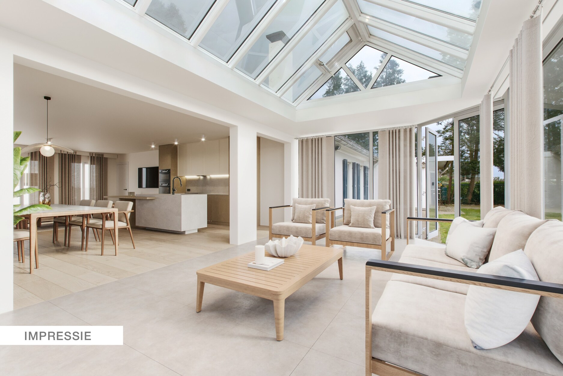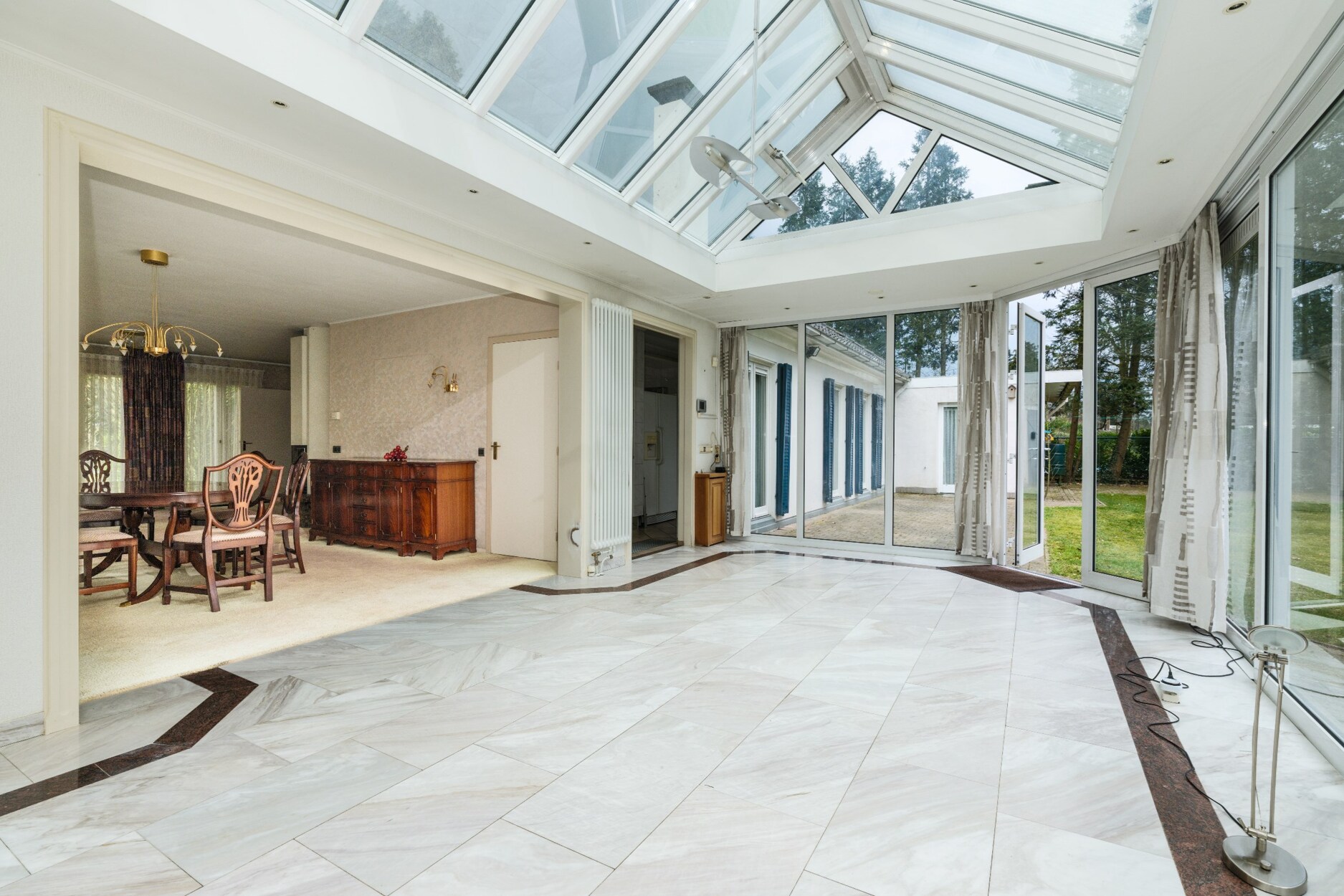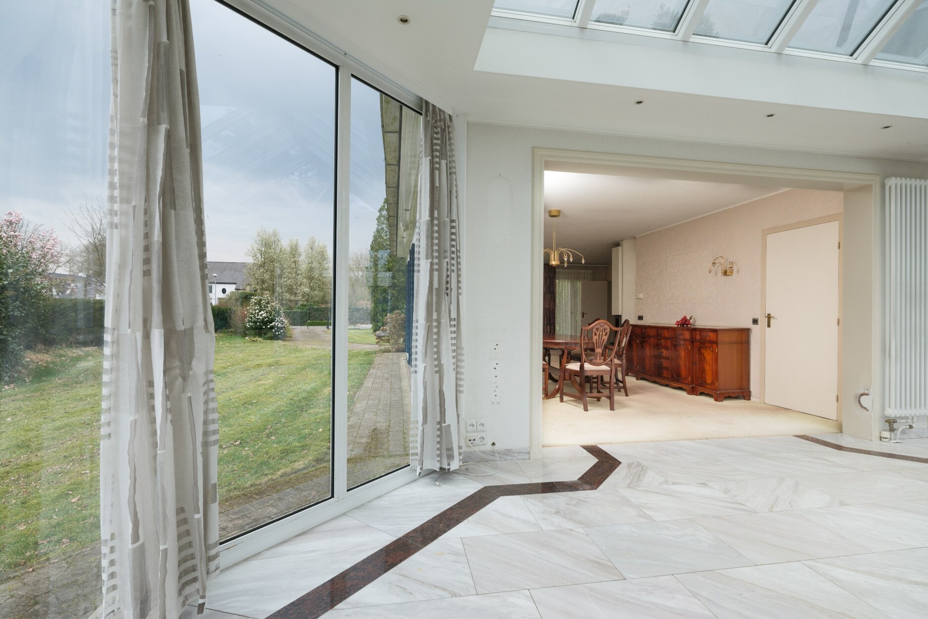 U betreedt de inkomhal van deze villa dewelke rechts toegang biedt tot de woonkamer. De raampartijen tot op de grond bieden veel lichtinval. De veranda dewelke werd aangebouwd zorgt voor een mooie uitbreiding van de leefruimte en geeft een mooi zicht op de tuin.