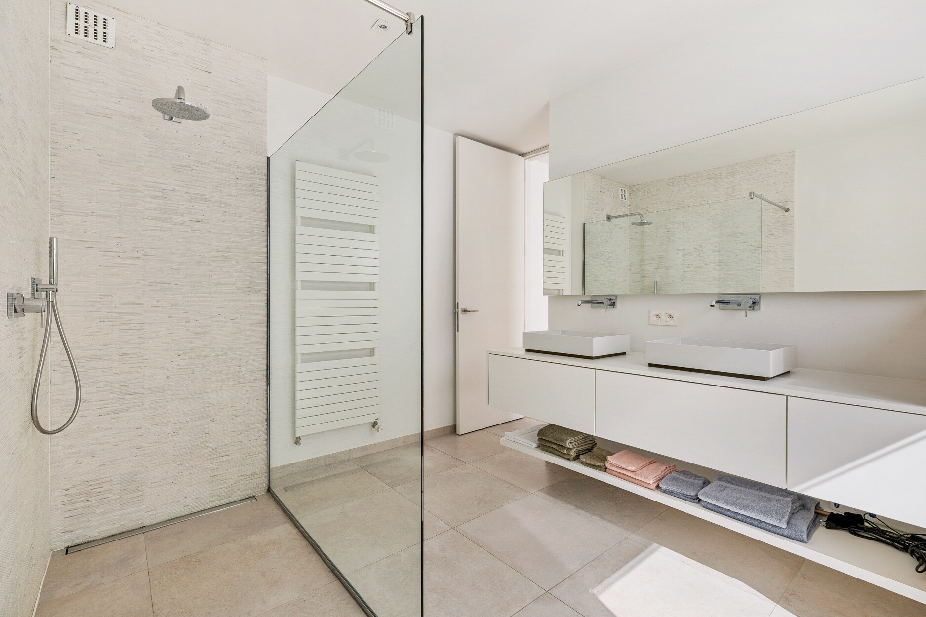 De gelijkvloers slaapkamer met open dressing beschikt over een badkamer met inloopdouche, dubbel wasmeubel en toilet. De slaapkamer kan ook dienst doen als bureau/praktijkruimte met de dressing als wachtruimte.
