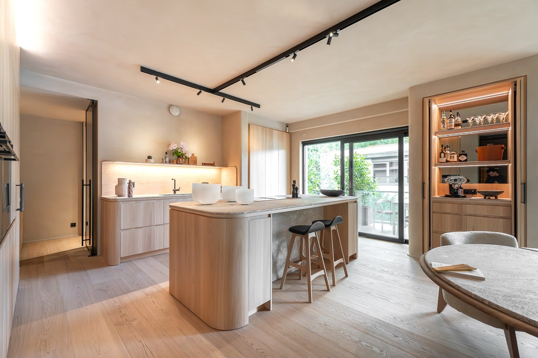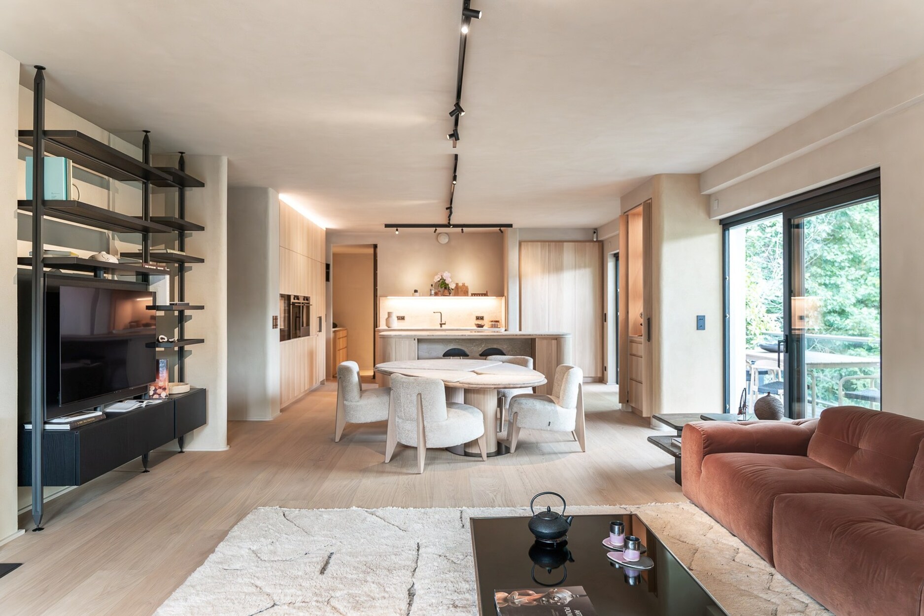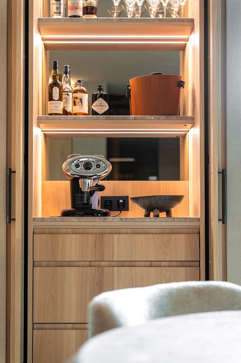 Vanaf de inkom zorgen de royale volumes en het natuurlijke licht voor een serene sfeer. De leefruimte, open op drie gevels, omvat een salon met open haard, een gezellige eetkamer, een bar-/koffiehoek en een op maat gemaakte iepenhouten keuken, uitgerust met Atag-toestellen (multifunctionele oven, stoomoven, microgolf, warmhoudlade, wijnkelder), evenals een wasruimte. Drie terrassen (oost, zuid, west) bieden vrij uitzicht op de Ferme du Fond’Roy en het omliggende platteland.