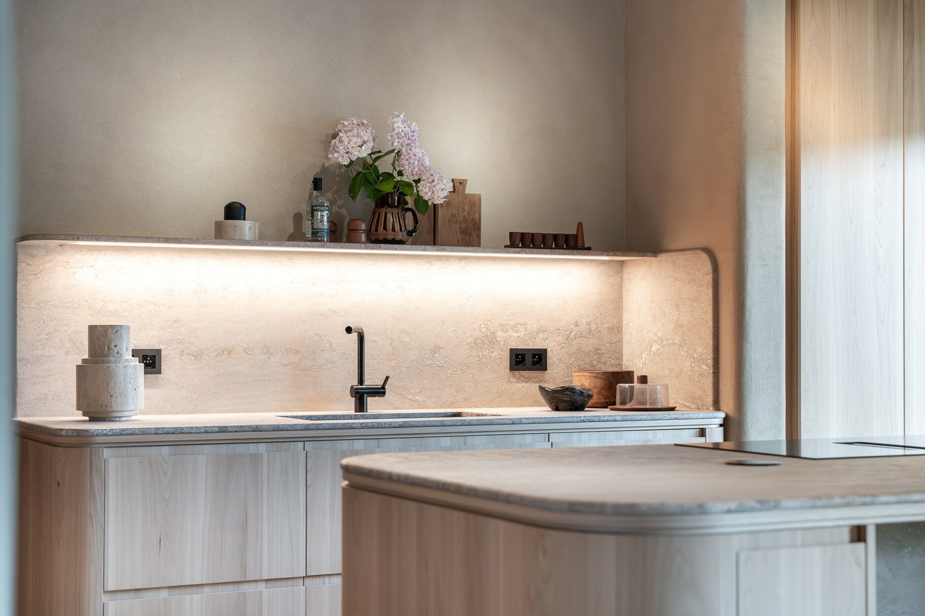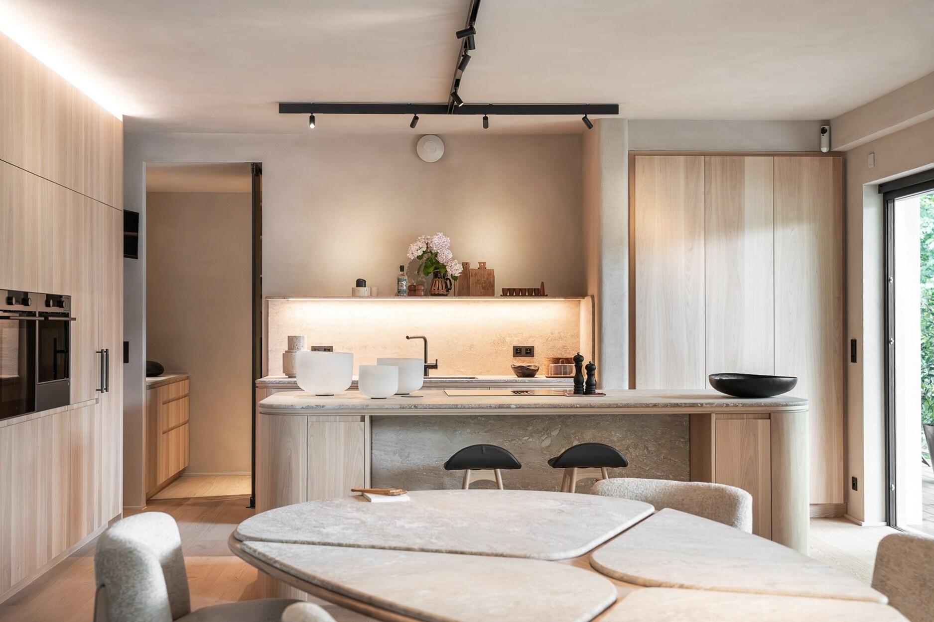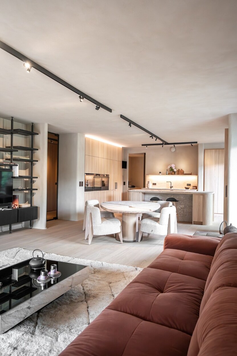 Vanaf de inkom zorgen de royale volumes en het natuurlijke licht voor een serene sfeer. De leefruimte, open op drie gevels, omvat een salon met open haard, een gezellige eetkamer, een bar-/koffiehoek en een op maat gemaakte iepenhouten keuken, uitgerust met Atag-toestellen (multifunctionele oven, stoomoven, microgolf, warmhoudlade, wijnkelder), evenals een wasruimte. Drie terrassen (oost, zuid, west) bieden vrij uitzicht op de Ferme du Fond’Roy en het omliggende platteland.