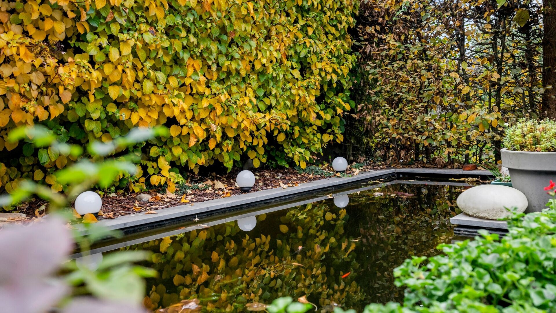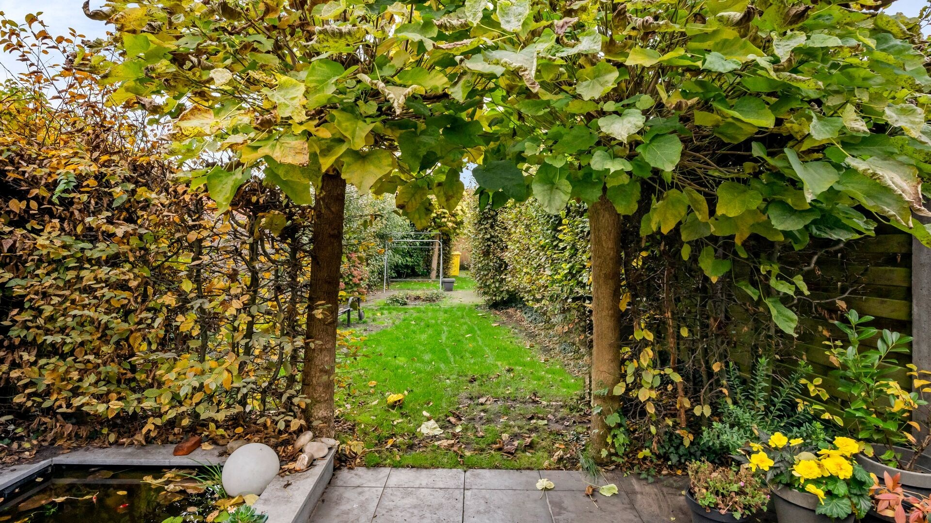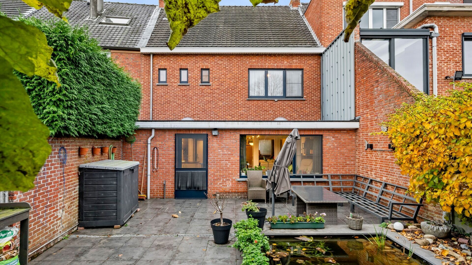 Ruime tuin met fijn terras, vijver en buitenberging.