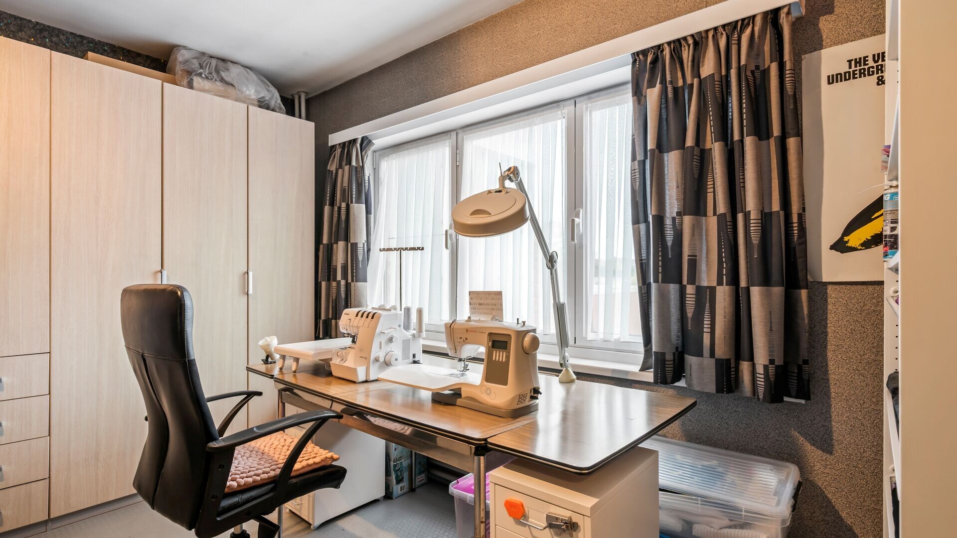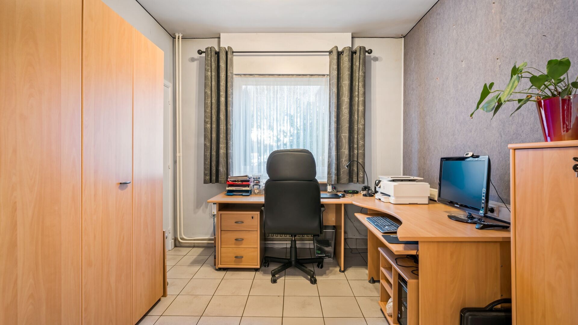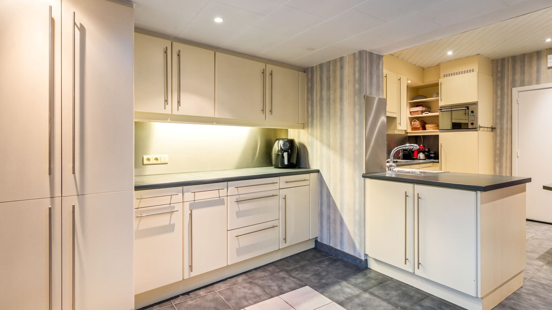 Via de inkomhal heeft u toegang links tot het open bureel en aansluitend de woonkamer. De gezellige woonkamer kijkt uit op de veranda en via de woonkamer komt u in de praktische keuken met veel kastruimte en ingericht met vaatwas (3 maanden oud), koelkast (3j oud), gasvuur, dampkap en oven. Naast de keuken een douchekamer met toilet. Garage met automatische sectionaalpoort. Deze garage doet momenteel dienst als berging voor fietsen, vuilbakken en dergelijke.