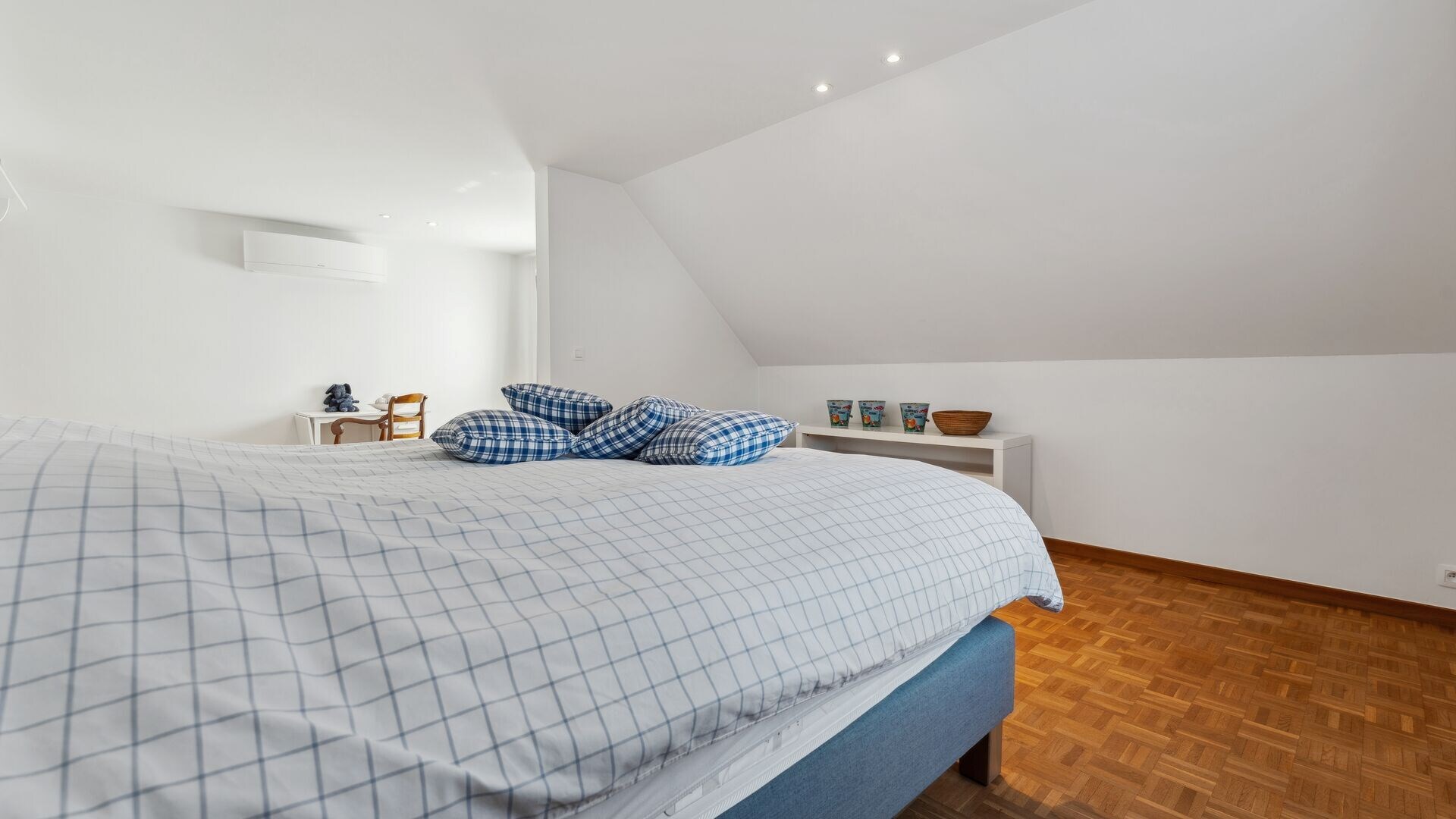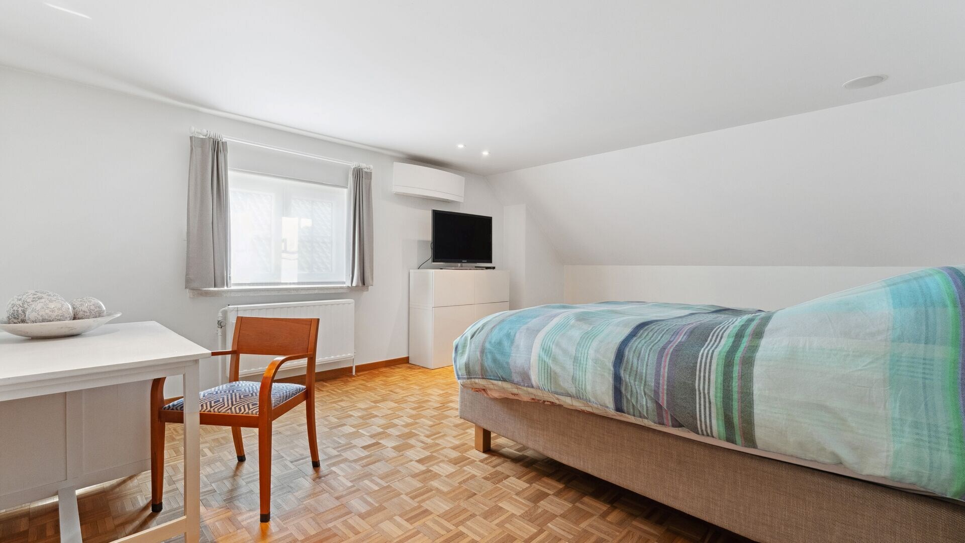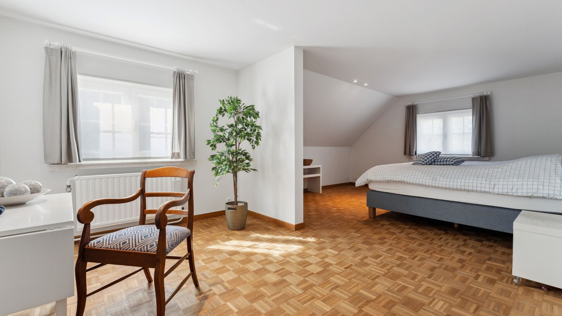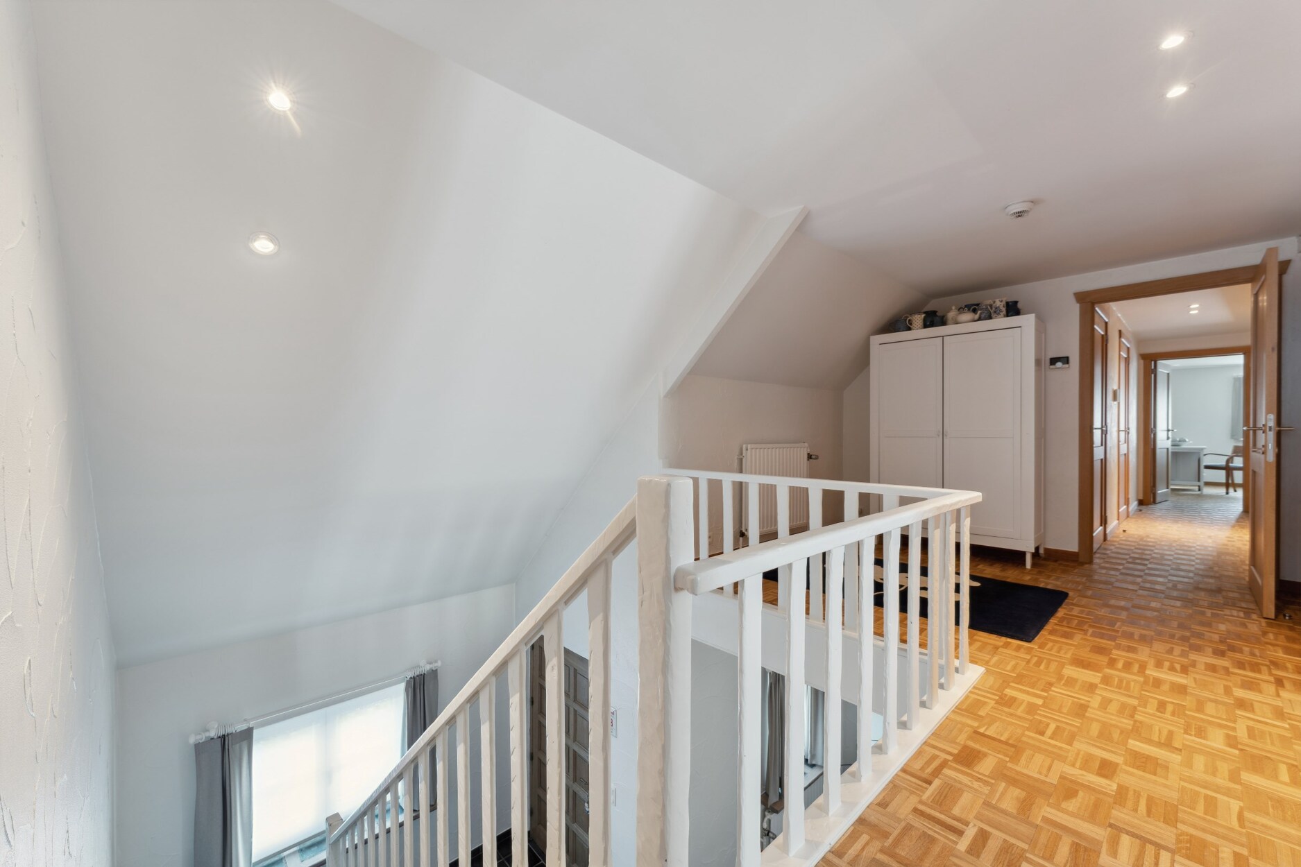 De trap brengt u tot de bovenverdieping. De ruime overloop biedt toegang tot de 4 slaapkamers en badkamer. De badkamer werd volledig vernieuwd en is voorzien van een ligbad, inloopdouche en dubbele wastafel in meubel. Apart toilet op de nachthal aanwezig. De masterbedroom is voorzien van een inloopdressing.