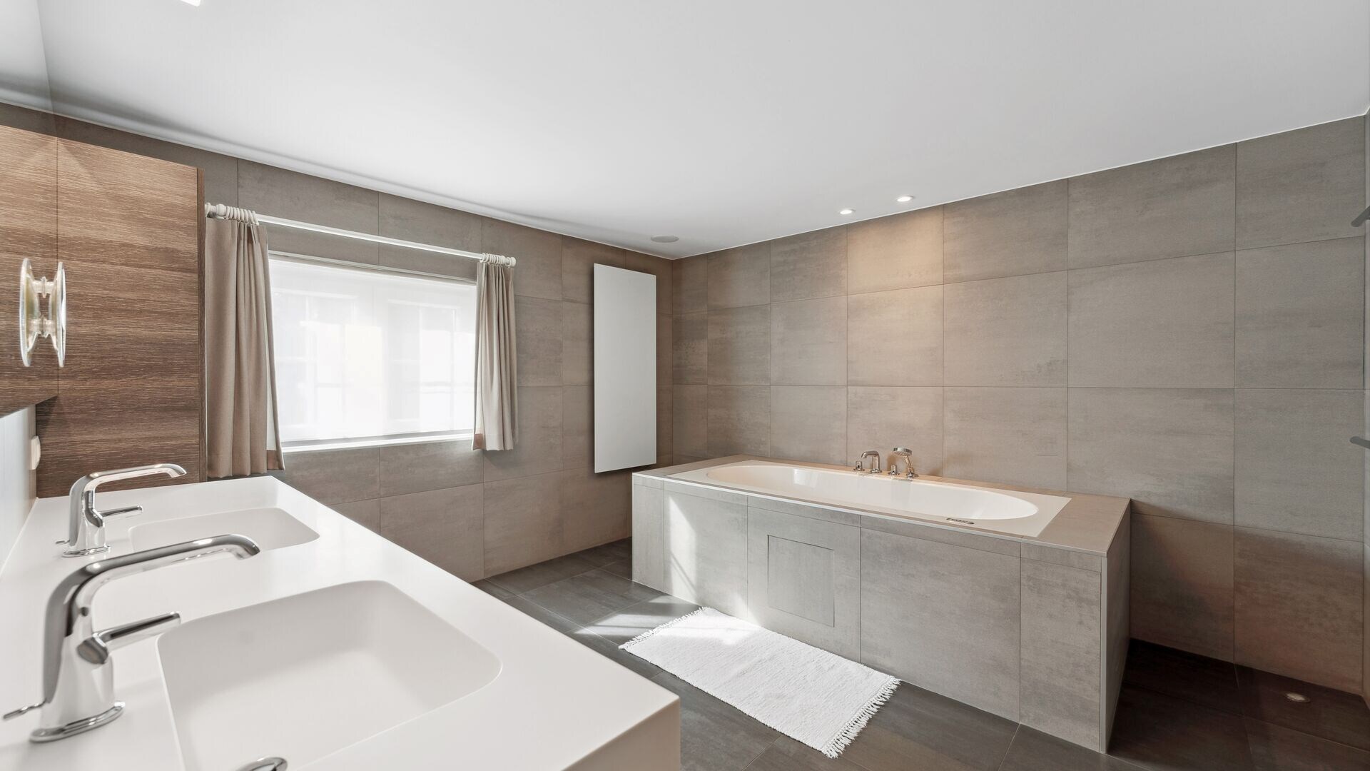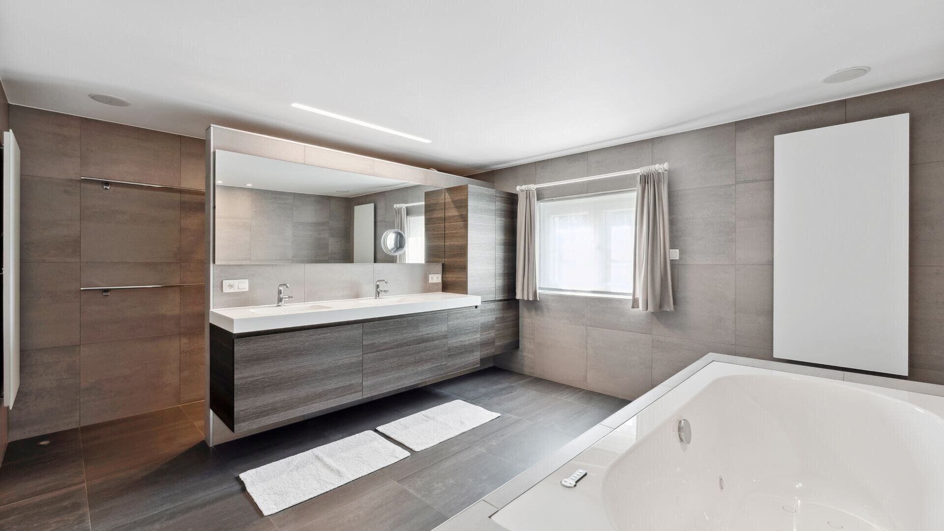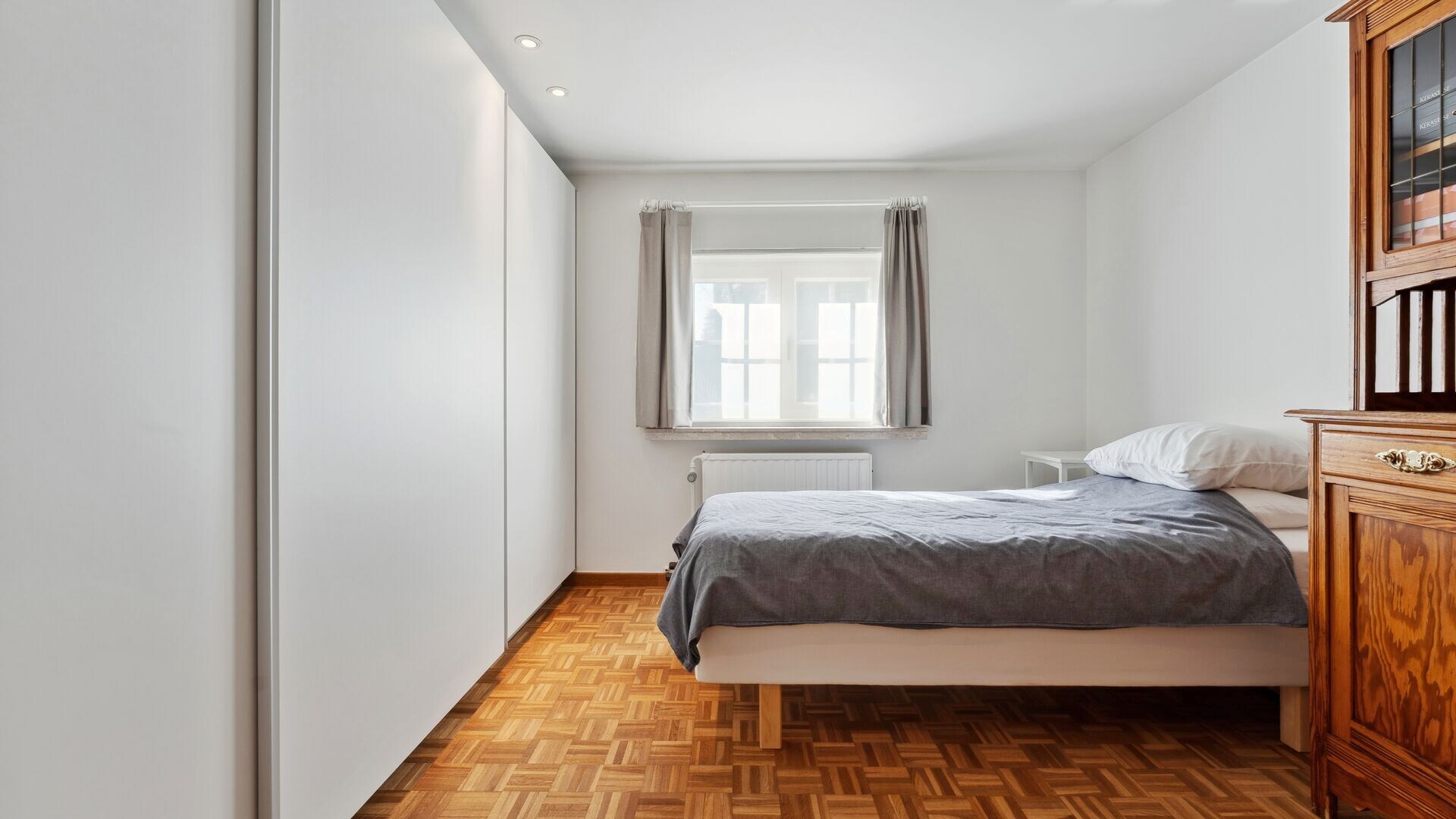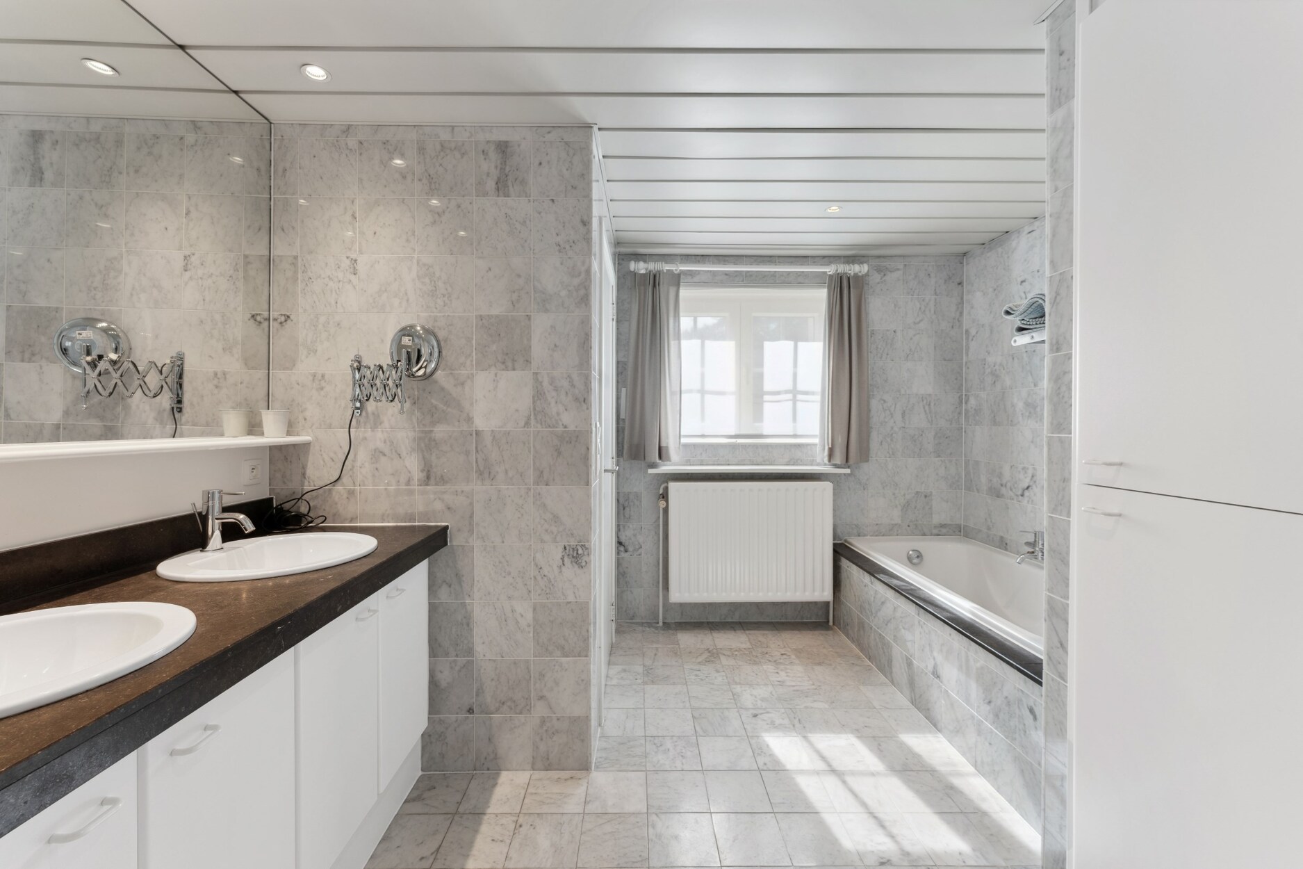 De trap brengt u tot de bovenverdieping. De ruime overloop biedt toegang tot de 4 slaapkamers en badkamer. De badkamer werd volledig vernieuwd en is voorzien van een ligbad, inloopdouche en dubbele wastafel in meubel. Apart toilet op de nachthal aanwezig. De masterbedroom is voorzien van een inloopdressing.