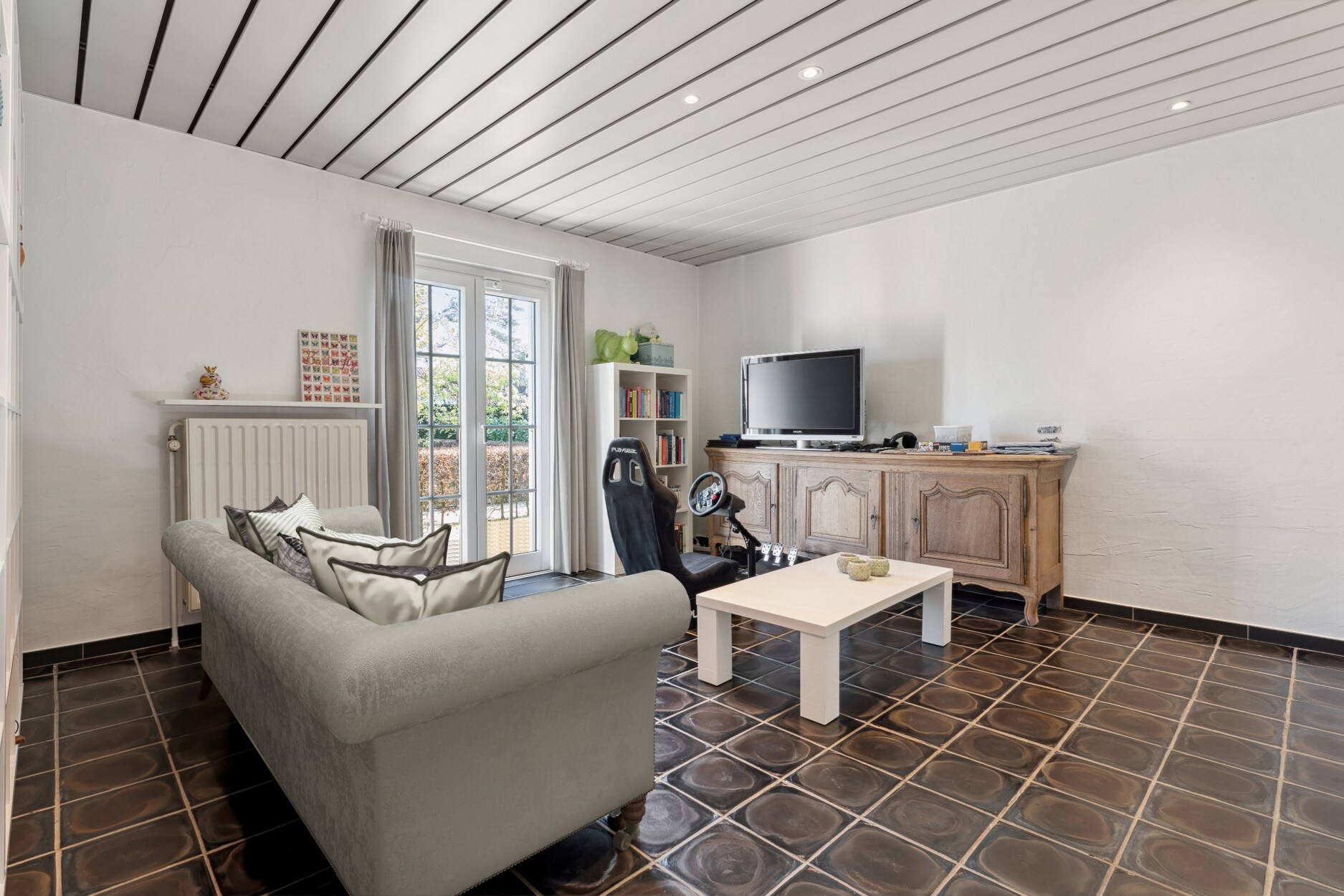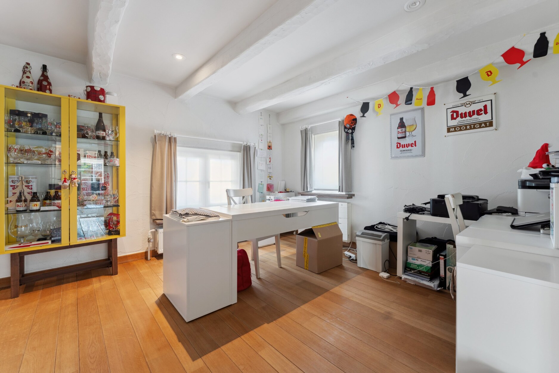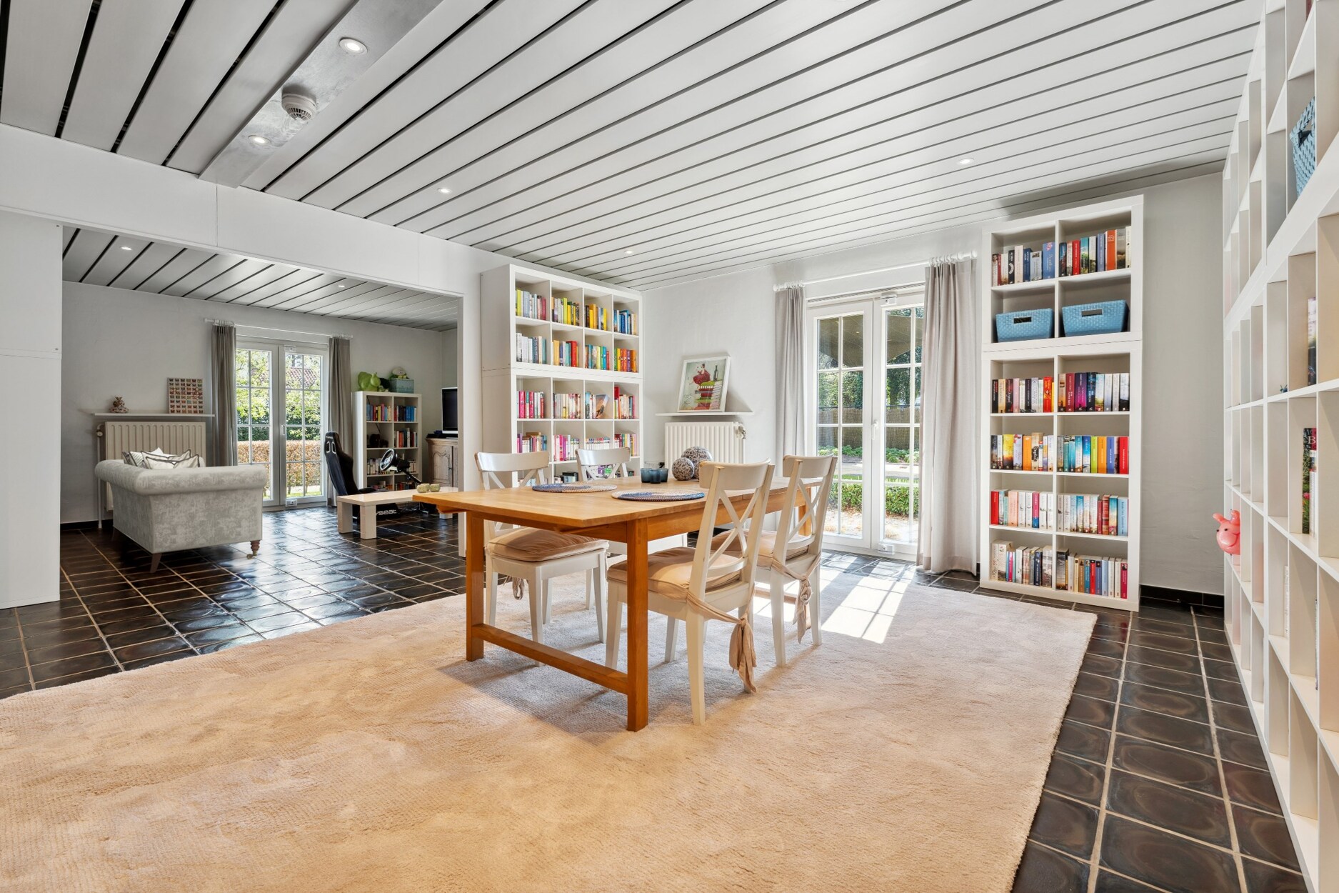 Links van de villa bevinden zich de leefruimten op parket met o.a. een gezellige zithoek met gashaard, een tweede zit/ TV- hoek met zicht op de tuin en vooraan een grote aparte ruimte - af te sluiten met een deur -, dewelke dienst kan doen als kantoor, extra TV hoek, bibliotheek. Deze ruimte is ook toegankelijk vanuit de inkomhal.