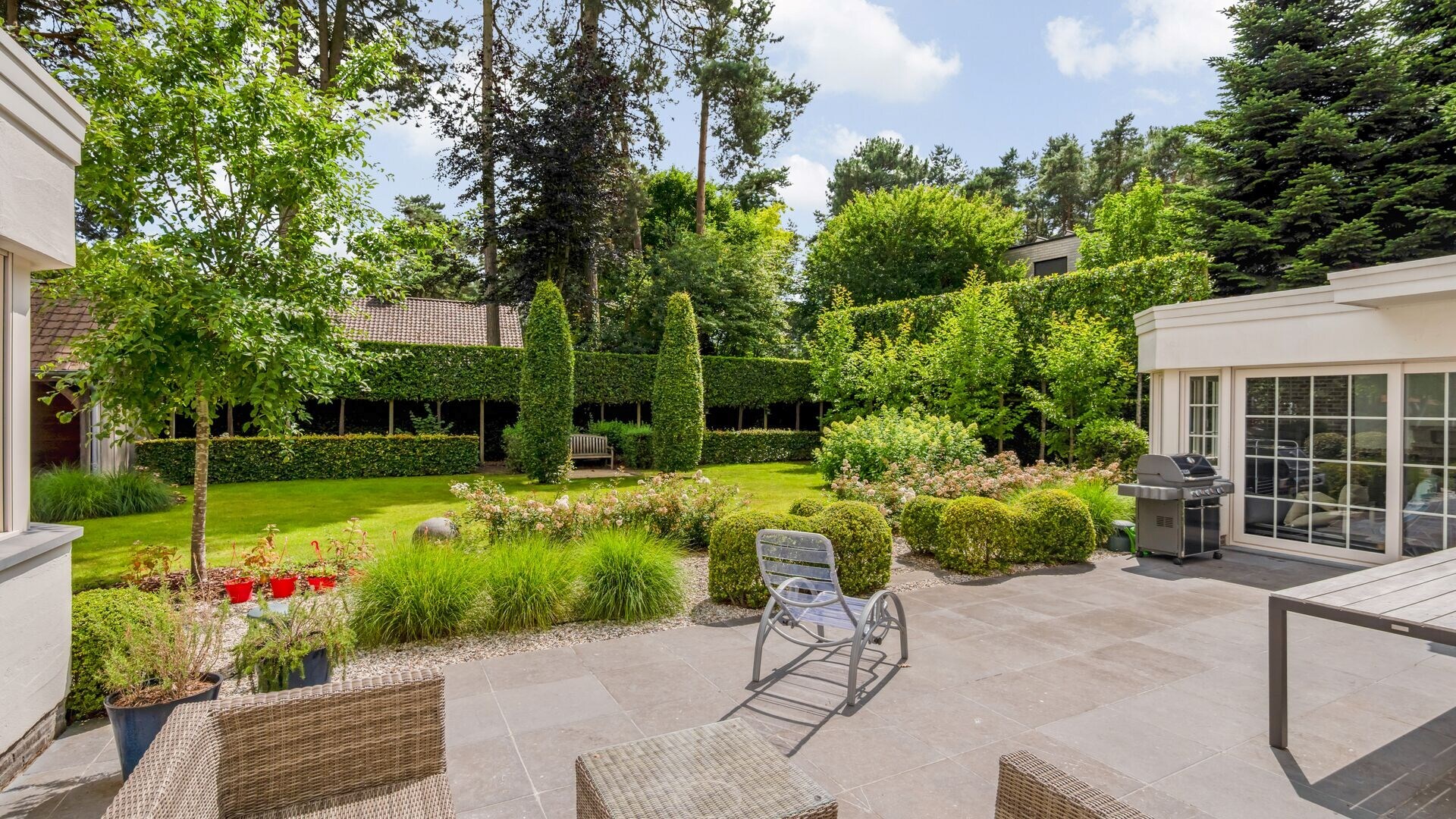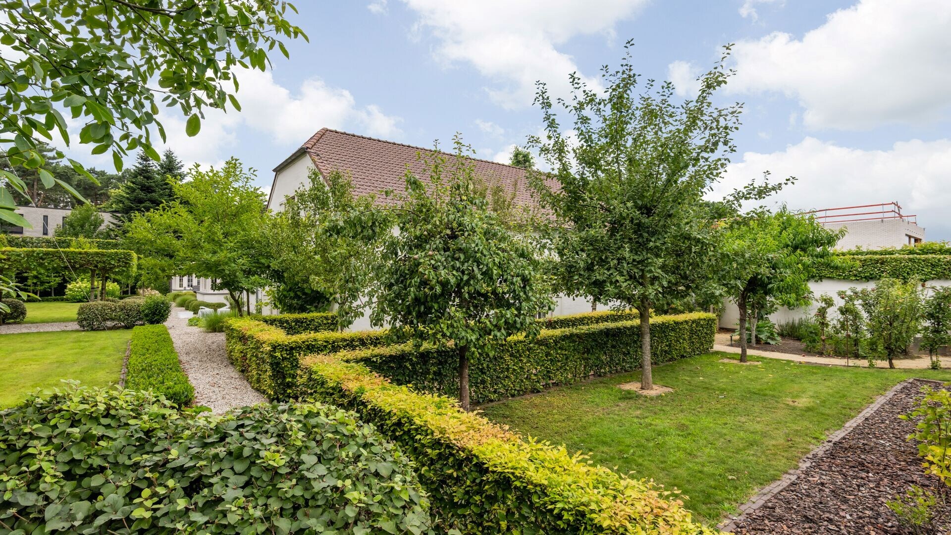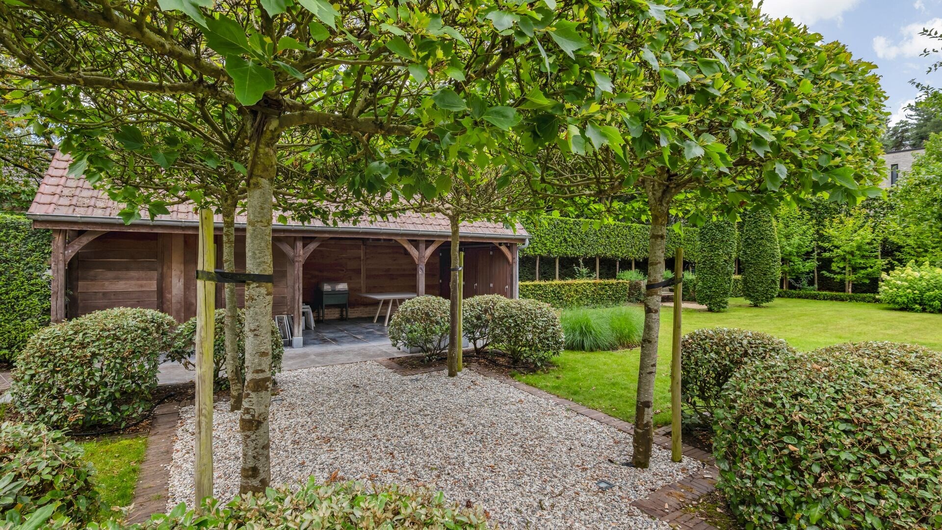 De tuin is schitterend aangelegd met zuid gerichte terrassen voorzien van zonneluifel aanpalend de woning en een overdekt terras achteraan in de tuin. Ruime tuinberegening aanwezig. De tuin is eveneens via de naastliggende straat toegankelijk d.m.v. een afgesloten toegangspoort.