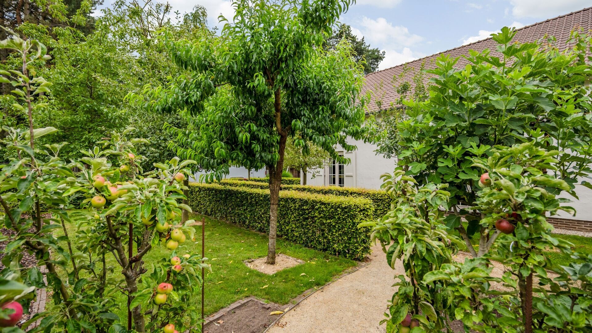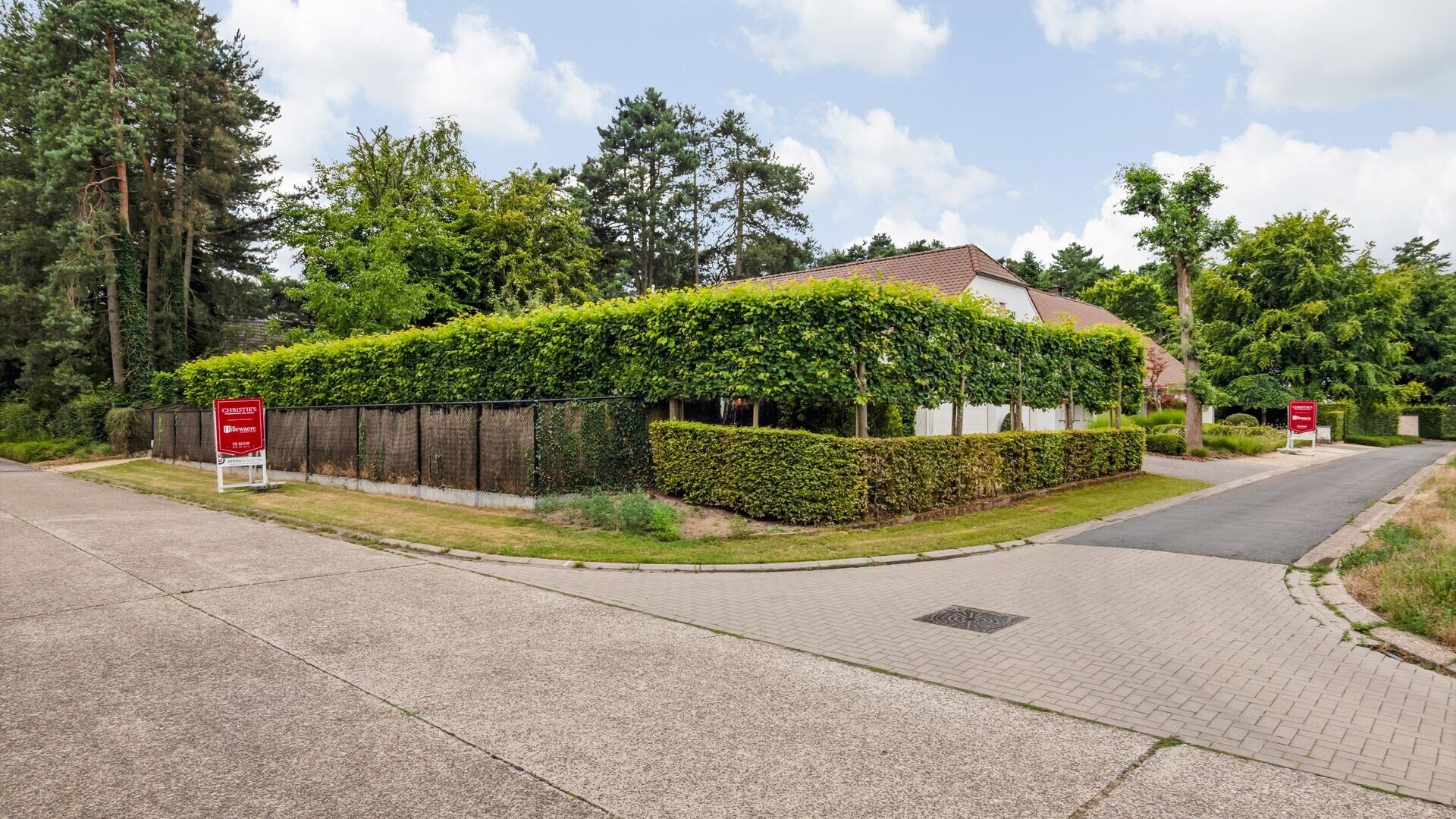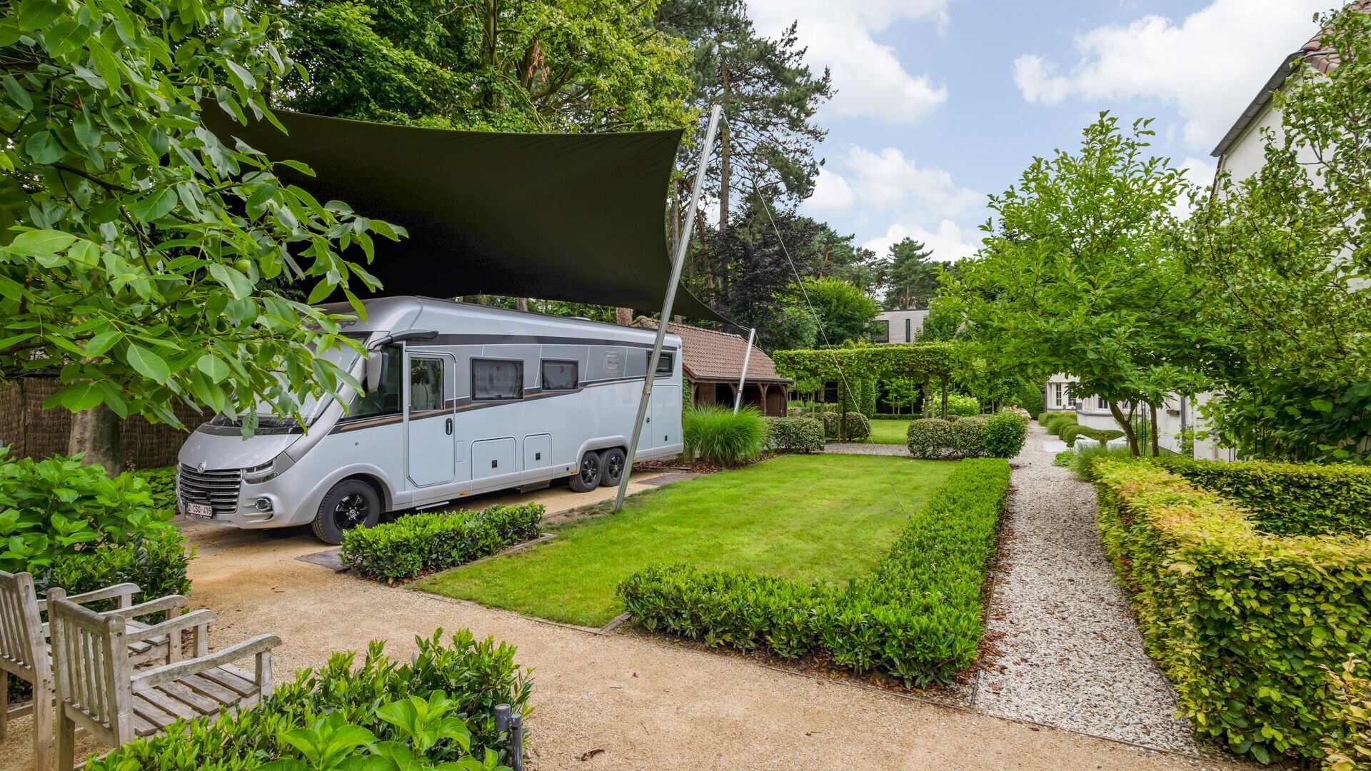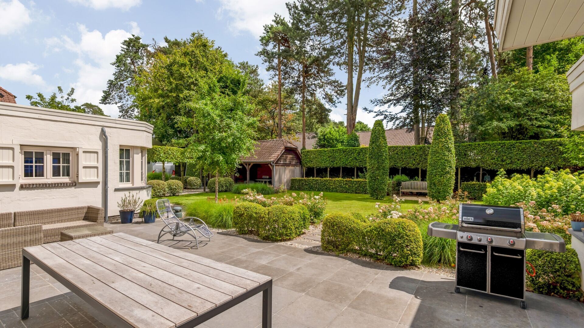 De tuin is schitterend aangelegd met zuid gerichte terrassen voorzien van zonneluifel aanpalend de woning en een overdekt terras achteraan in de tuin. Ruime tuinberegening aanwezig. De tuin is eveneens via de naastliggende straat toegankelijk d.m.v. een afgesloten toegangspoort.