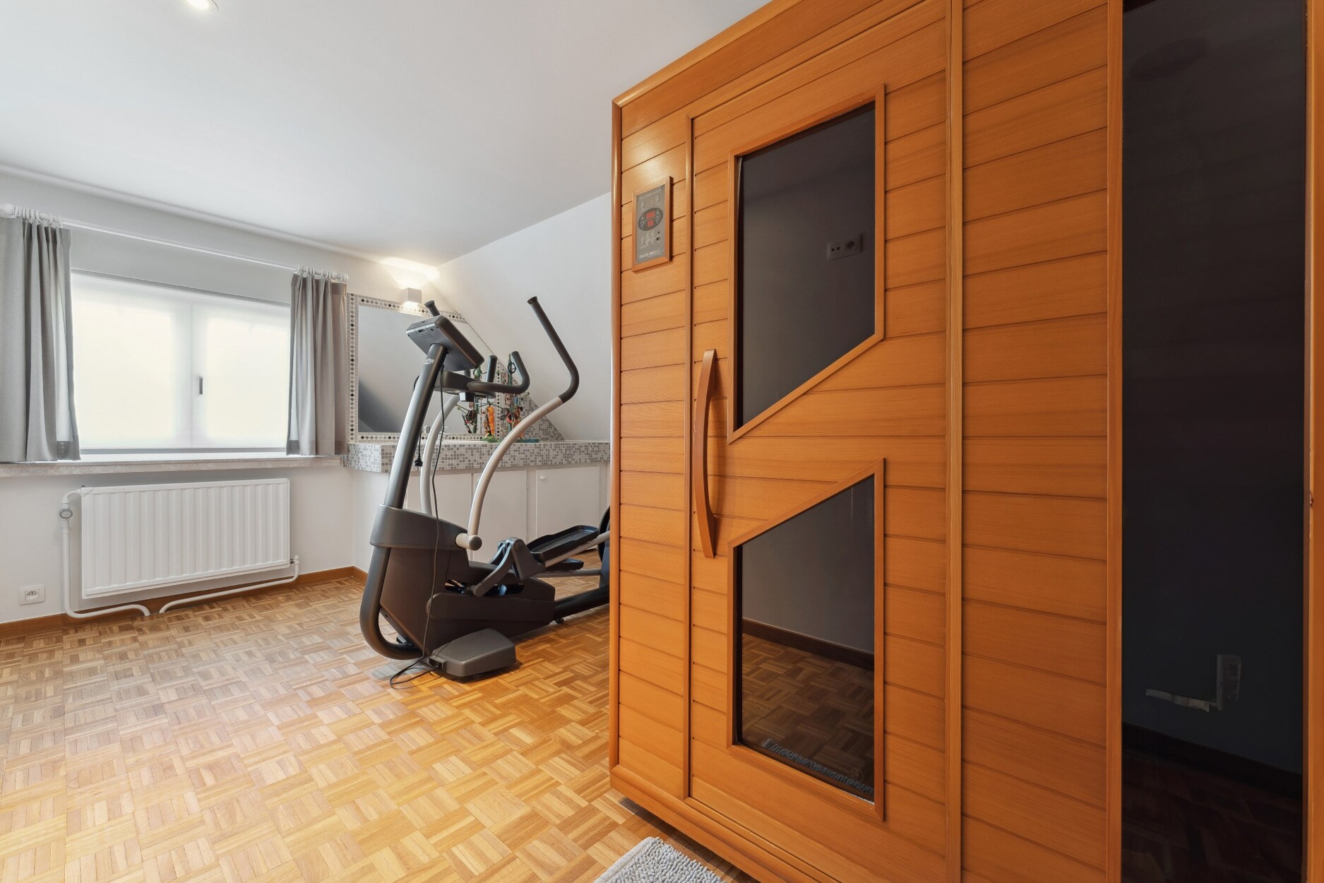 Verder op het gelijkvloers vindt u een gastenverblijf bestaande uit een woonkamer, eetkamer, slaapkamer, volledig geïnstalleerde keuken en een badkamer. De badkamer is voorzien van een ligbad, douche, dubbele lavabo in meubel en een apart toilet. Het gastenverblijf beschikt over een dubbele inpandige garage en een zéér ruime zolder(125m²), DE ideale ruimte om nog extra slaapkamers bij te creëren. Via de ruime trap in de dubbele inpandige garage hebt u extra toegang tot de kelder(300m²). De woning is volledig onderkelderd. De kelder is uitgerust met een bar en voldoende opslagruimte. De ideale ontspanningsruimte!