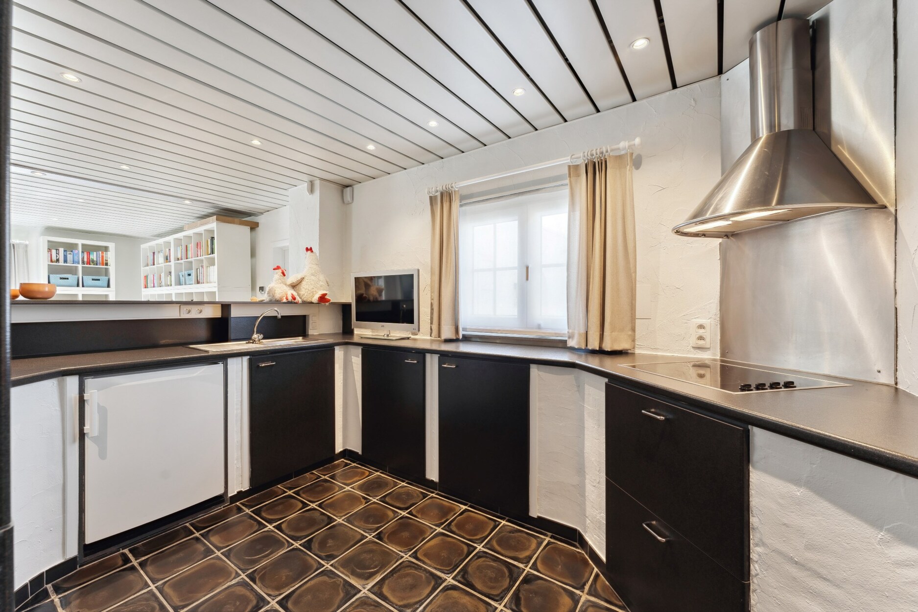 De inkomhal met vestiaireruimte en ruim gastentoilet biedt toegang tot de woonkamer en kantoorruimte. Via de woonkamer hebt u toegang tot de keuken met aparte eethoek. De keuken is compleet ingericht met apparatuur en biedt alle comfort. De keuken geeft toegang tot de kelder en toegang tot de zeer ruime berging en wasplaats, dewelke voorzien is van ingemaakte kasten. Verder nog de eerste inpandige garage.