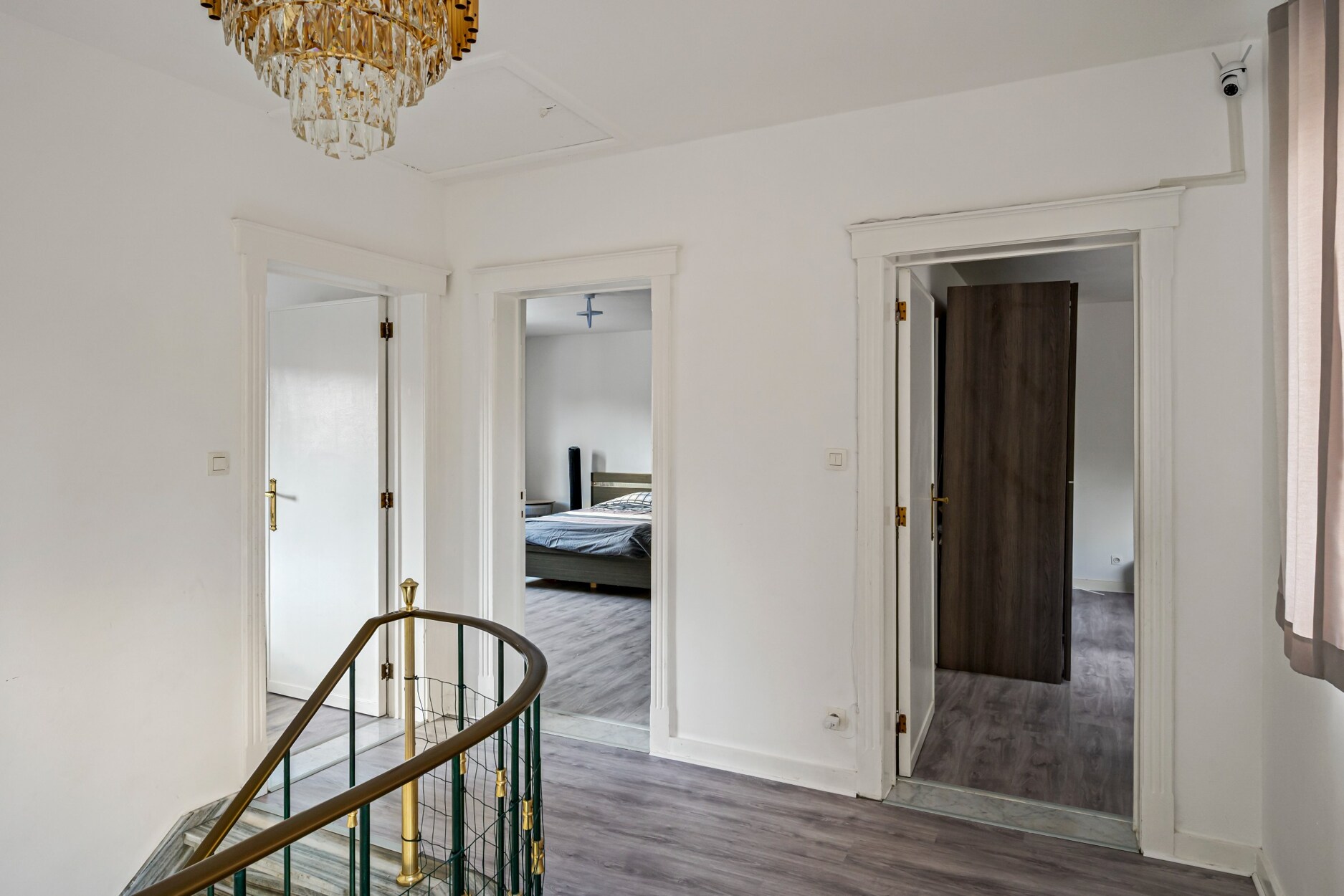 We nemen de trap vanuit de inkomhal naar de eerste verdieping. De overloop verbindt de verschillende slaapvertrekken en de badkamer. 3 slaapkamers, waarvan één masterbedroom. Een van de kamers heeft aansluitend een dressingruimte. De badkamer is uitgerust met een ligbad, wastafel, douche en een toilet. De slaapkamers boven, alsook de woonkamer en de keuken zijn voorzien van rolluiken.