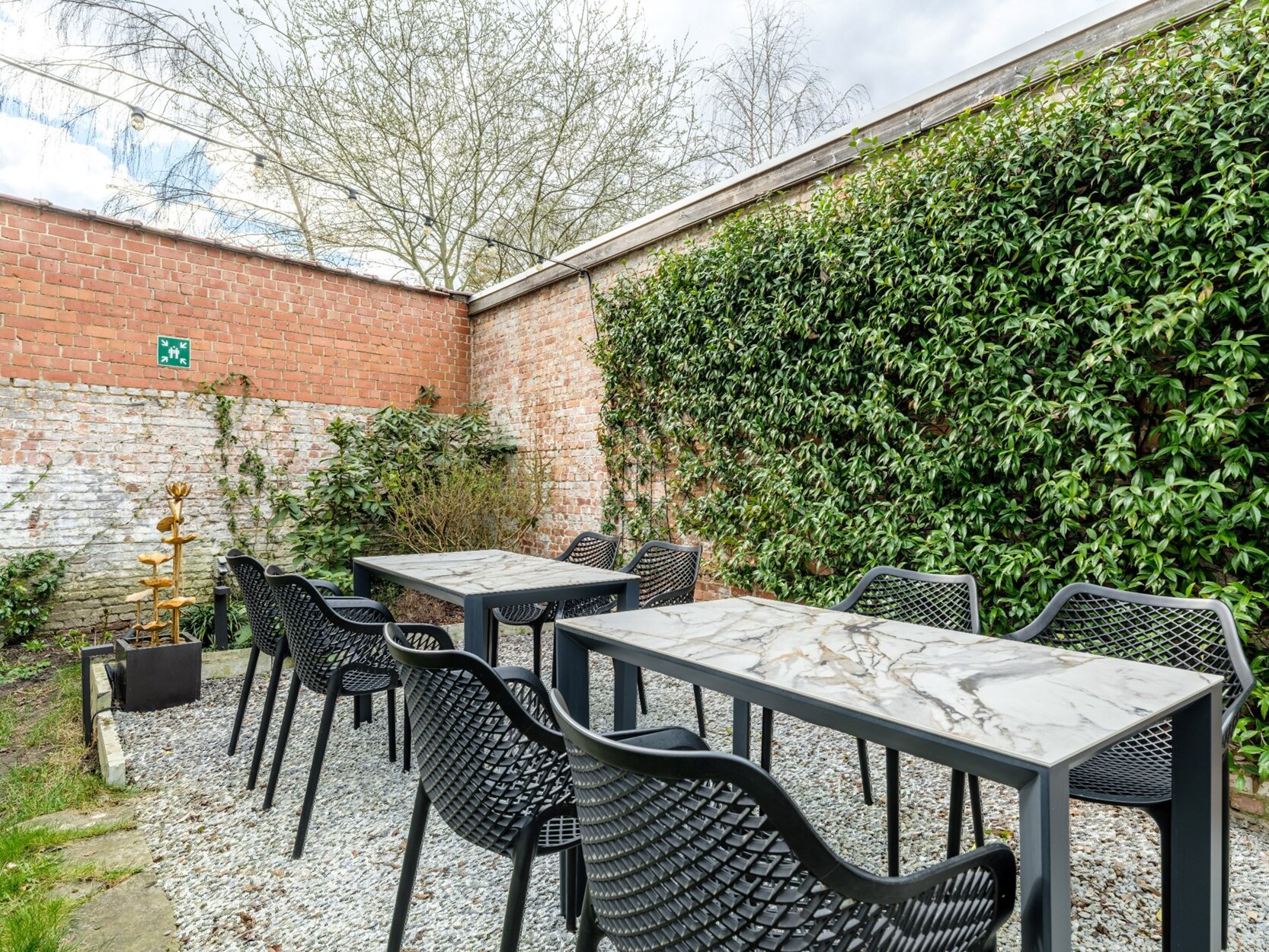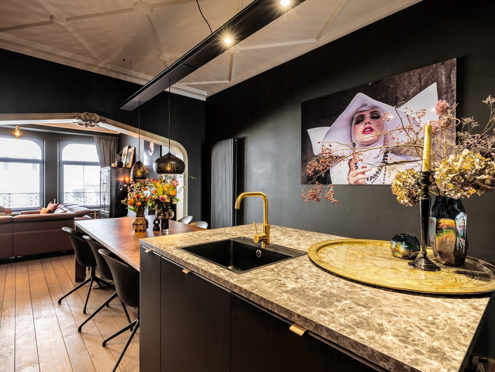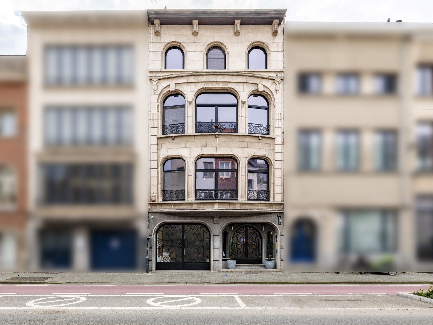 Bij binnenkomst word je verwelkomd in een indrukwekkende inkomhal die de grandeur van het pand meteen voelbaar maakt. Op het gelijkvloers bevinden zich een inpandige garage, een stijlvolle eetruimte, een keuken, een toilet en een bureauruimte. Vanuit de eetruimte heb je toegang tot een prachtige stadstuin, een oase van rust midden in de stad.