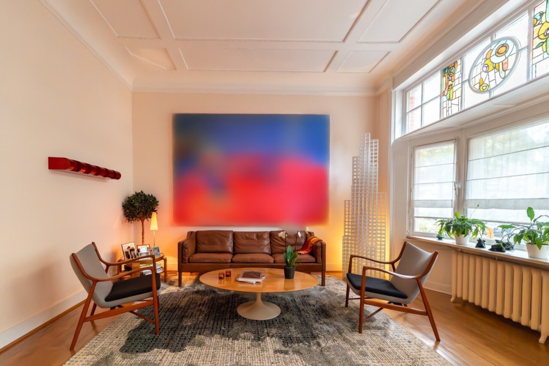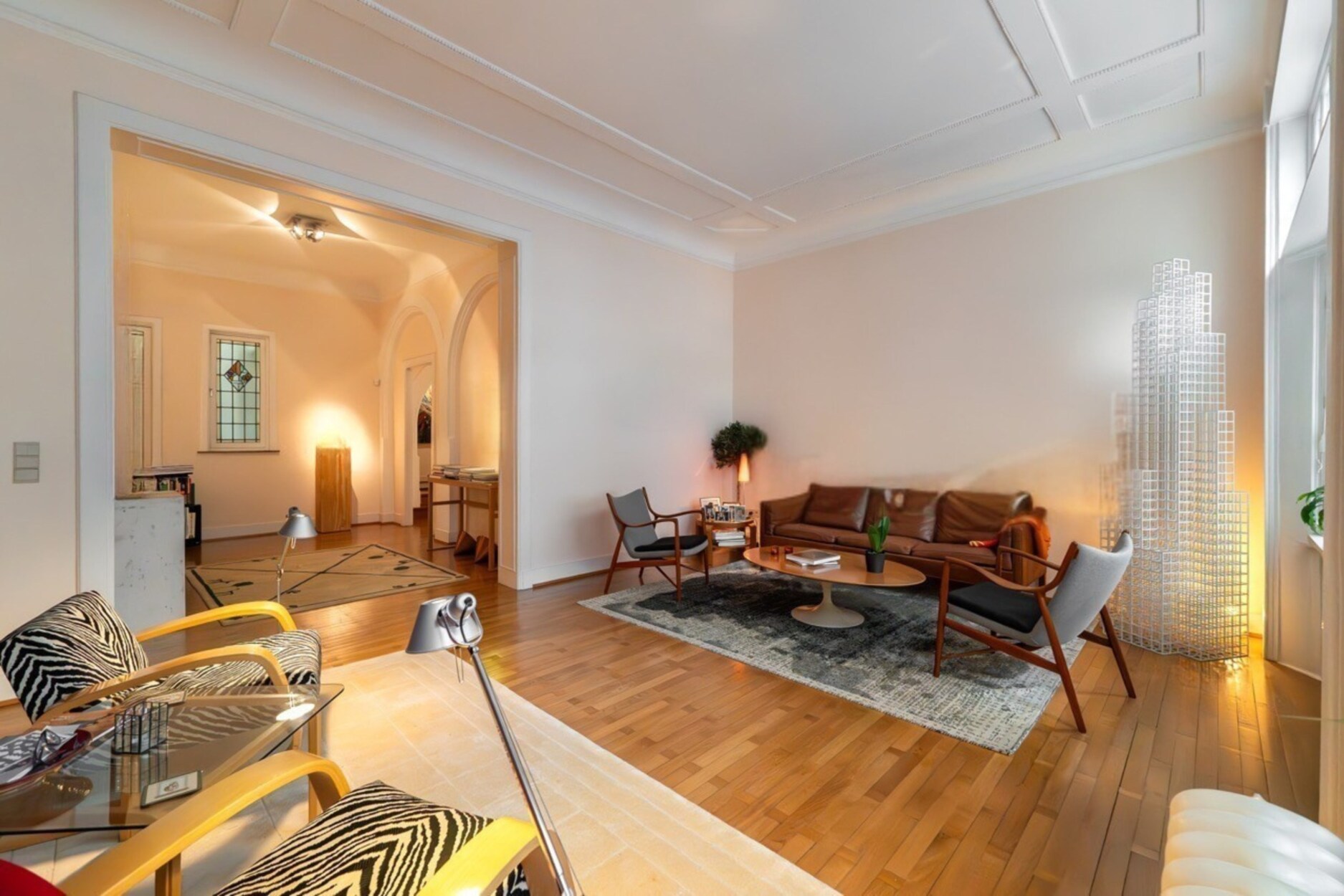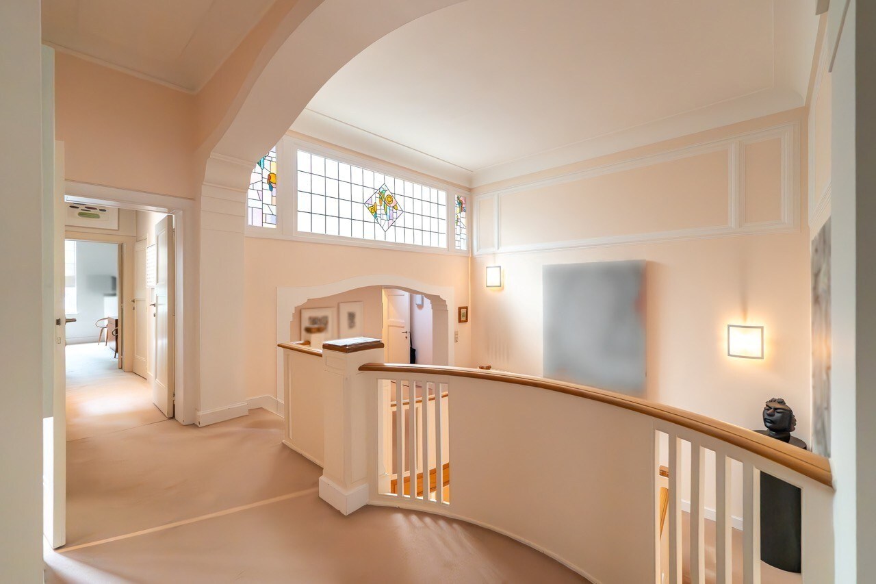 De benedenverdieping opent met een elegante inkomhal die leidt naar een ruime leefruimte met hoge moulureplafonds, marmeren open haarden en massieve parketvloeren, evenals een Bulthaup-keuken met toegang tot de tuin. Op de verdiepingen bevinden zich vijf slaapkamers, vijf badkamers, een bureau en twee dressings. De zolderverdieping biedt bijkomende inrichtbare ruimte.