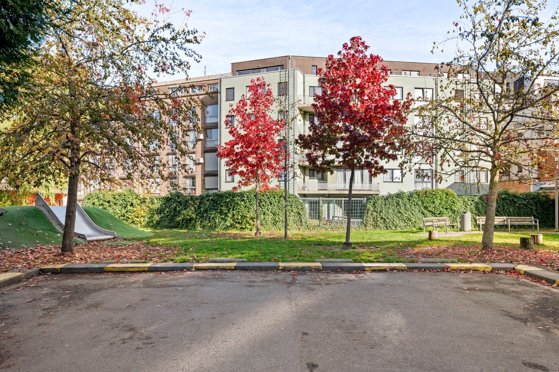 Achteraan bevindt zich de ruime slaapkamer met aansluitende dressing, die vandaag is ingericht als tweede slaapkamer. Het appartement wordt verwarmd via centrale verwarming op aardgas, met stijlvolle sierkasten die discreet in het interieur geïntegreerd zijn.