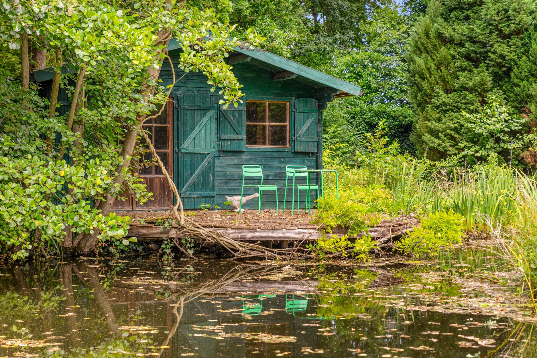 De leefruimtes kijken uit op een prachtig aangelegde tuin met vijver, een oase van rust.