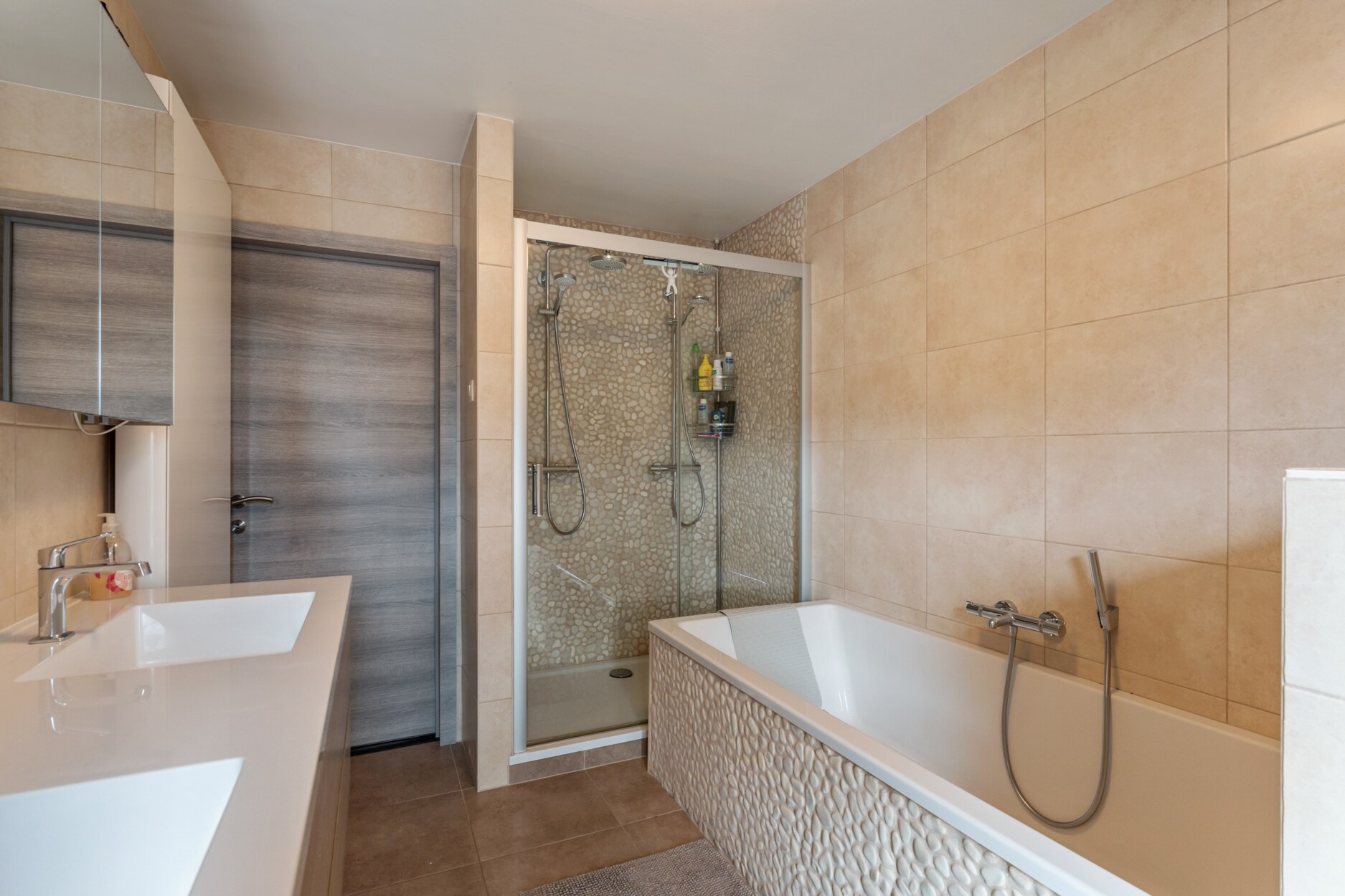 Op de eerste verdieping zijn er twee ruime slaapkamers met airconditioning en een grote badkamer. De badkamer heeft een dubbele wastafel, dubbele douche, bad en toilet.