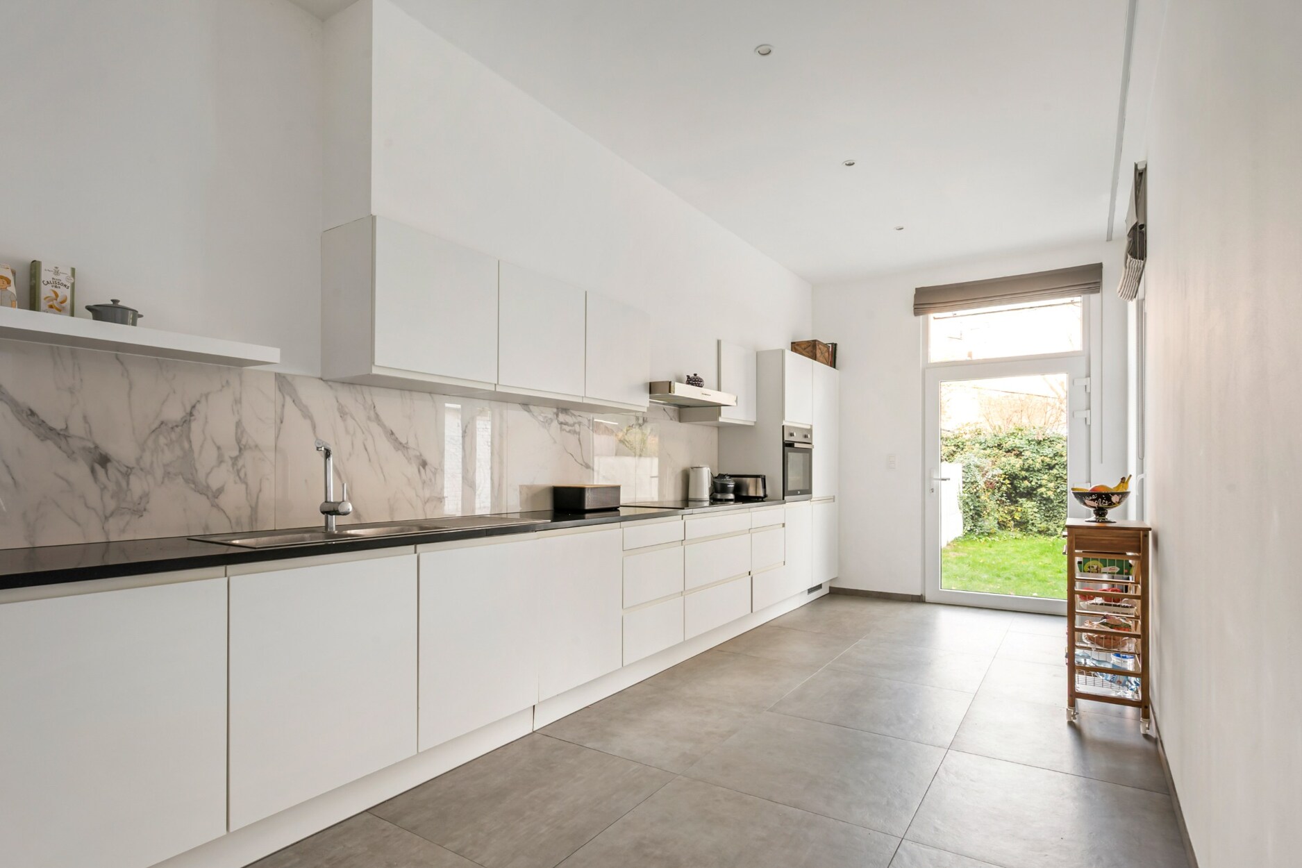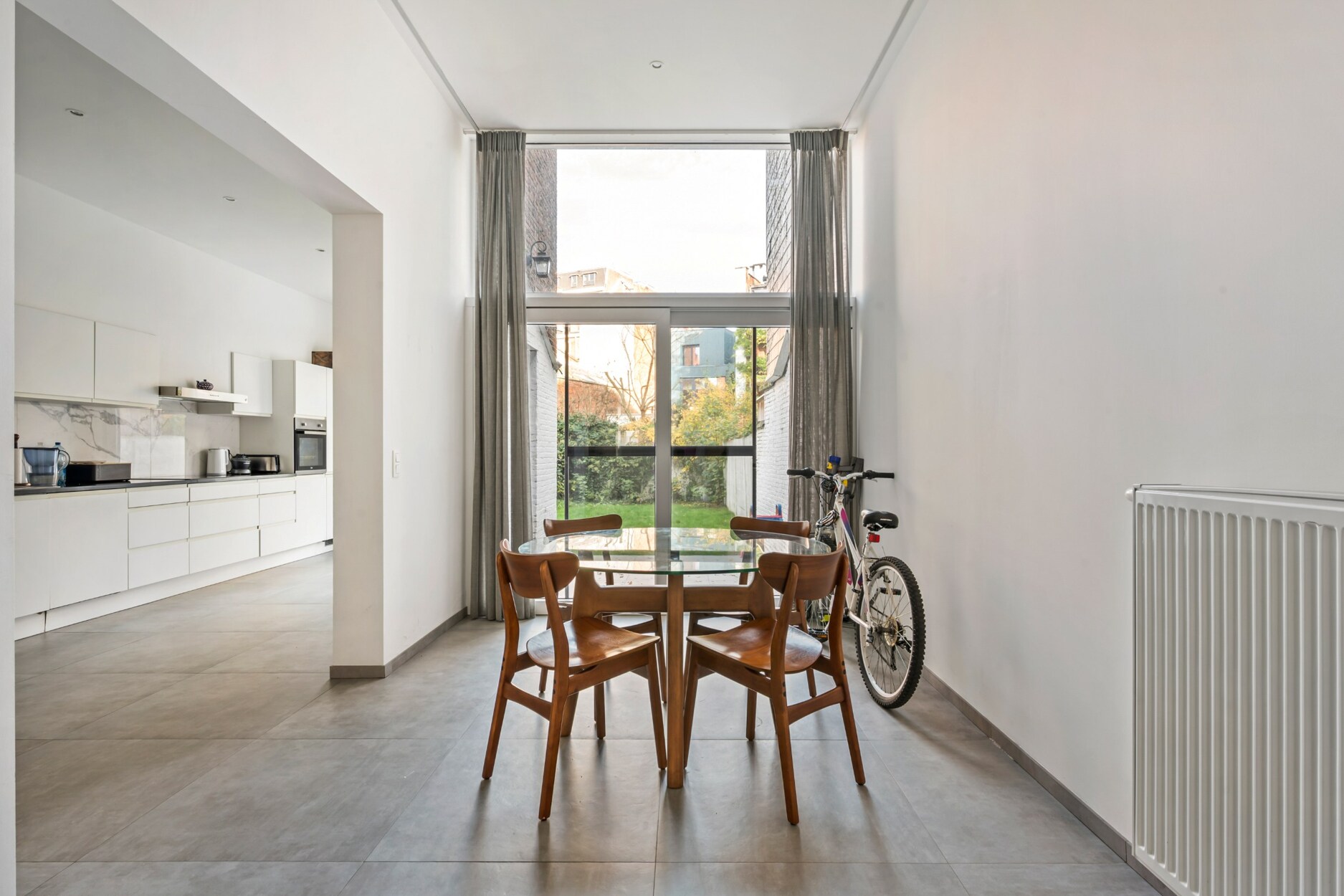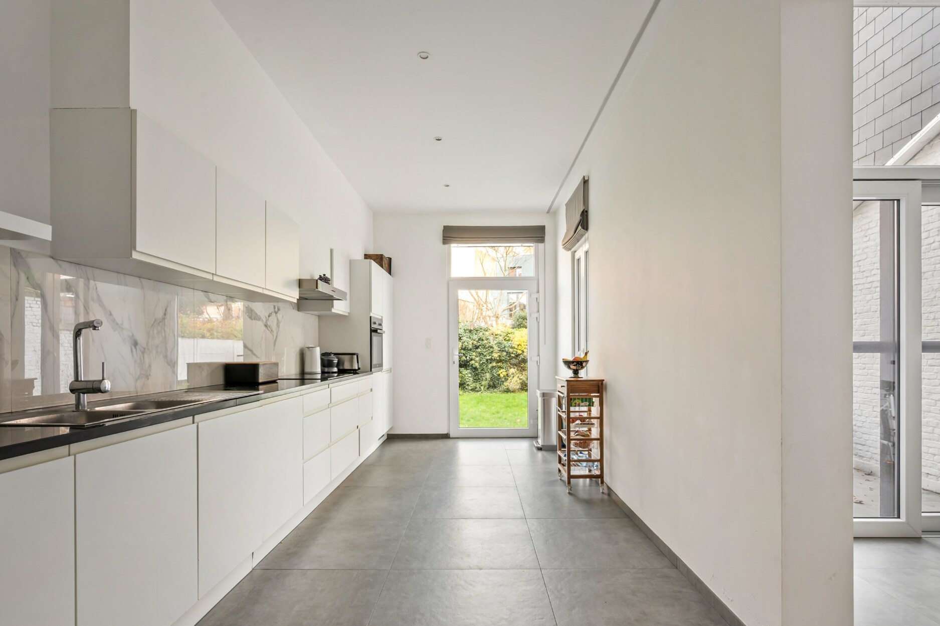 Het gelijkvloers omvat een ruime leefruimte met aansluitende eethoek en een volledig ingerichte keuken, beide met rechtstreekse toegang tot de aangename tuin. Deze indeling creëert een harmonie tussen binnen- en buitenleven en biedt een optimaal wooncomfort.