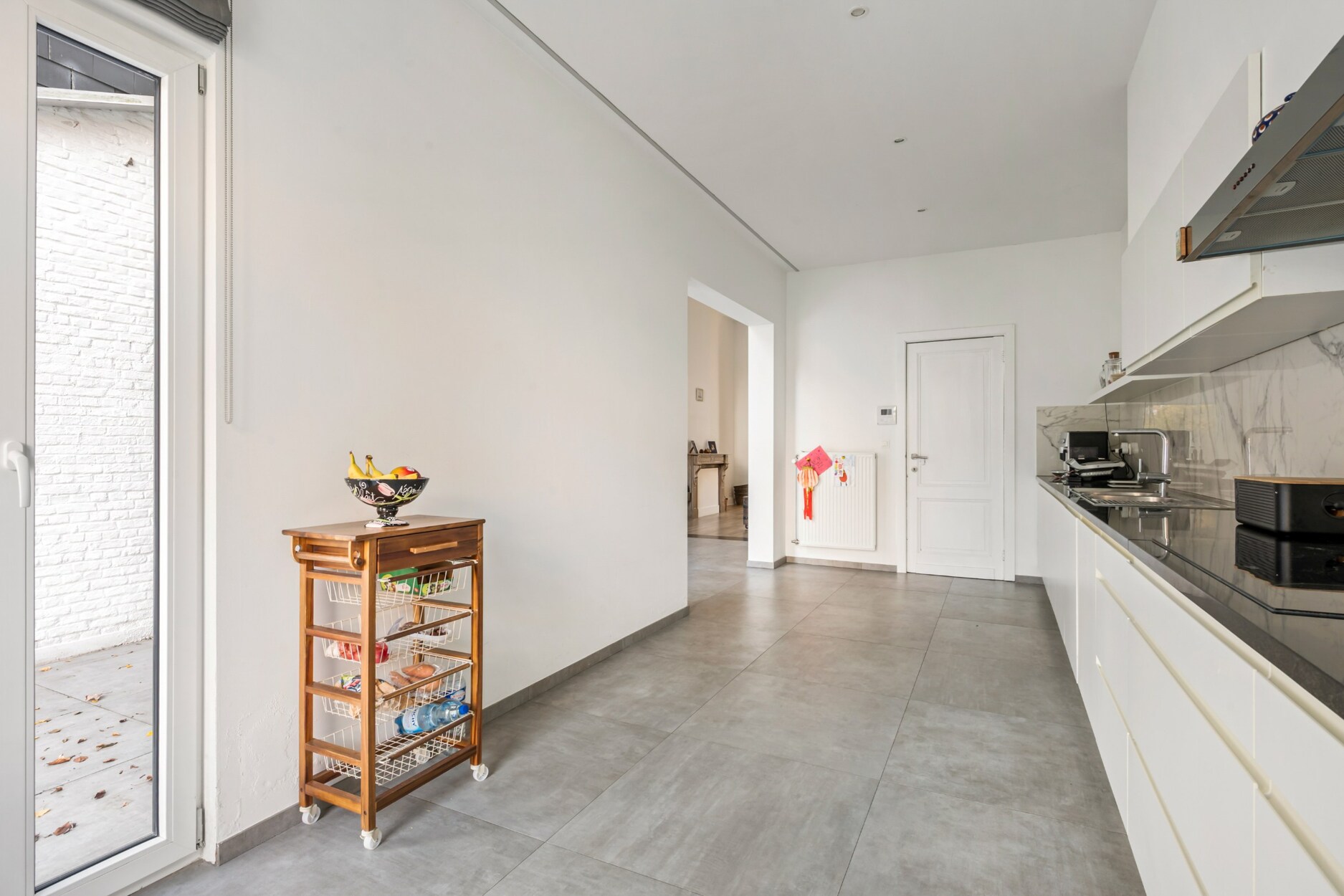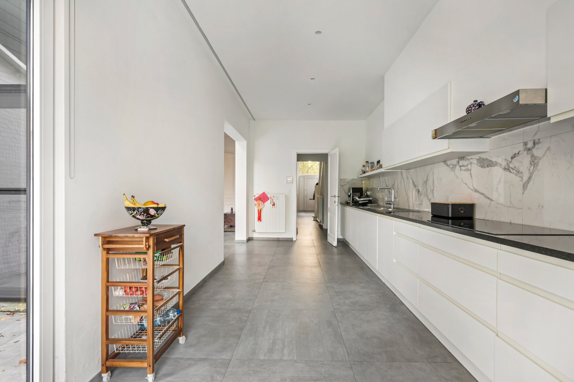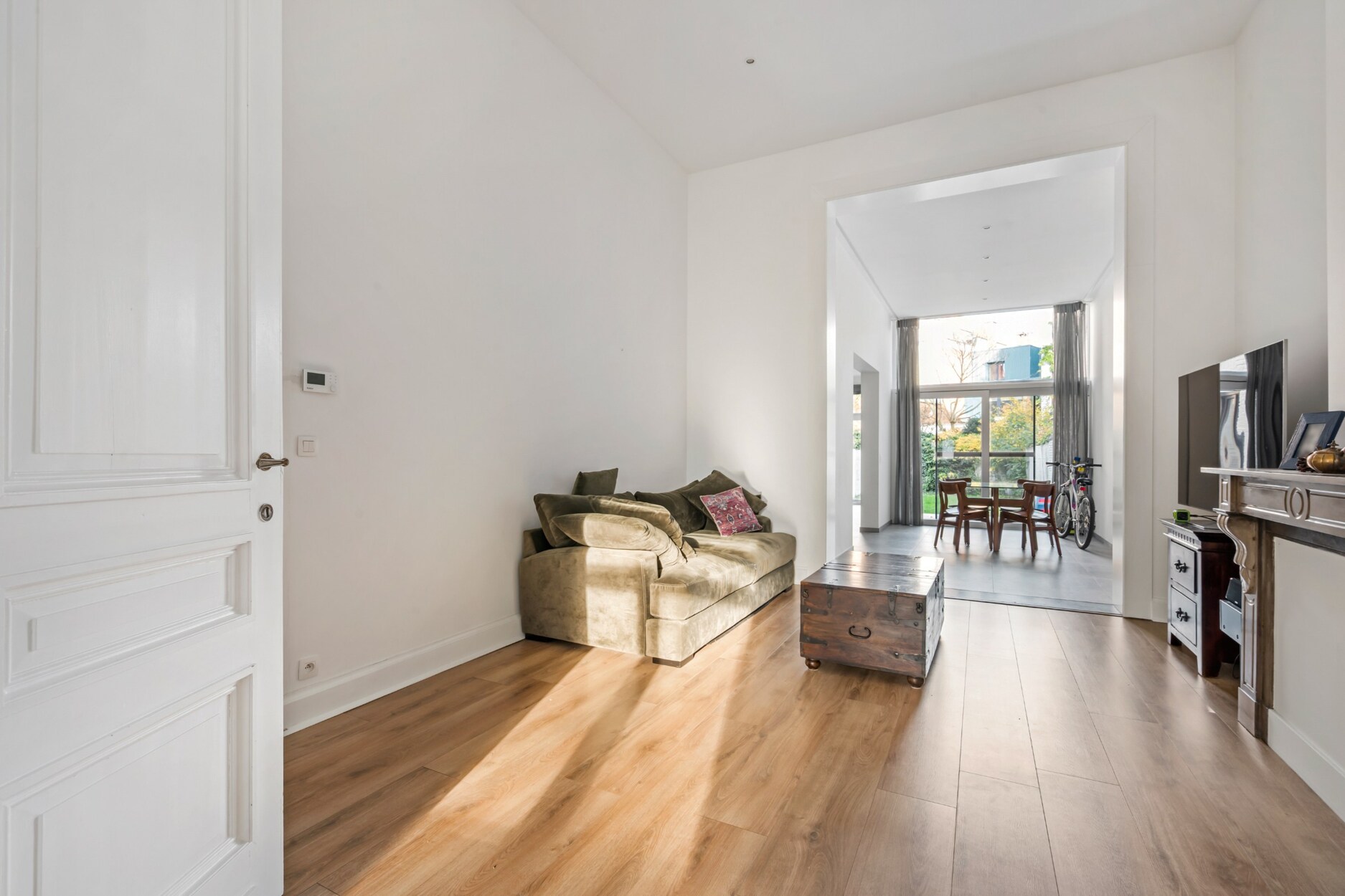Het gelijkvloers omvat een ruime leefruimte met aansluitende eethoek en een volledig ingerichte keuken, beide met rechtstreekse toegang tot de aangename tuin. Deze indeling creëert een harmonie tussen binnen- en buitenleven en biedt een optimaal wooncomfort.