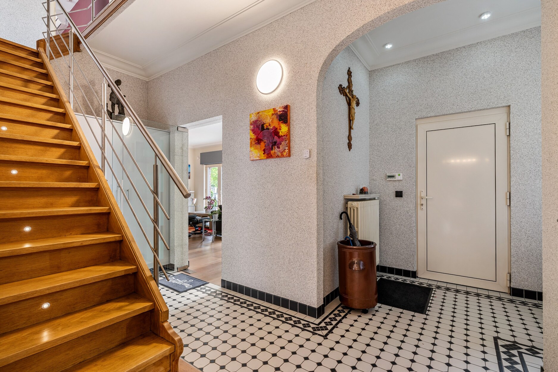 Inkomhal met gastentoilet, toegang tot ideaal gesitueerde bureau. Ruime en lichtrijke woonkamer met eetruimte voorzien van parketvloer. Open compleet uitgeruste keuken, naastgelegen praktische berging/strijkkamer. De gelijkvloerse badkamer en dito slaapkamer geven dit uitgekiend huis nog een extra troef.