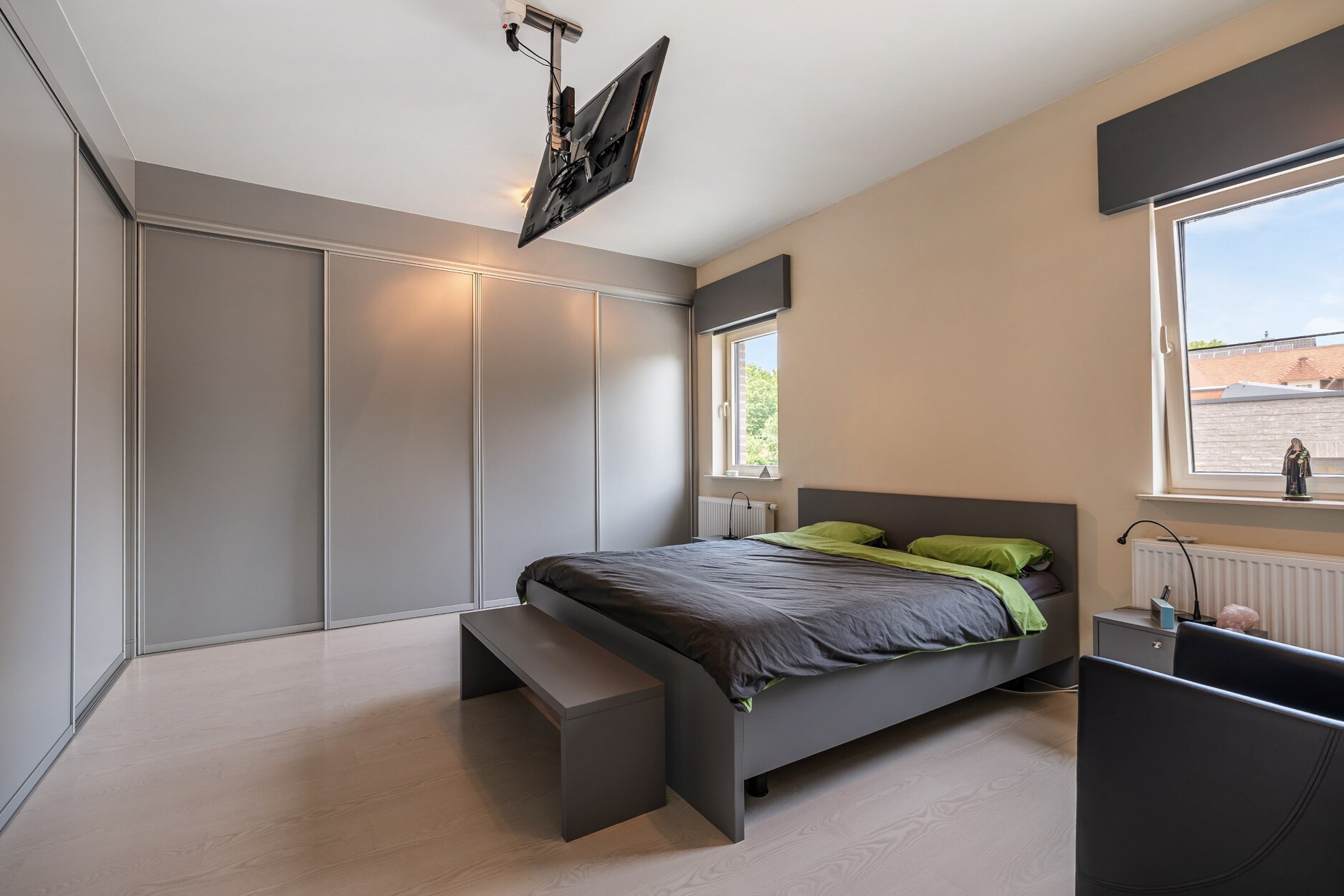 Op de verdieping is een 2e badkamer met 4 zeer ruime slaapkamers, allen voorzien van airco. De zolder/ 2 de verdieping is momenteel ingericht als 6e slaapkamer met dressing.