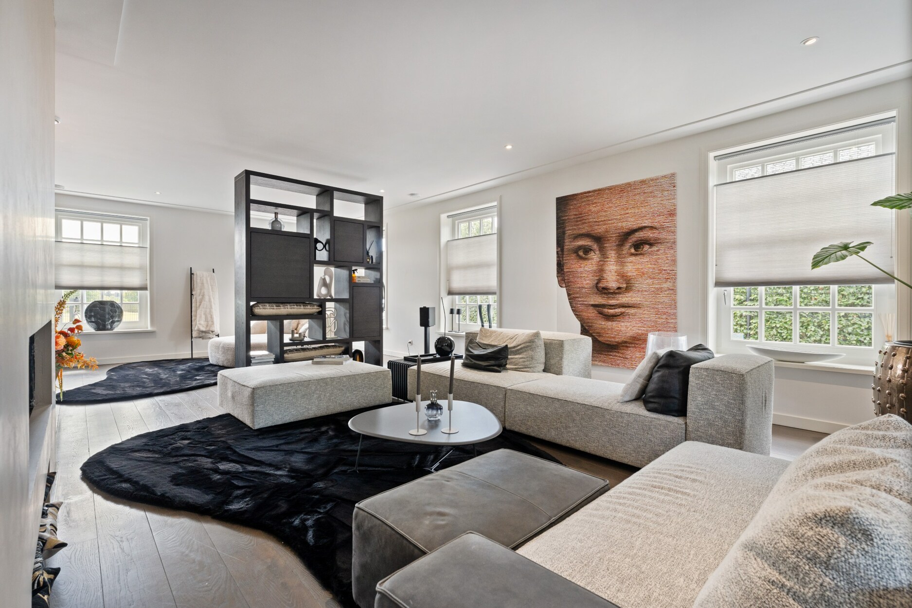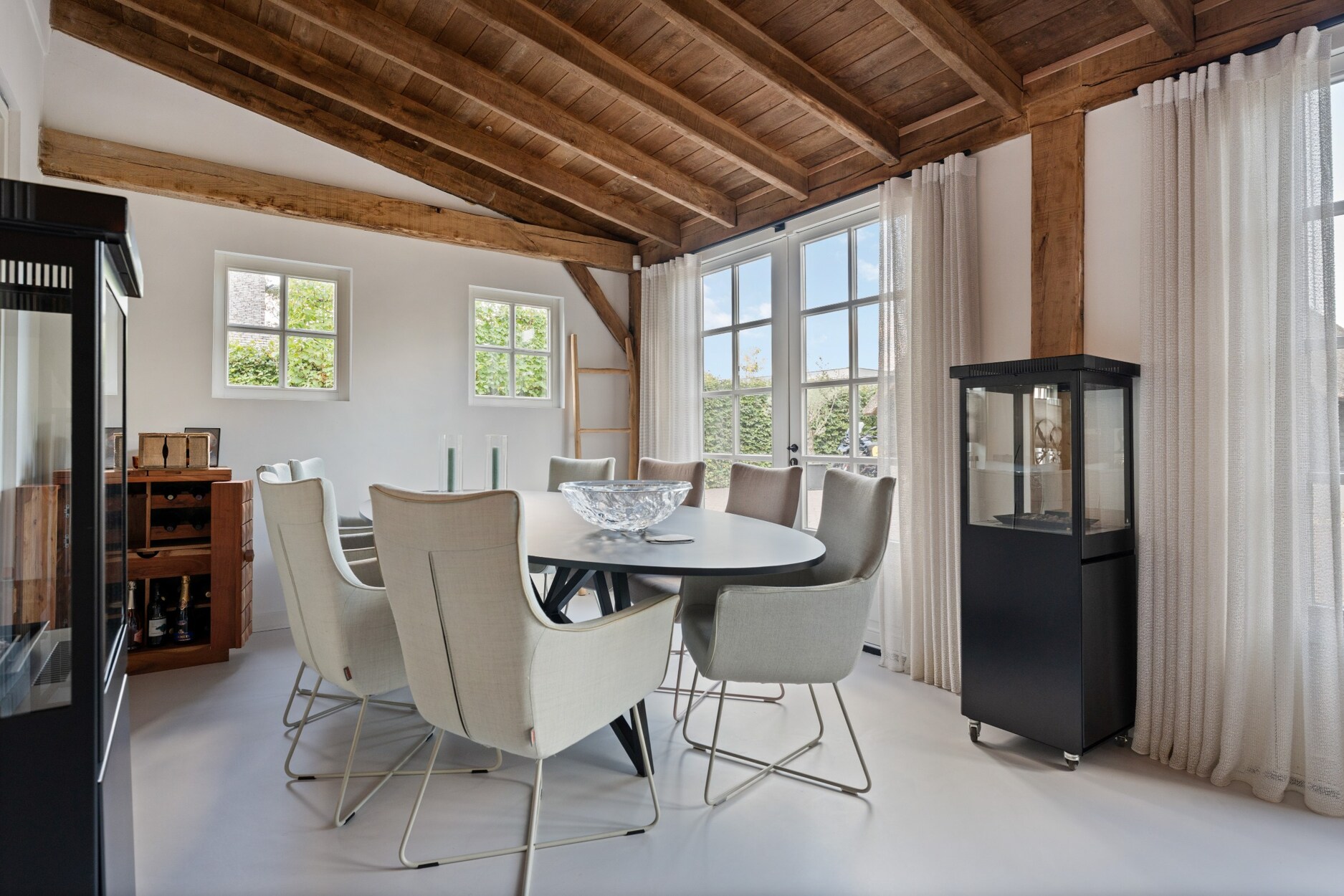 Aansluitend bevindt zich de gezellige woonkamer, voorzien van een sfeervolle gashaard en een prachtig zicht op de tuin. De tuinkamer achteraan maakt het plaatje compleet: een zalige plek om te genieten van elk seizoen in een rustgevend kader.