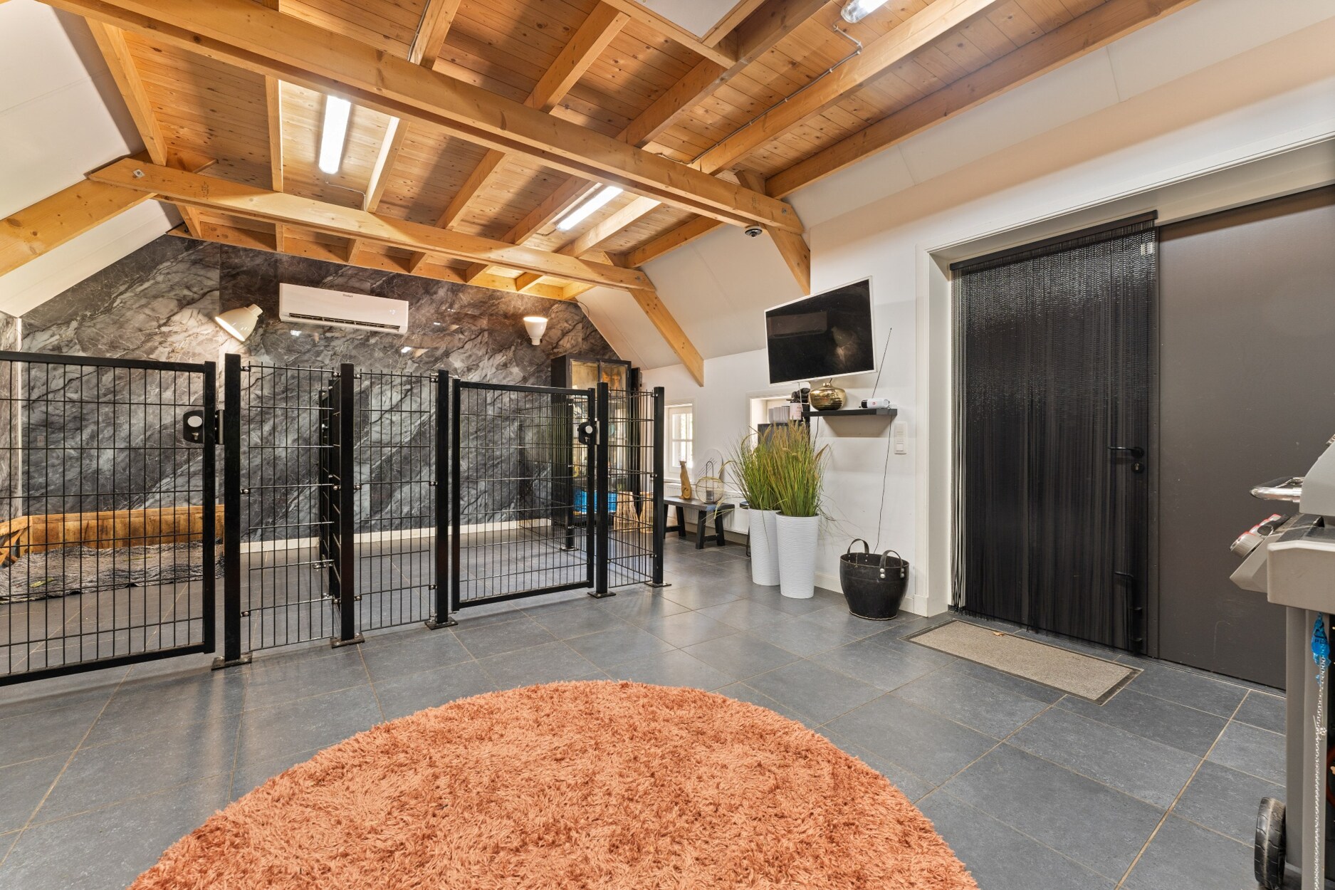 Via het oprit langs de woning is het ruime bijgebouw (ca. 70 m²) te bereiken – perfect als hobbyruimte, atelier of garagegebouw. Dit luxe bijgebouw is voorzien van airco, een wastafel en een ruime bergzolder. De 16 zonnepanelen liggen discreet op het dak van dit gebouw.