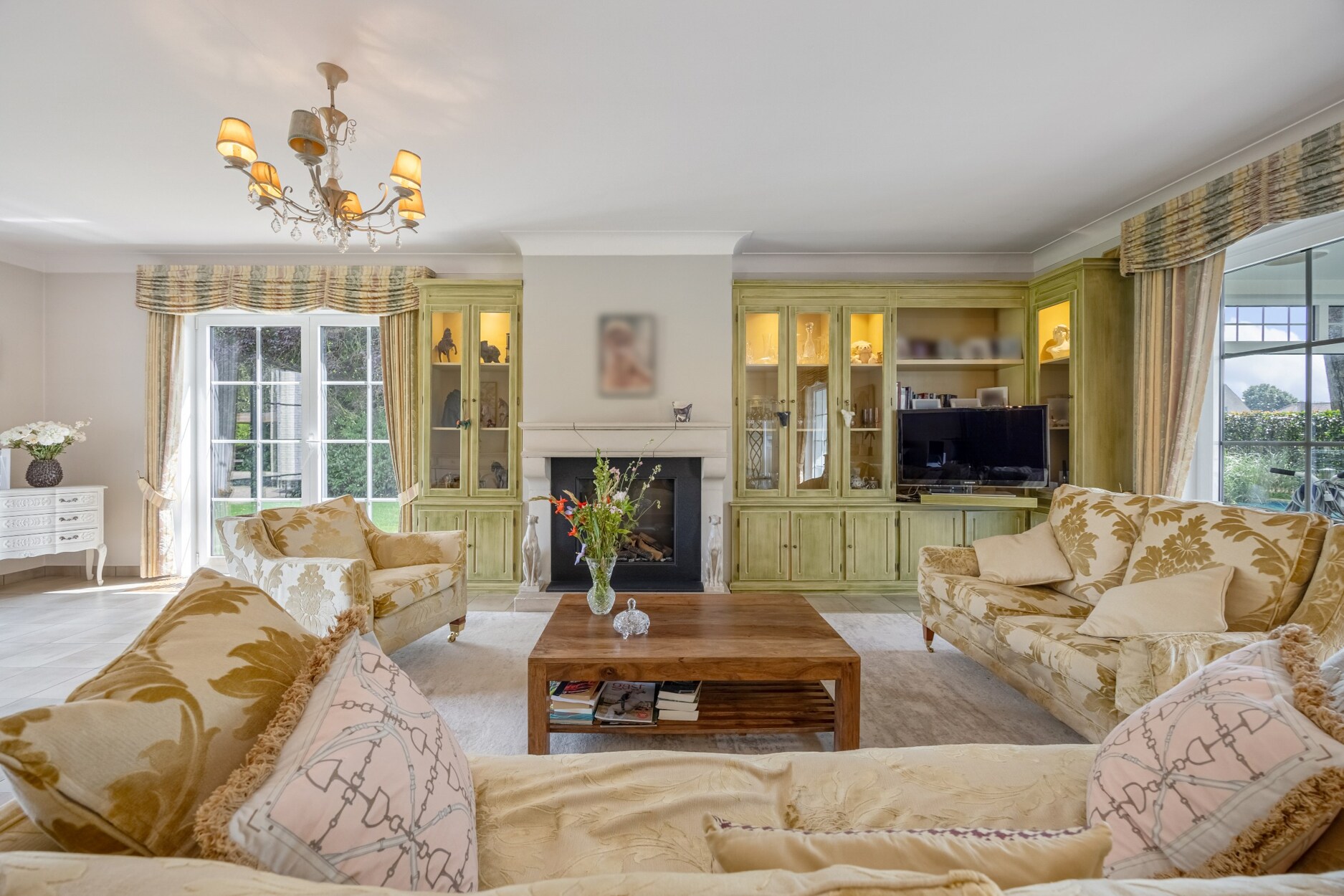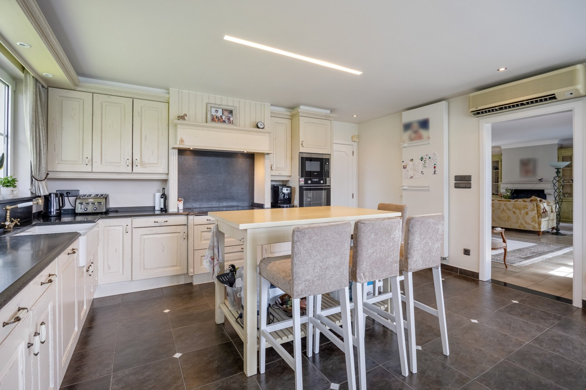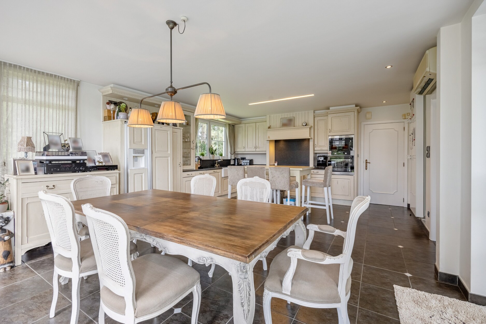 In de prachtige maatkeuken is compleet uitgerust en heeft een extra eetgedeelte met toegang tot het overdekt terras en de mooi aangelegde tuin. Van hieruit en alle andere leefruimtes is er een schitterend zicht op het zwembad en tuin. De centrale hal zorgt ervoor dat de alle kamers mooi in elkaar vloeien. We bereiken van hieruit ook het gastentoilet en de inpandige garage, kelder. De kelderruimte doet dienst doet als extra stockageruimte.