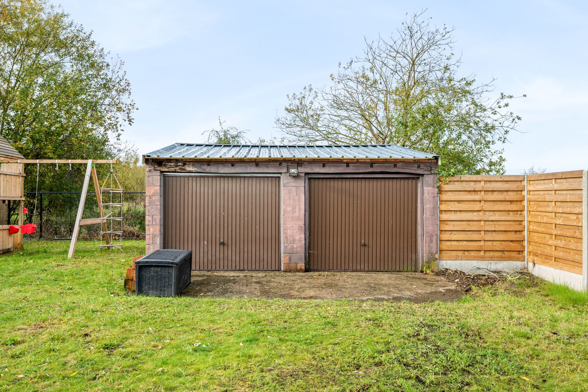 Achter in de tuin is een berging voorzien van 2 garagepoorten en een nieuw dak (11/2025)