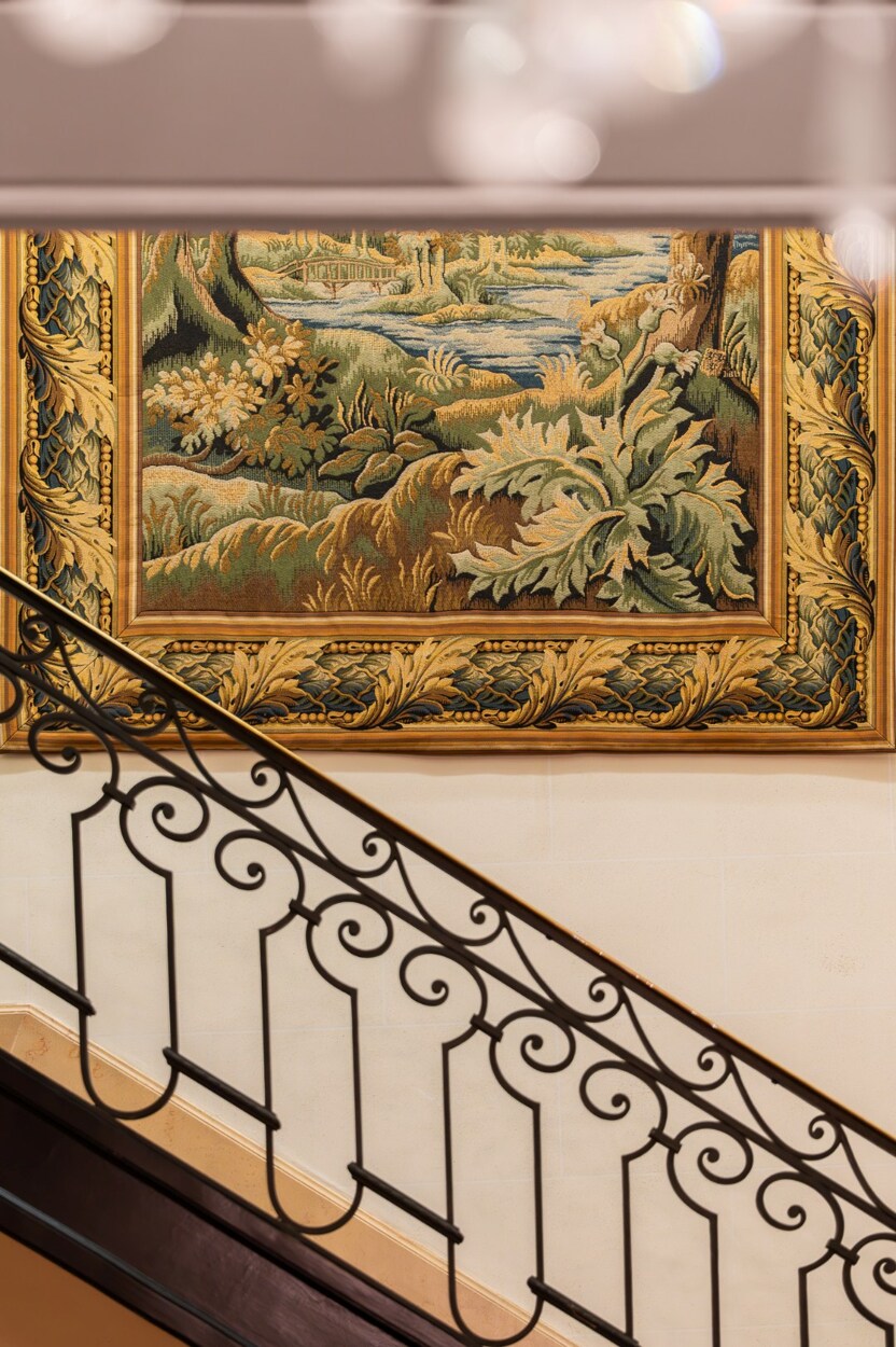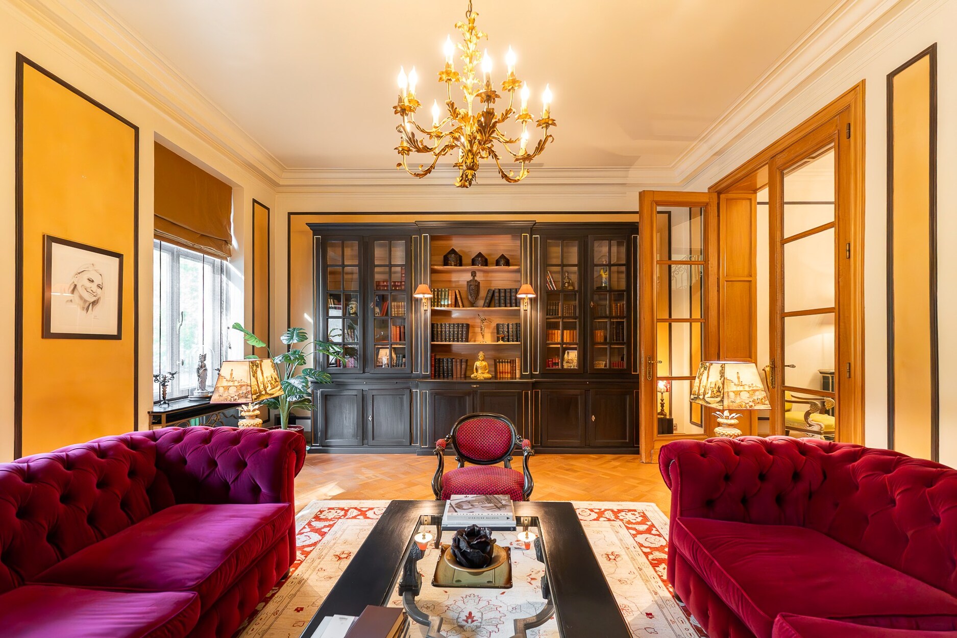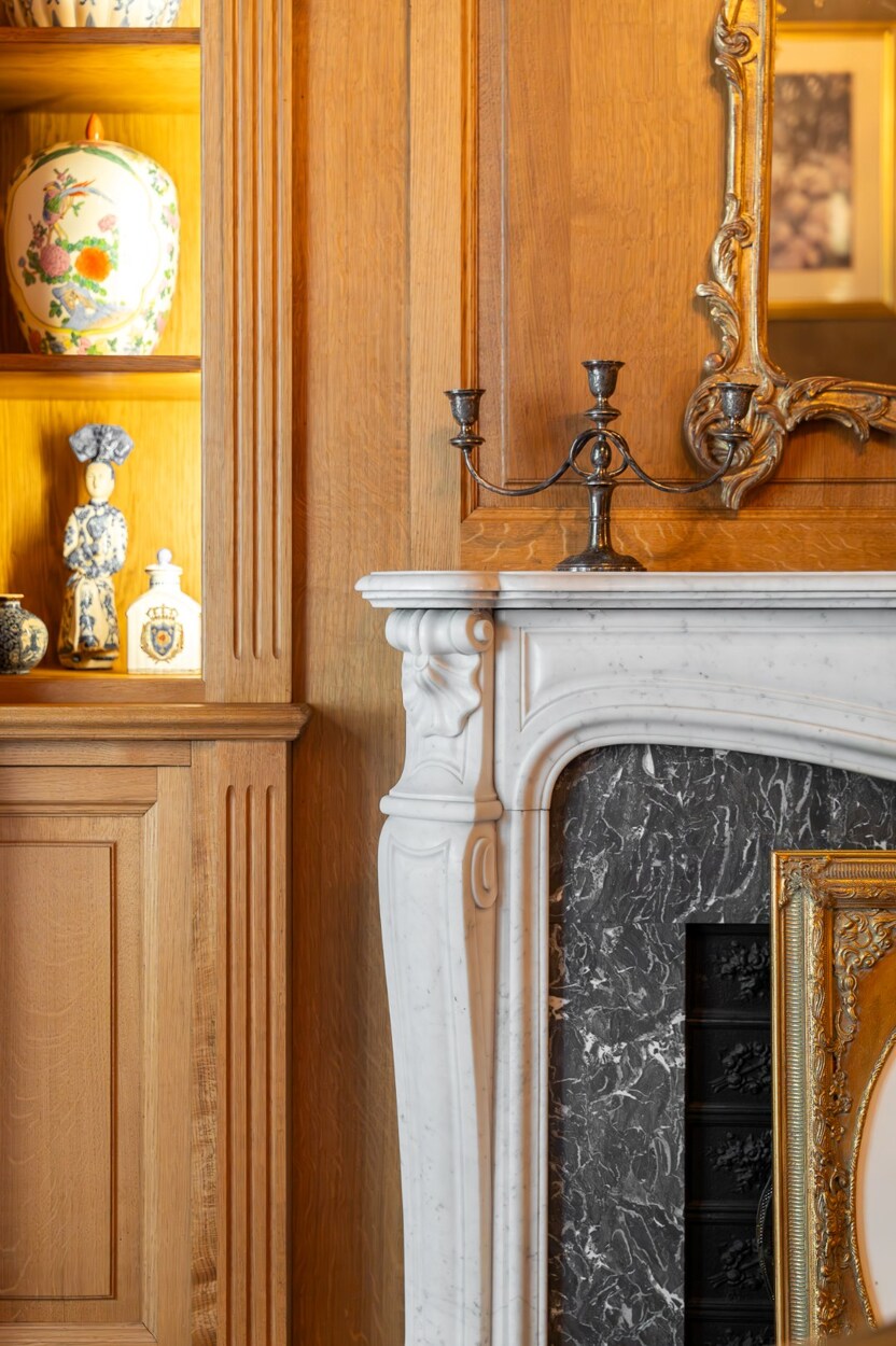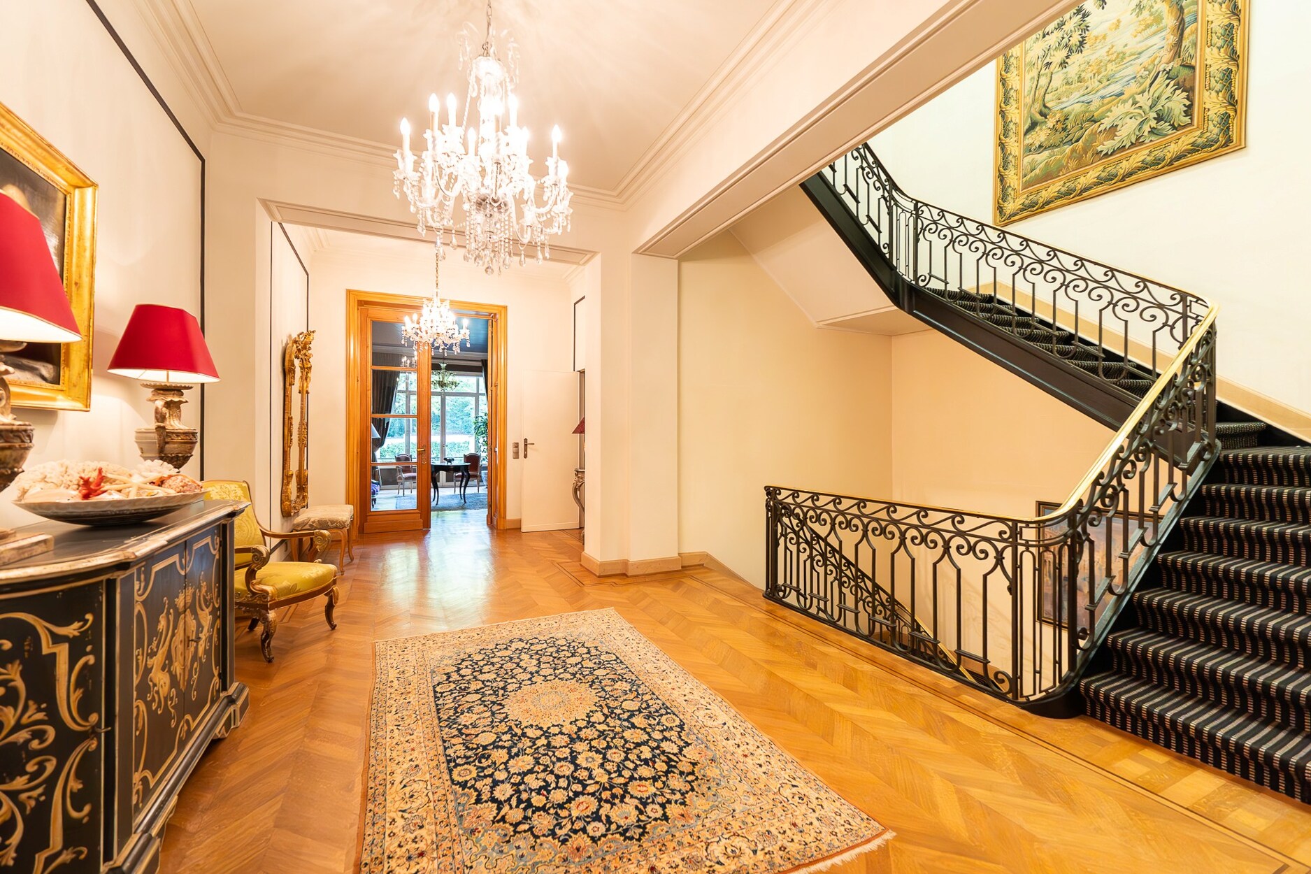Op de eerste verdieping liggen drie ruime en-suite kamers: een centrale hal, een lichte salon met toegang tot een terras met zicht op de tuin en een tweede, meer intieme salon met bibliotheek, houten lambriseringen en open haarden.
