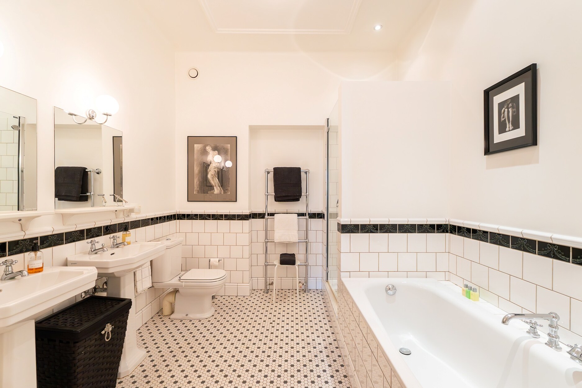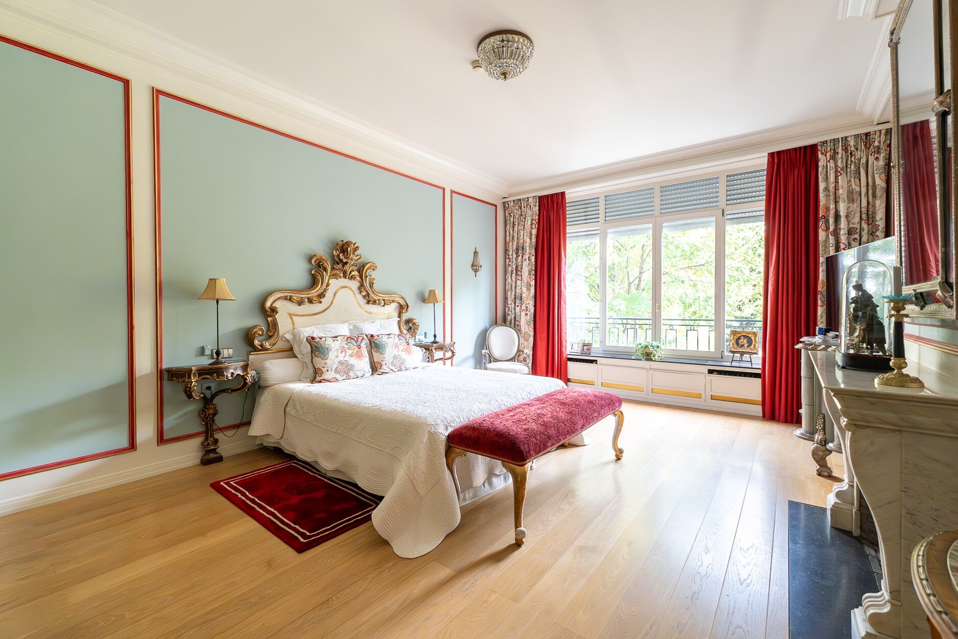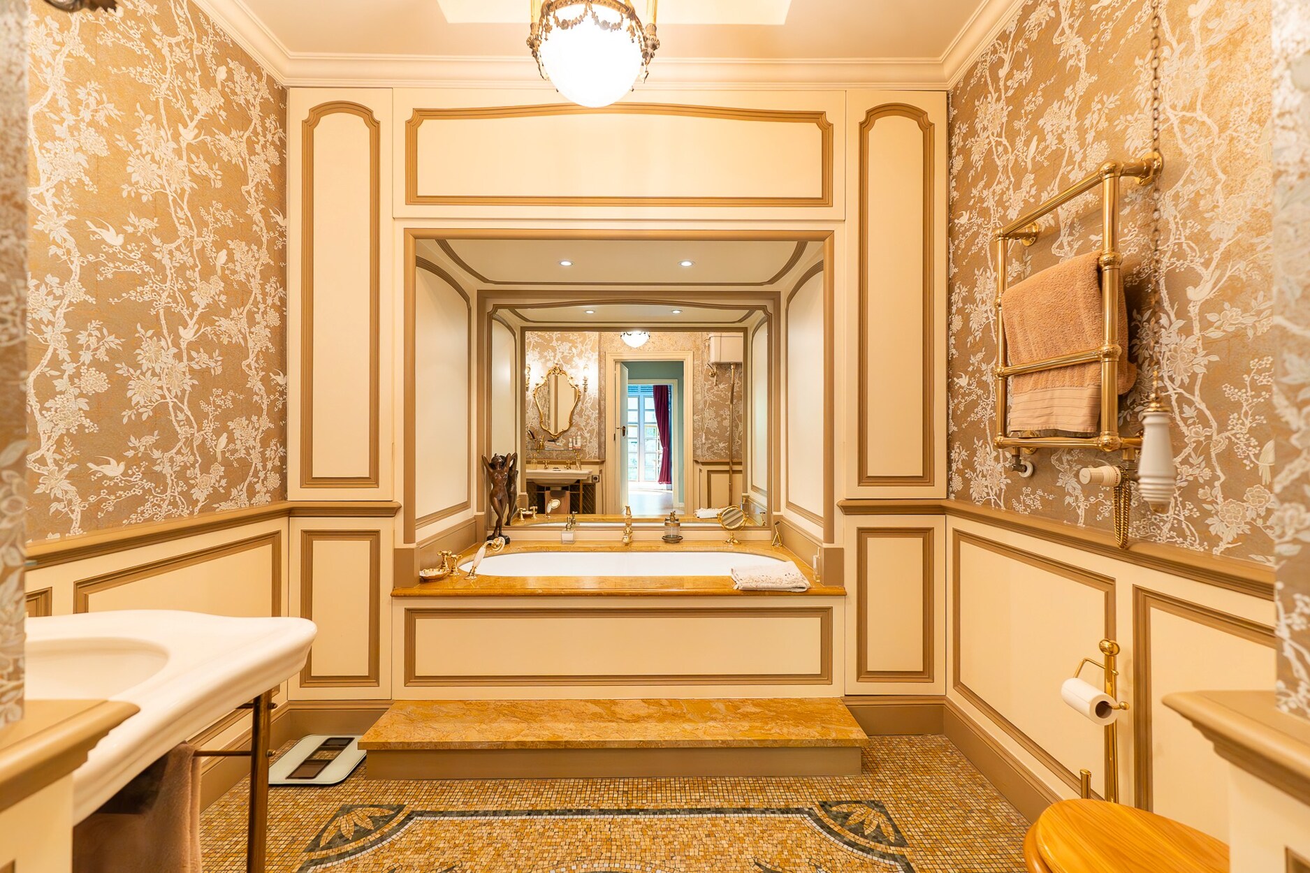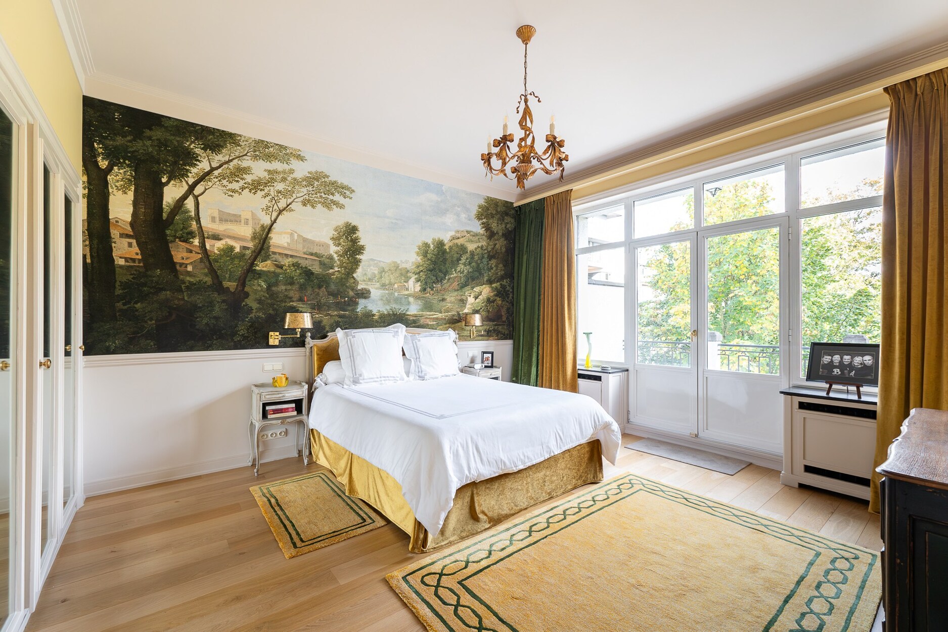 Op de eerste verdieping liggen drie ruime en-suite kamers: een centrale hal, een lichte salon met toegang tot een terras met zicht op de tuin en een tweede, meer intieme salon met bibliotheek, houten lambriseringen en open haarden.