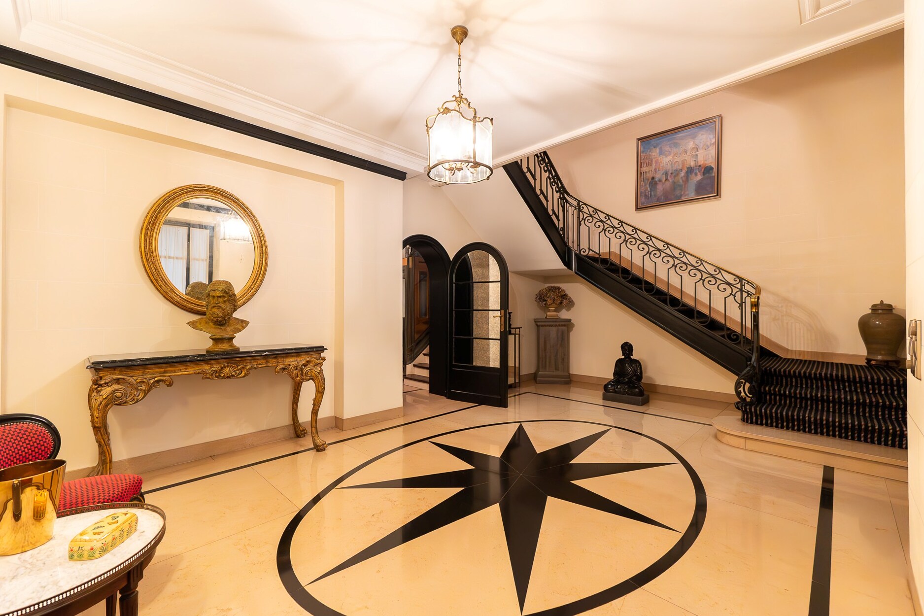 De begane grond beschikt over een royale inkomhal in marmer met sierlijke moulures die leiden naar een imposante ontvangsthal. Aan de straatzijde bevindt zich een eetkamer of kantoorruimte met bow-window en houten lambriseringen. Een opmerkelijke hoofdtrap bedient de eerste twee verdiepingen, aangevuld met een secundaire trap en een lift die de kelder met de derde verdieping verbindt. Aan de tuinzijde bevinden zich een volledig uitgeruste keuken en een eetkamer met directe toegang tot het terras en de tuin.